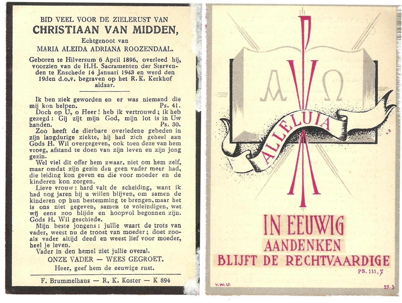 MIDDEN, van, Christiaan, geboren op 06-04-1896 te Hilversum, overleden op 14-1-1943 te Enschede op 46-jarige leeftijd, begraven op 19-1-1943 te Enschede.
