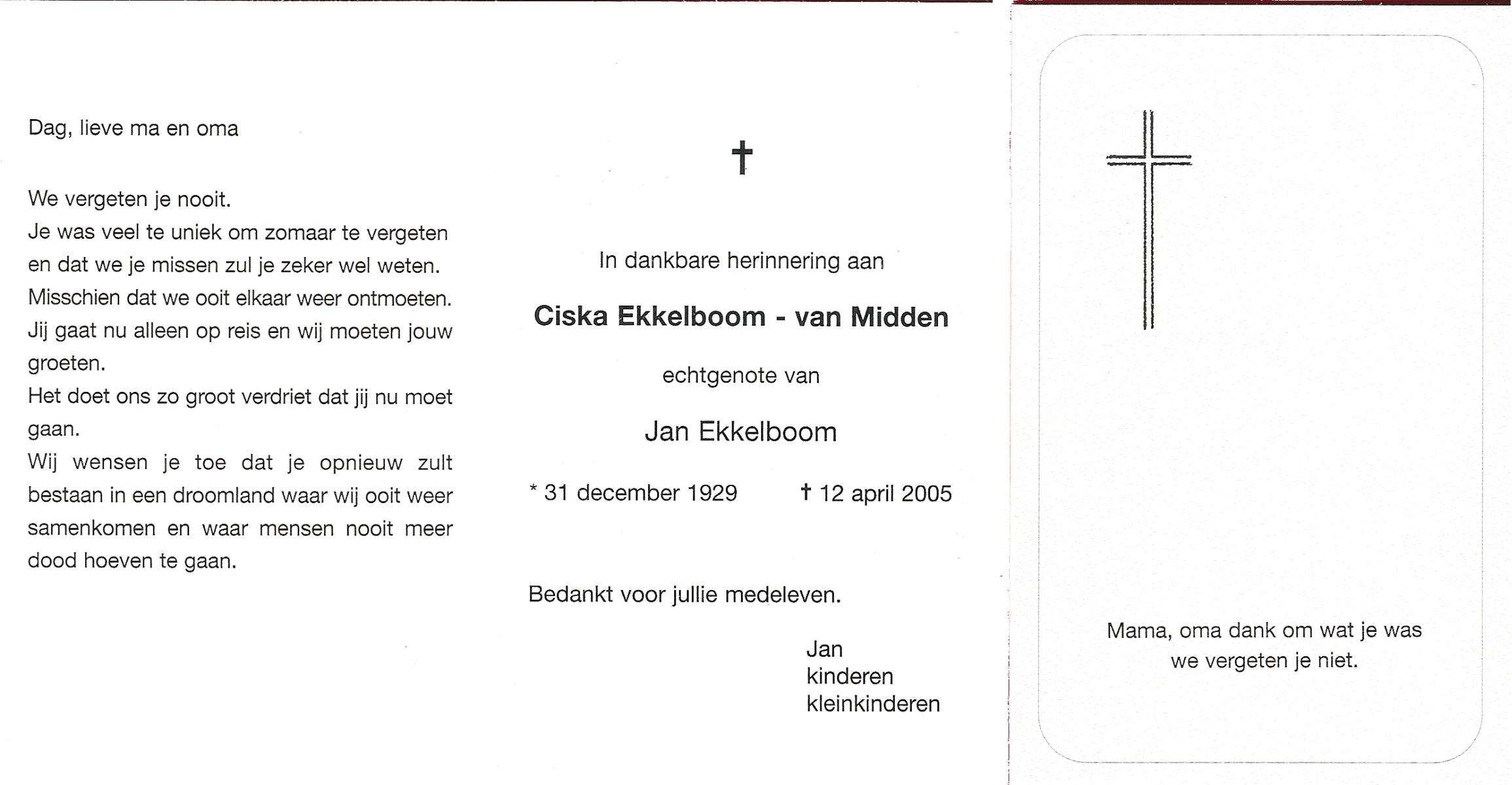 MIDDEN, van, Ciska, geboren op 31-12-1929, overleden op 12-4-2005 op 75-jarige leeftijd.