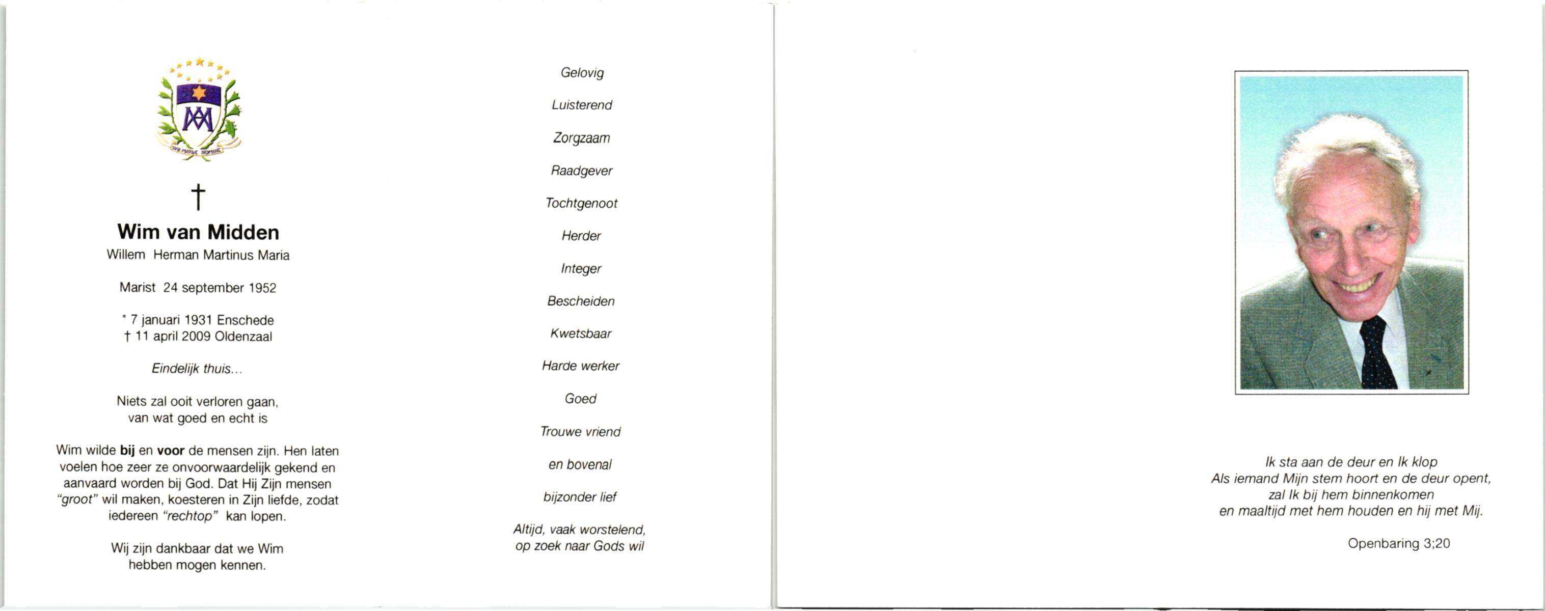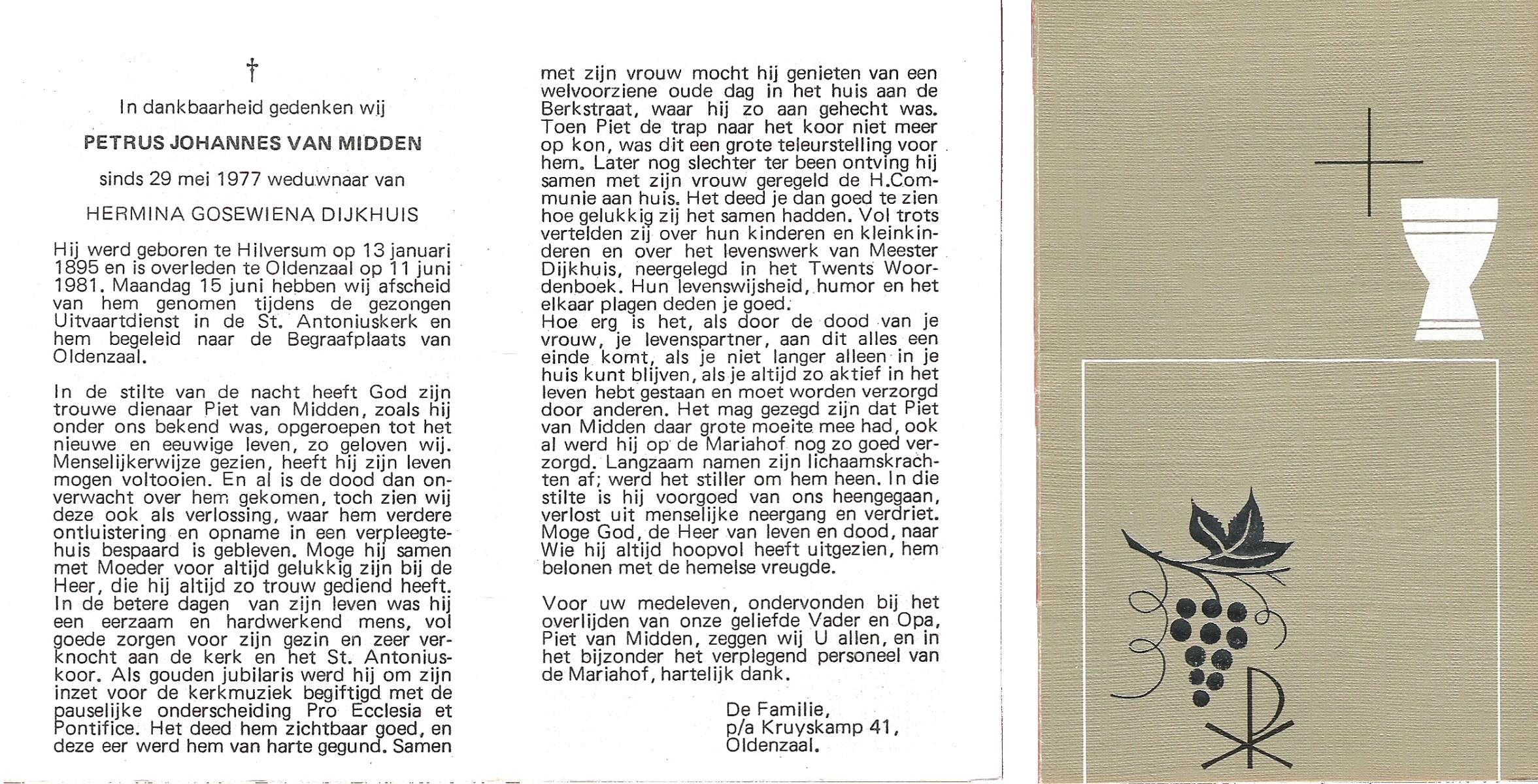 MIDDEN, van, Petrus Johannes, geboren op 13-01-1895 te Hilversum, overleden op 11-6-1981 te Oldenzaal op 86-jarige leeftijd, begraven op 15-6-1981 te Oldenzaal.