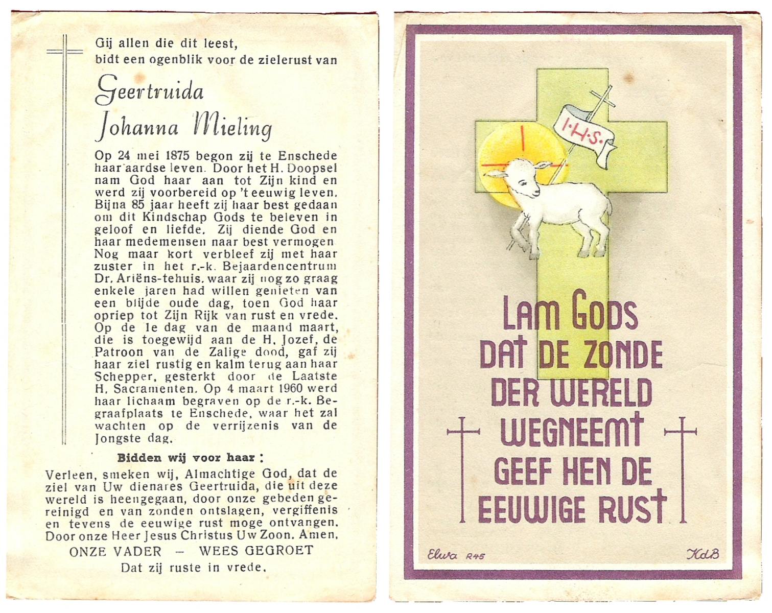 MIELING, Geertruida Johanna, geboren op 24-05-1875 te Enschede, overleden op 1-3-1960 te Glanerbrug op 84-jarige leeftijd, begraven op 4-3-1960 te Enschede.
