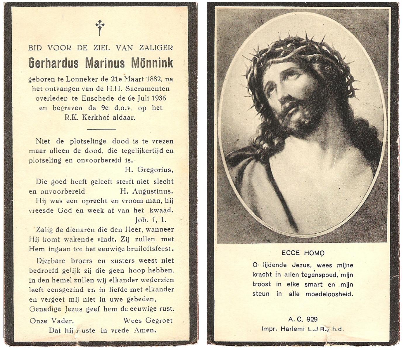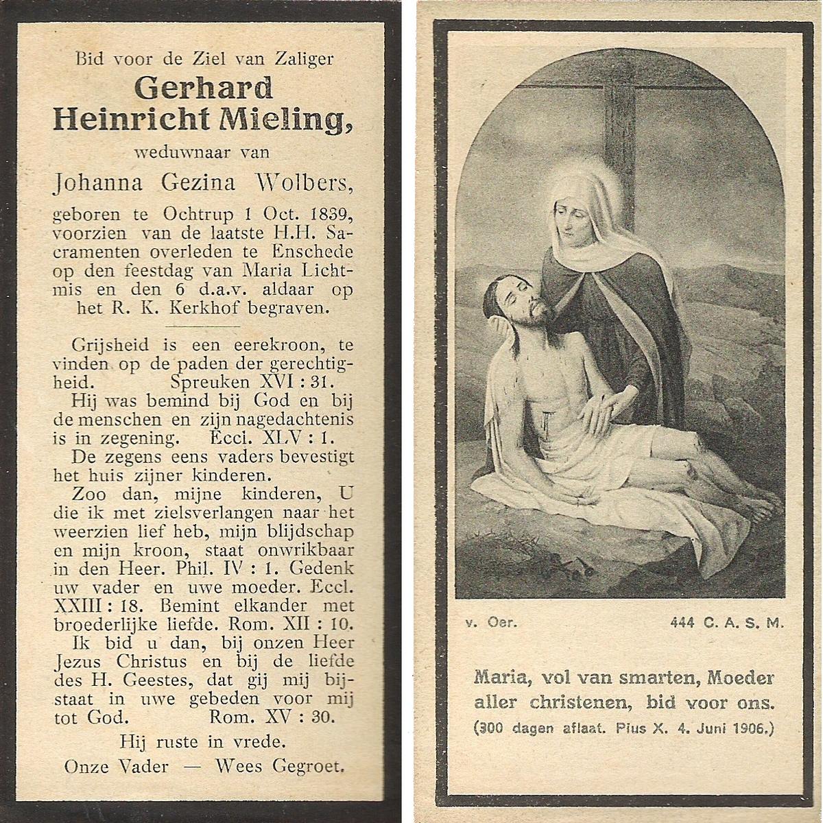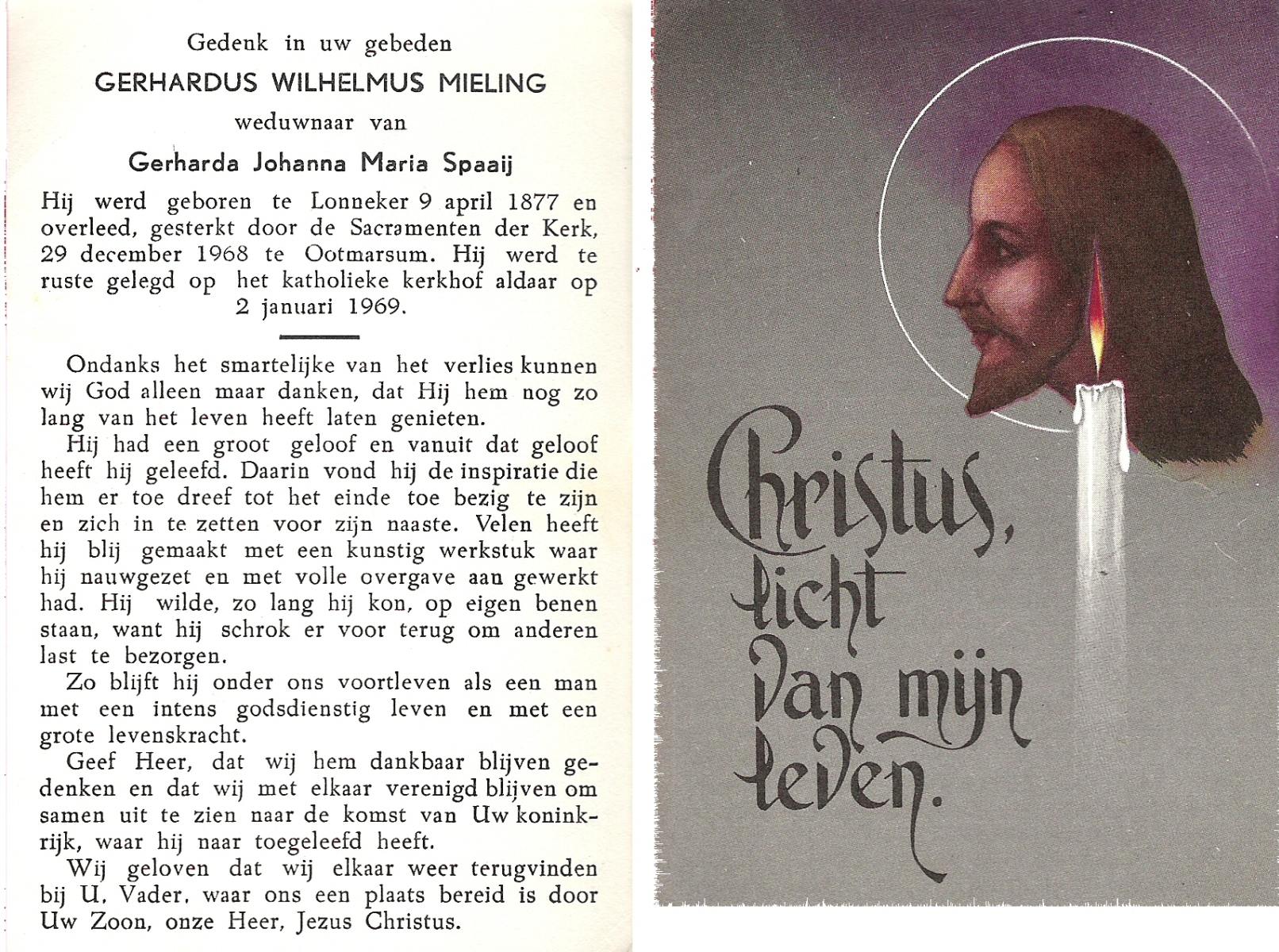 MIELING, Gerhardus Wilhelmus, geboren op 09-04-1877 te Lonneker, overleden op 29-12-1968 te Ootmarsum op 91-jarige leeftijd, begraven op 2-1-1969 te Ootmarsum.
