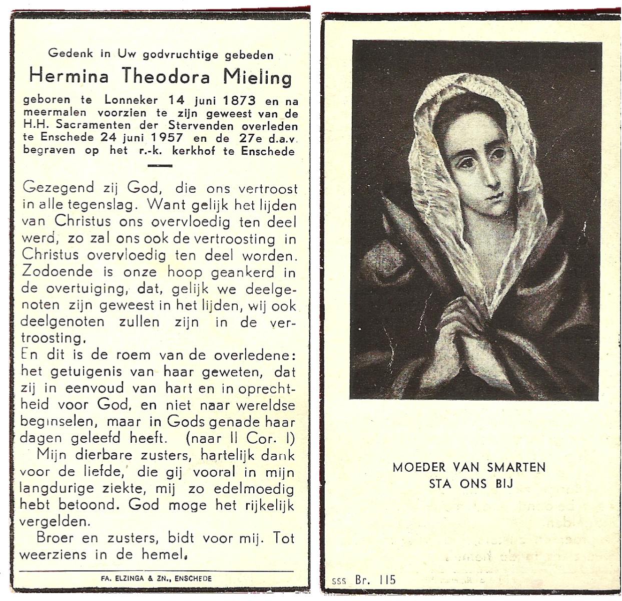 MIELING, Hermina Theodora, geboren op 14-06-1873 te Lonneker, overleden op 24-6-1957 te Enschede op 84-jarige leeftijd, begraven op 27-6-1957 te Enschede.