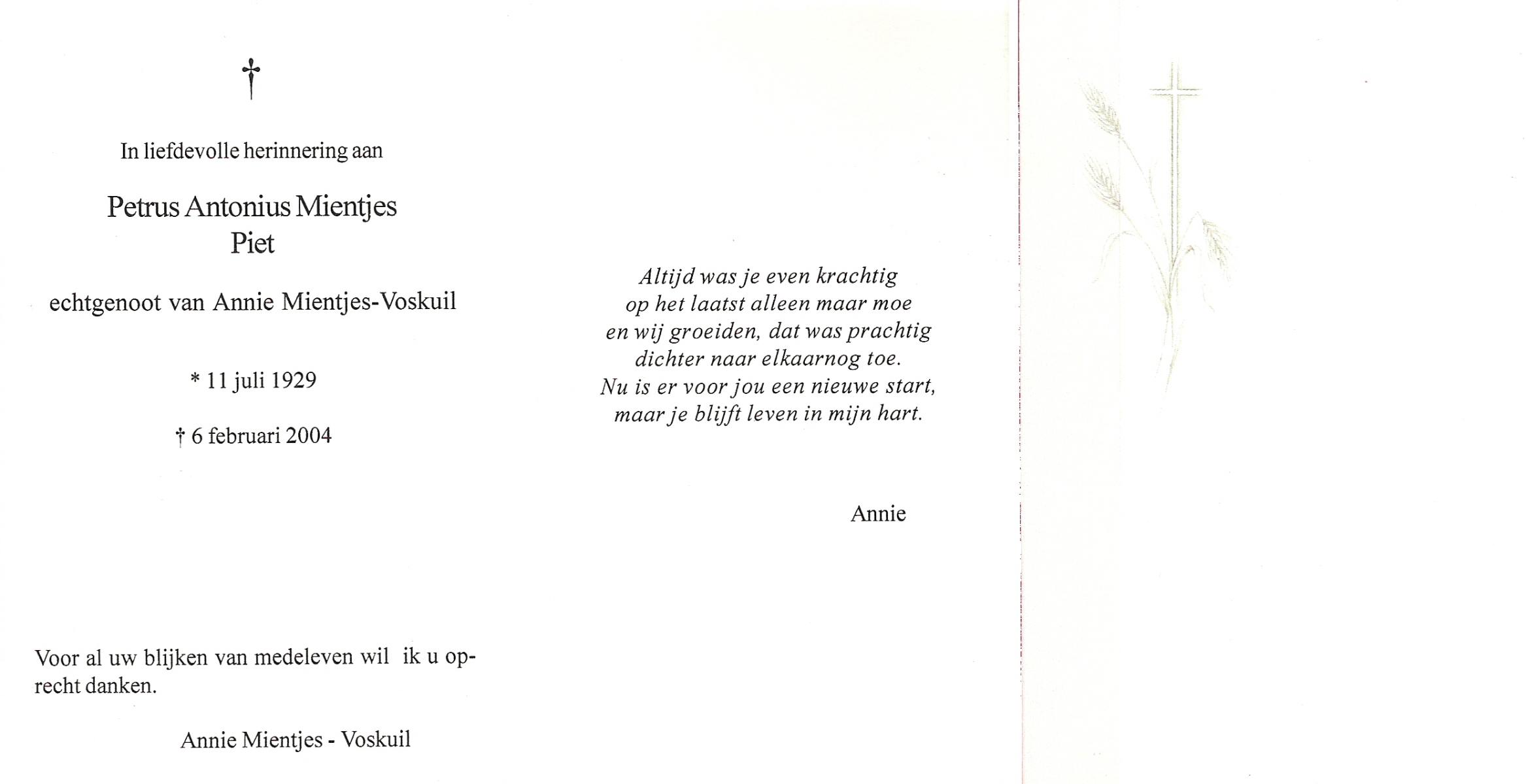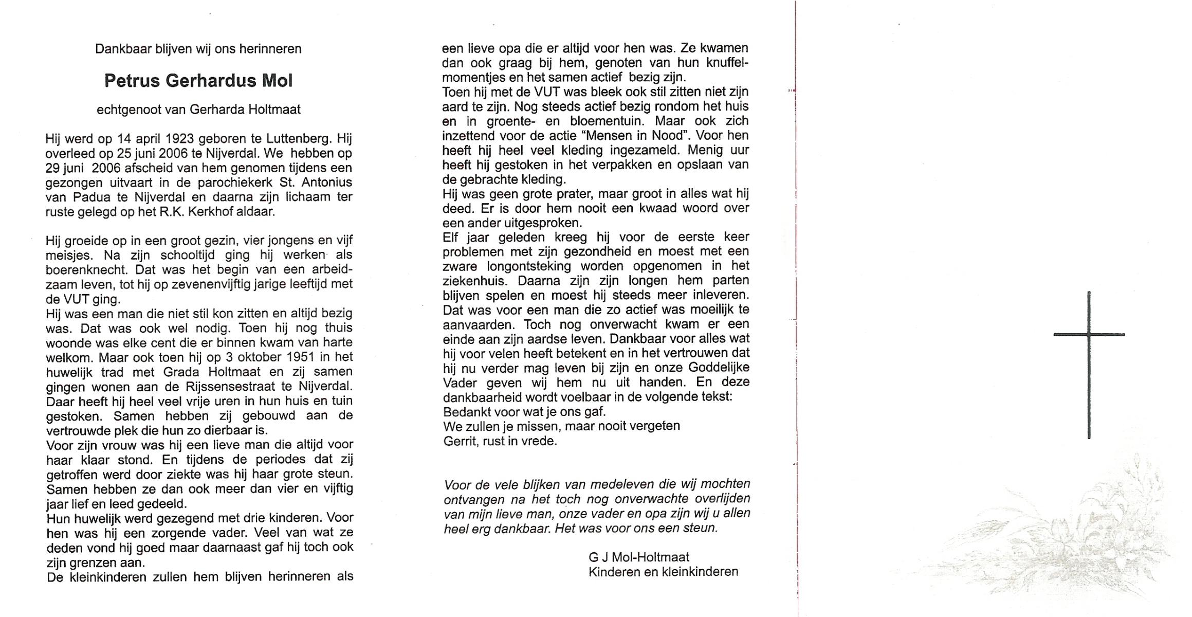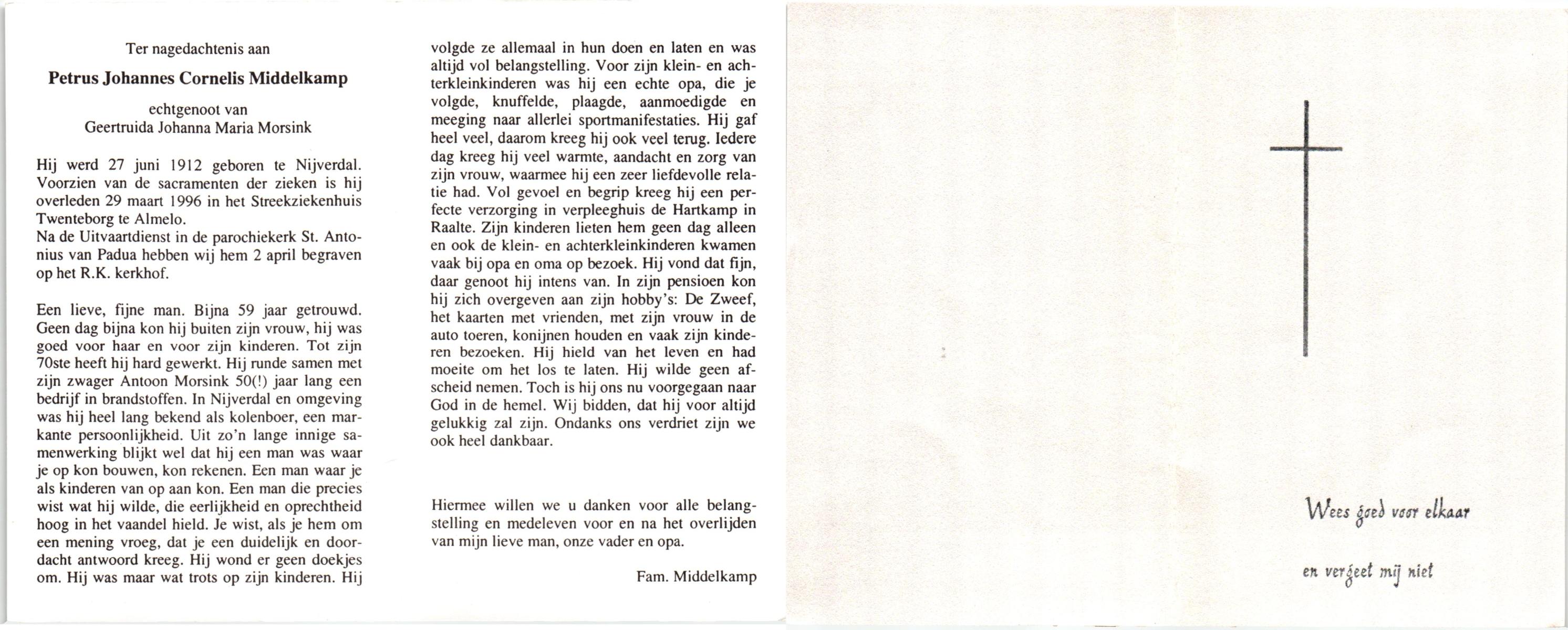 MIDDELKAMP, Petrus Johannes Cornelis, geboren op 27-6-1912 te Hellendoorn, Nijverdal, overleden op 29-3-1996 te Almelo, ziekenhuis op 83-jarige leeftijd, begraven op 2-4-1996 te Hellendoorn, Nijverdal, rk.