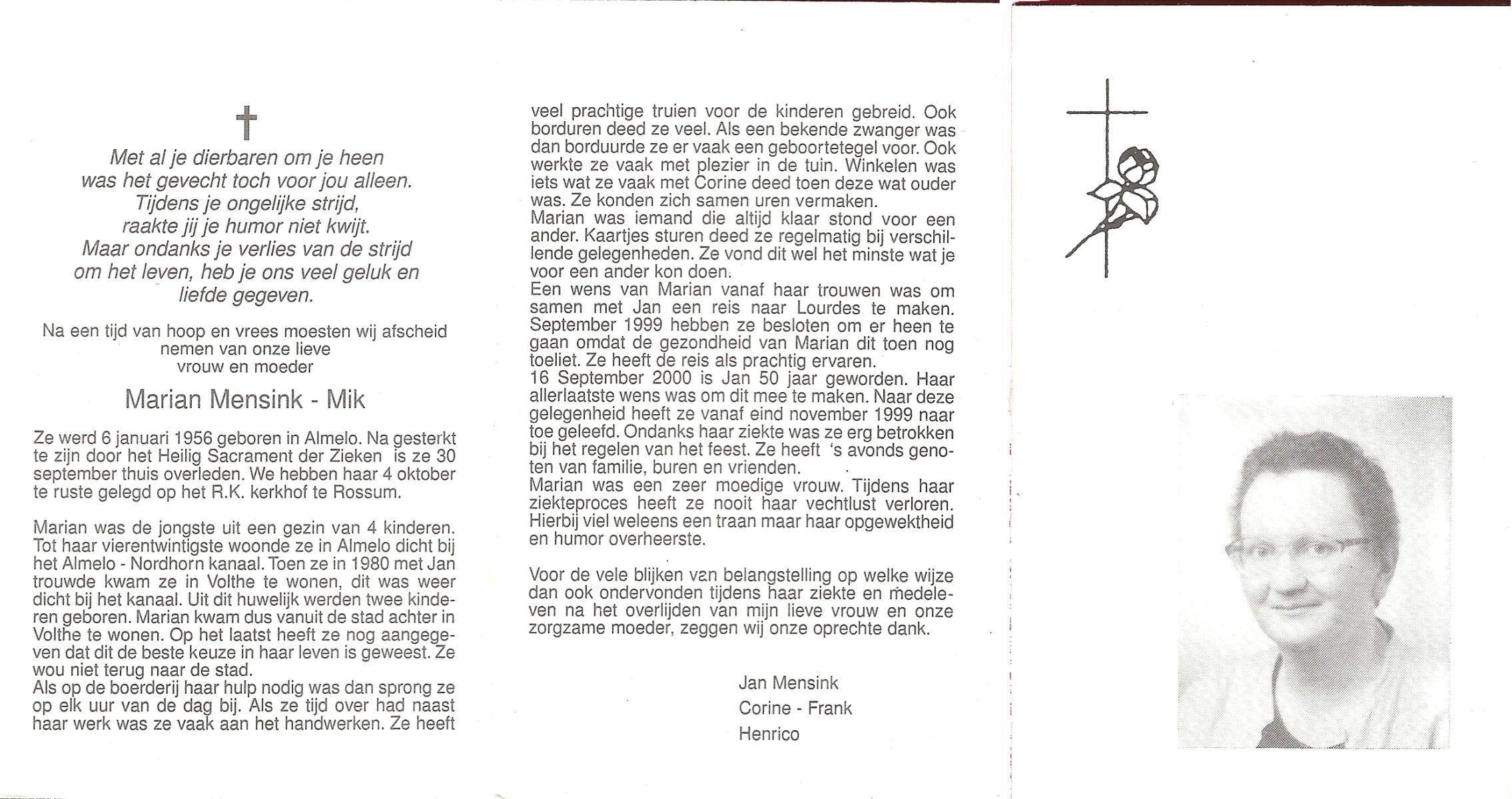 MIK, Marian, geboren op 6-1-1956 te Almelo, overleden op 30-9-2000 op 44-jarige leeftijd, begraven op 4-10-2000 te Rossum R.K.kerkhof.