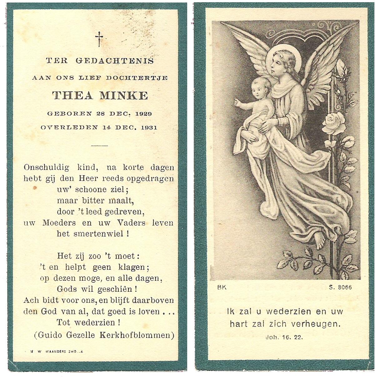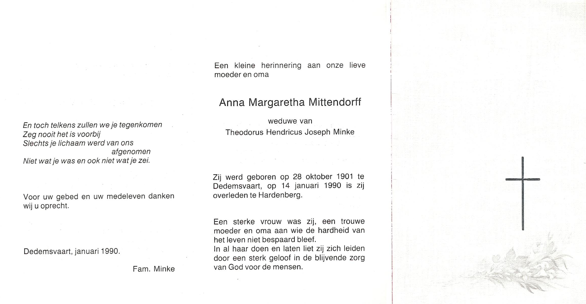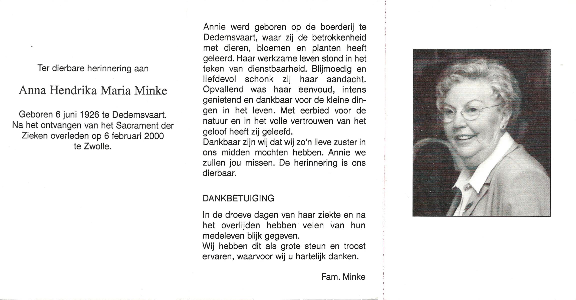 MINKE, Anna Hendrika Maria, geboren op 6-6-1926 te Dedemsvaart, overleden op 6-2-2000 te Zwolle op 73-jarige leeftijd.