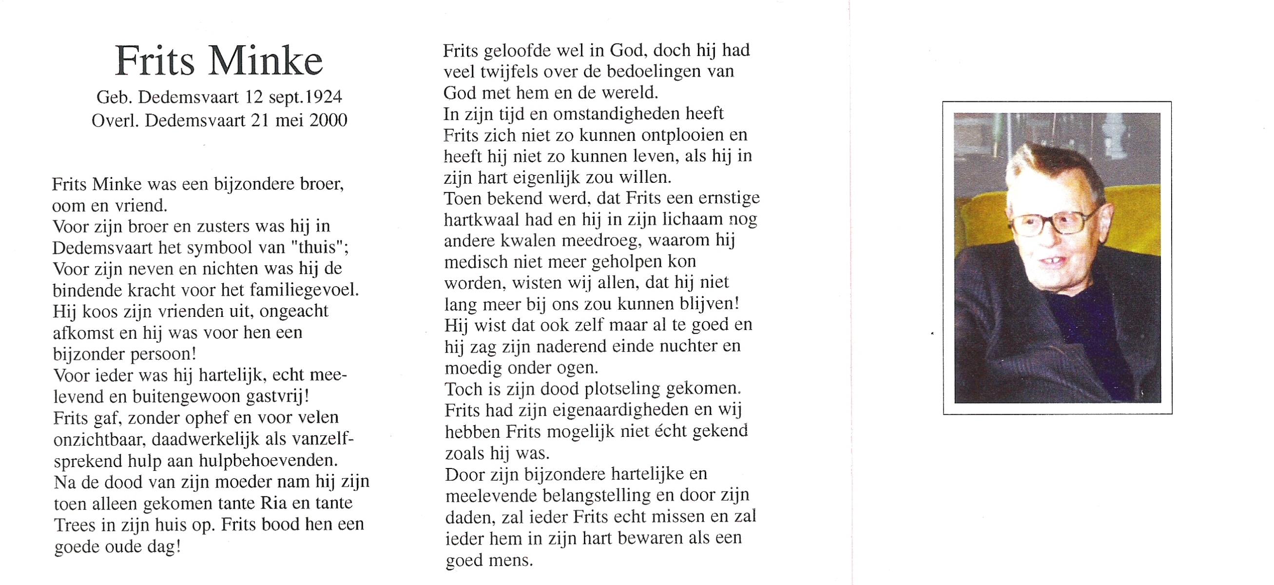 MINKE, Frits, geboren op 12-9-1924 te Dedemsvaart, overleden op 21-5-2000 te Dedemsvaart op 75-jarige leeftijd.