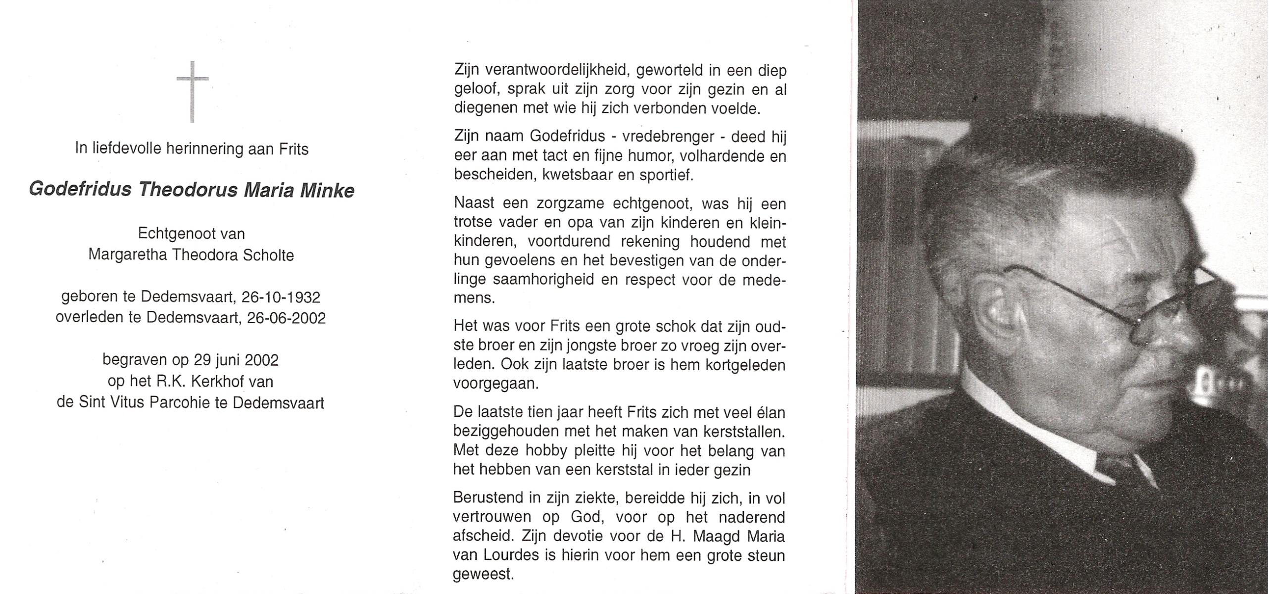 MINKE, Godefridus Theodorus Maria, geboren op 26-10-1932 te Dedemsvaart, overleden op 26-6-2002 te Dedemsvaart op 69-jarige leeftijd, begraven op 29-6-2002 te Dedemsvaart.