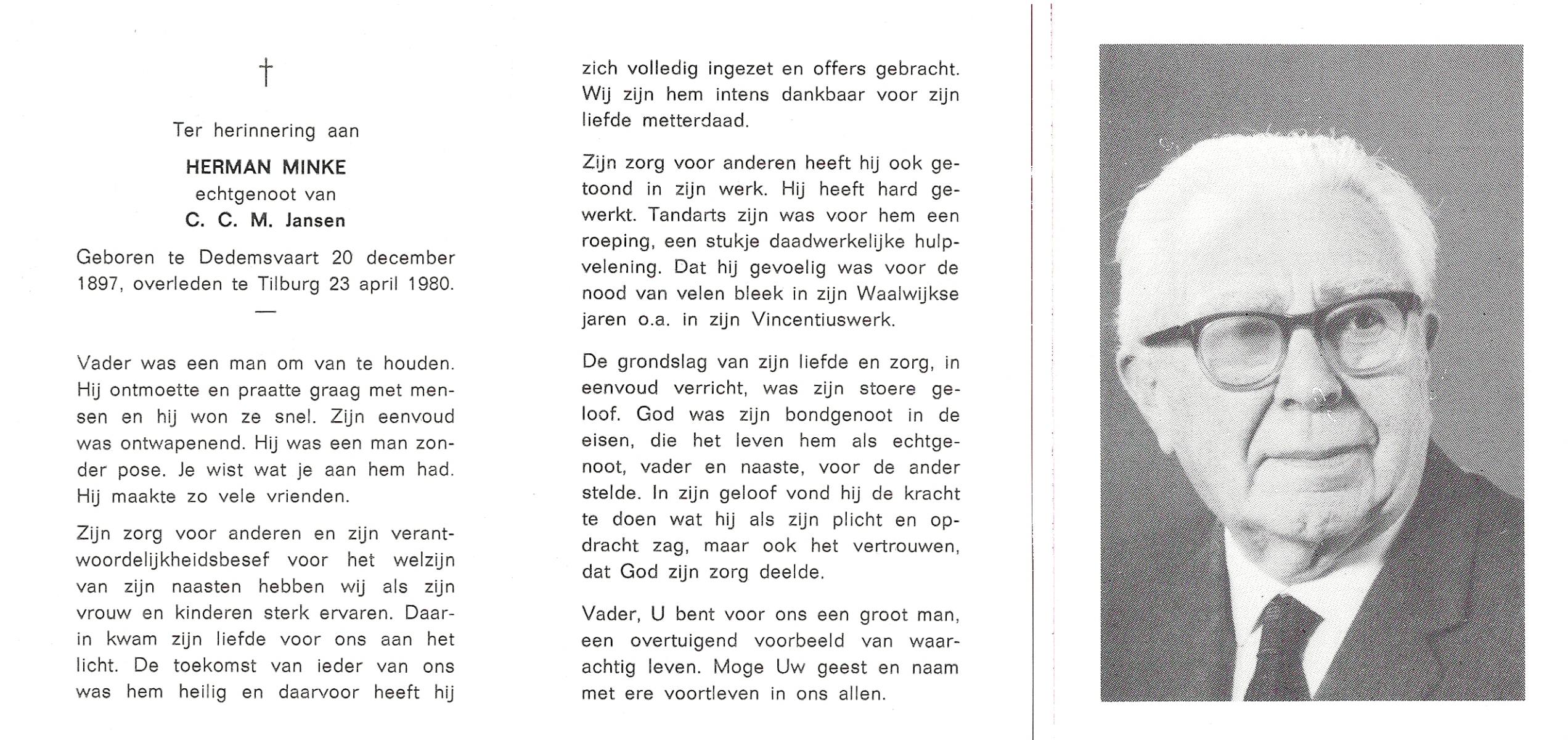 MINKE, Herman, geboren op 20-12-1897 te Dedemsvaart, overleden op 23-4-1980 te Tilburg op 82-jarige leeftijd.