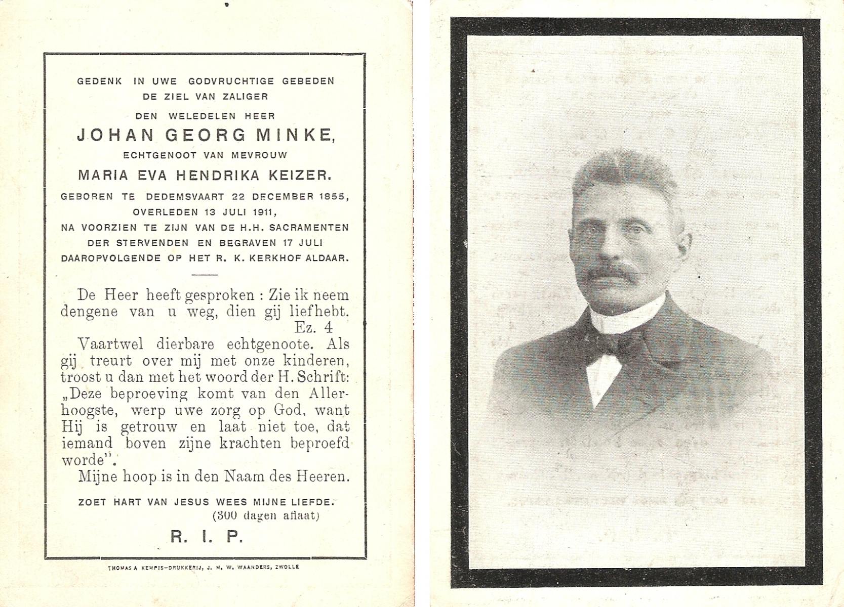 MINKE, Johan Georg, geboren op 22-12-1855 te Dedemsvaart, overleden op 13-7-1911 op 55-jarige leeftijd, begraven op 17-7-1911 te Dedemsvaart.