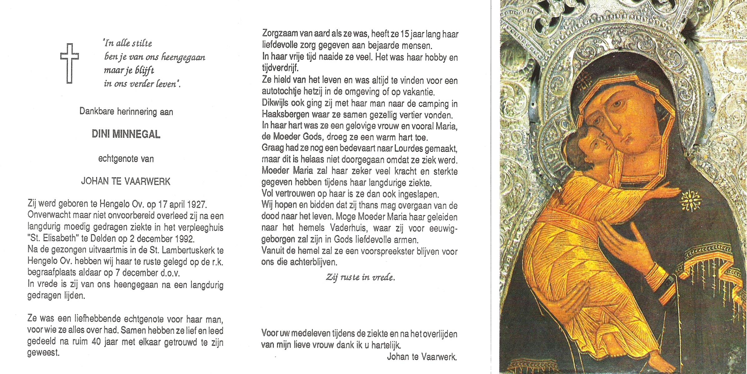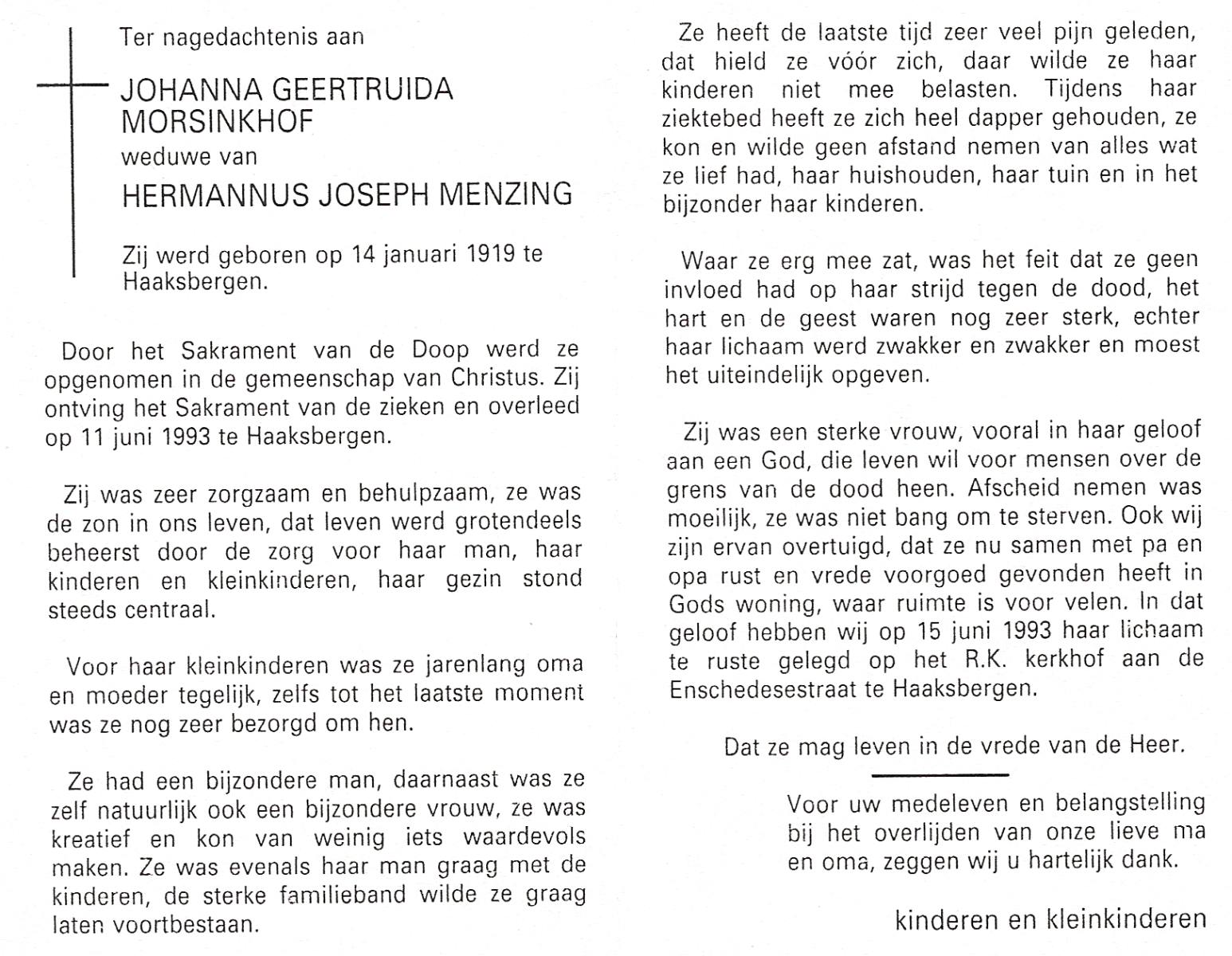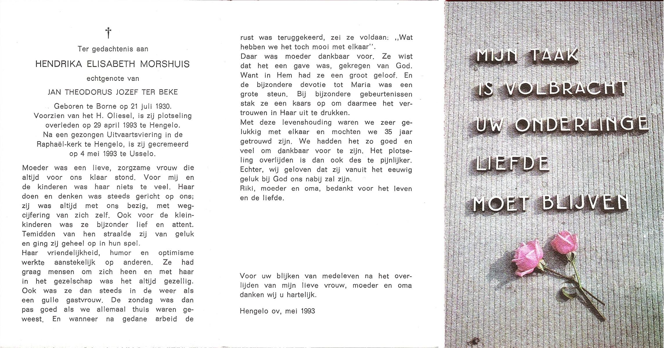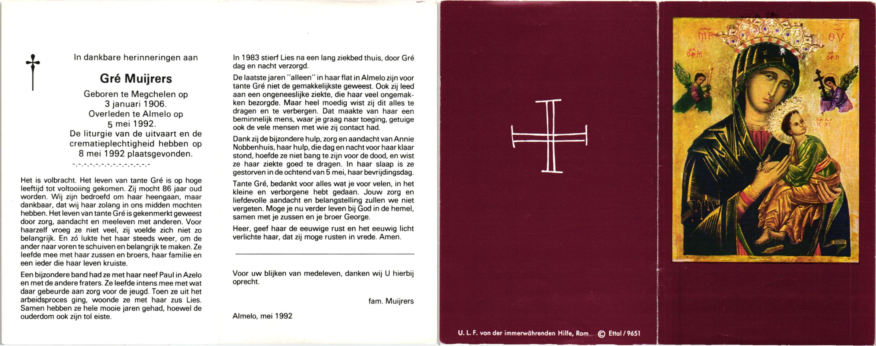 MEURIS, Engelina Johanna, geboren op 5-10-1929 te Borne, overleden op 17-9-1992 op 62-jarige leeftijd, begraven op 21-9-1992 te Hengelo (Ov.).