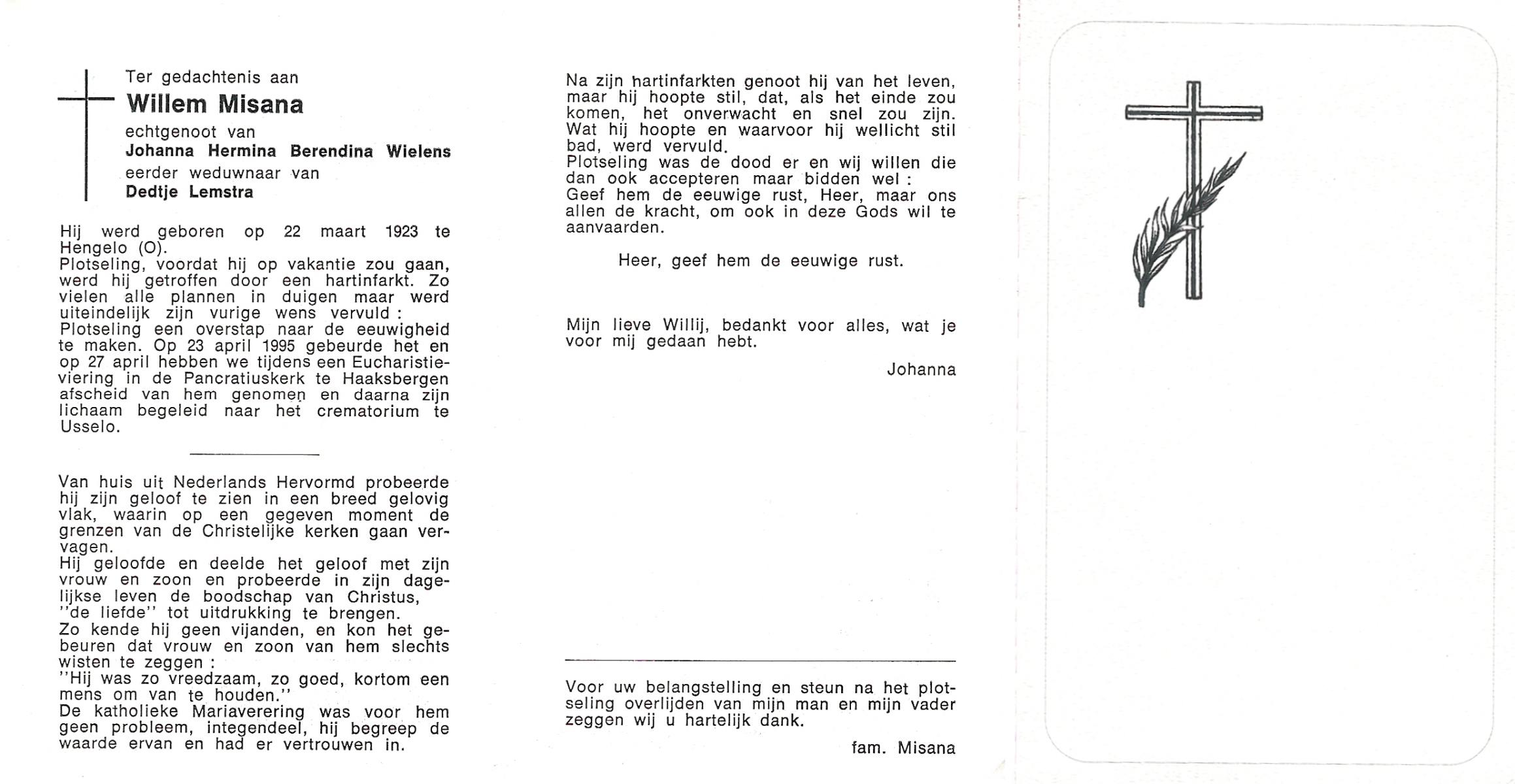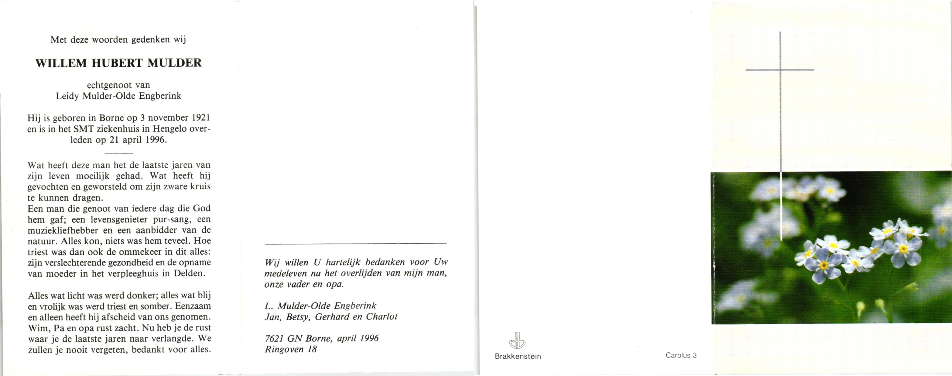 MULDER, , Willem Hubert, geboren op 3-11-1921 te Borne, overleden op 21-4-1996 te Hengelo (O) op 74-jarige leeftijd.