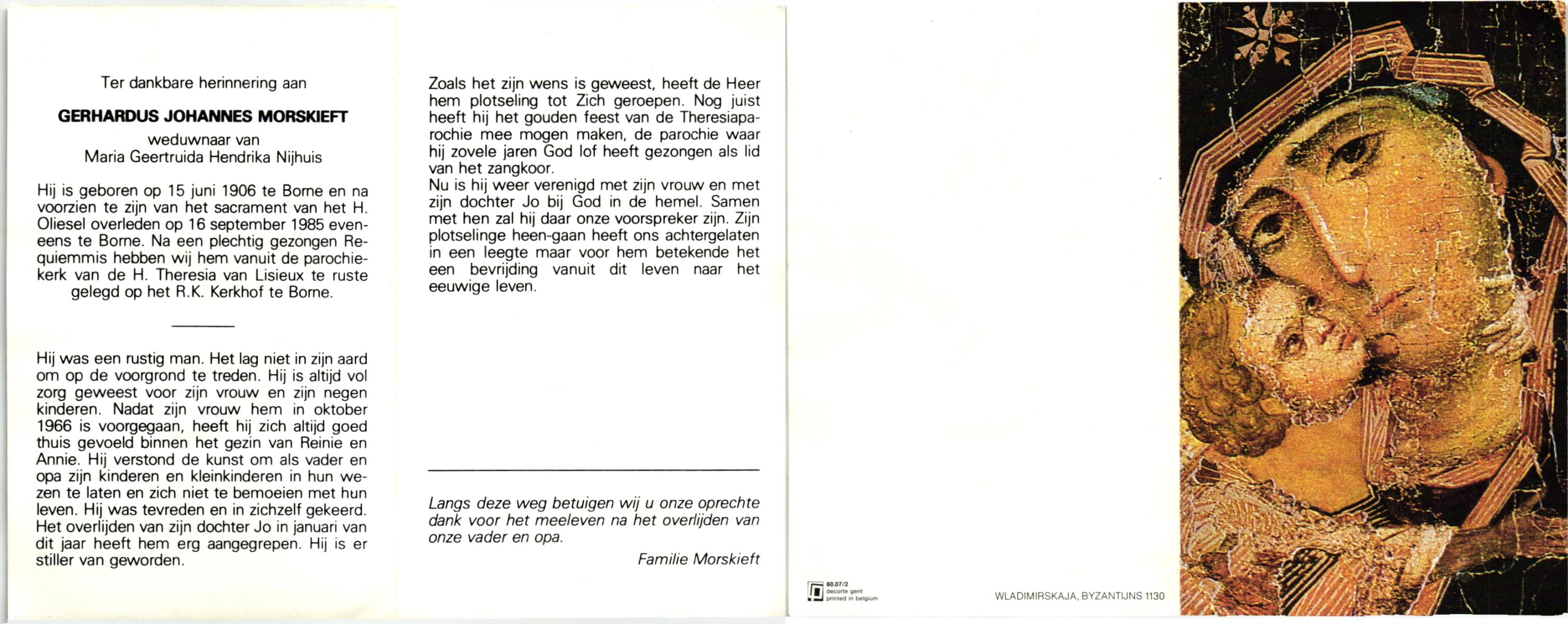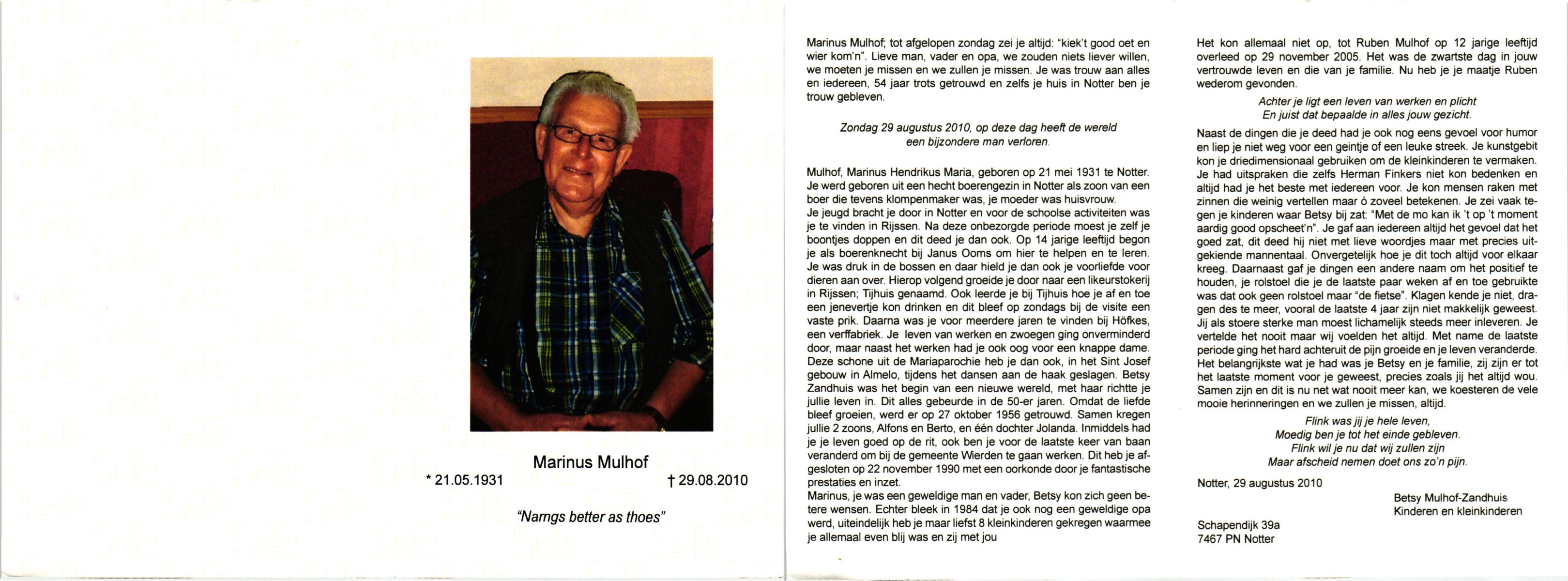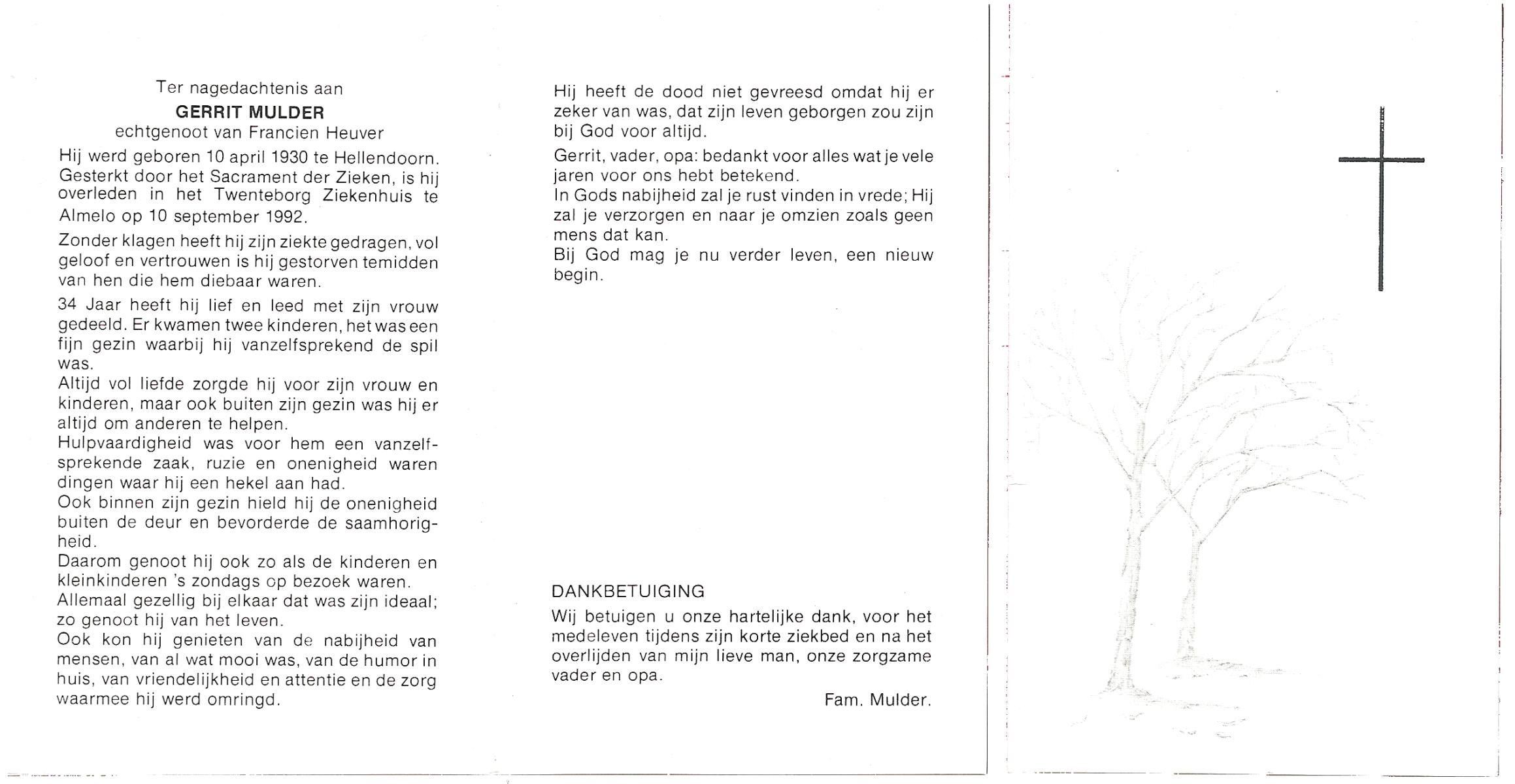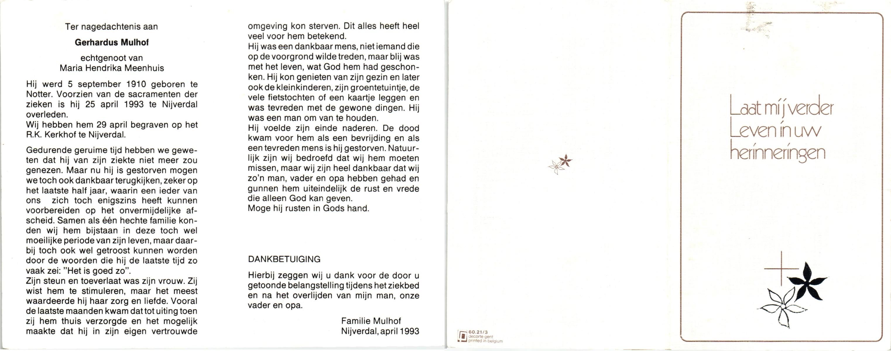 MULHOF, Gerhardus, geboren op 5-9-1910 te Wierden, Notter, overleden op 25-4-1993 te Hellendoorn, Nijverdal op 82-jarige leeftijd, begraven op 29-4-1993 te Hellendoorn, Nijverdal, rk.