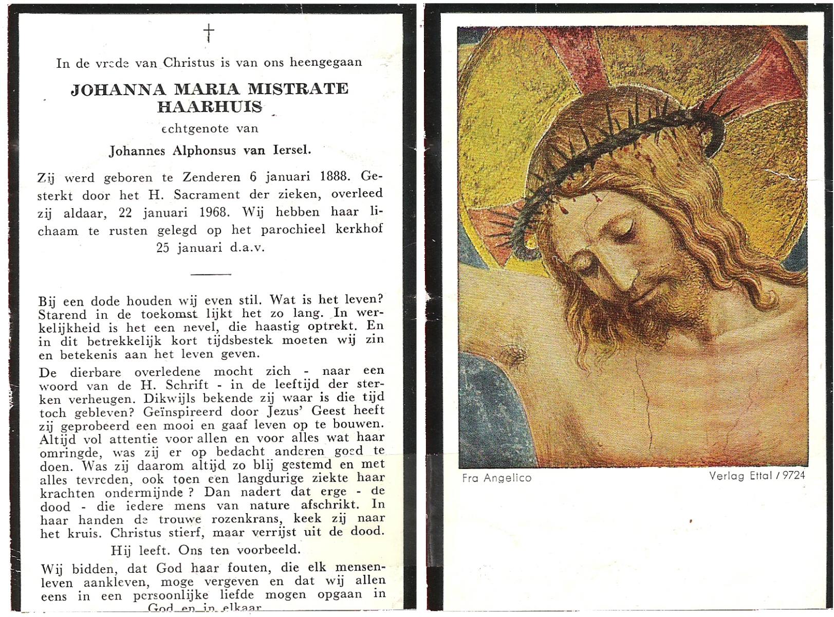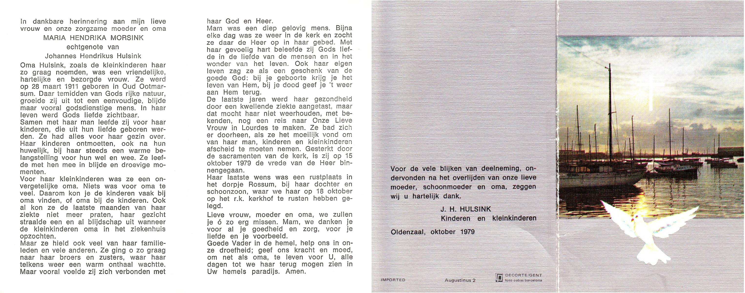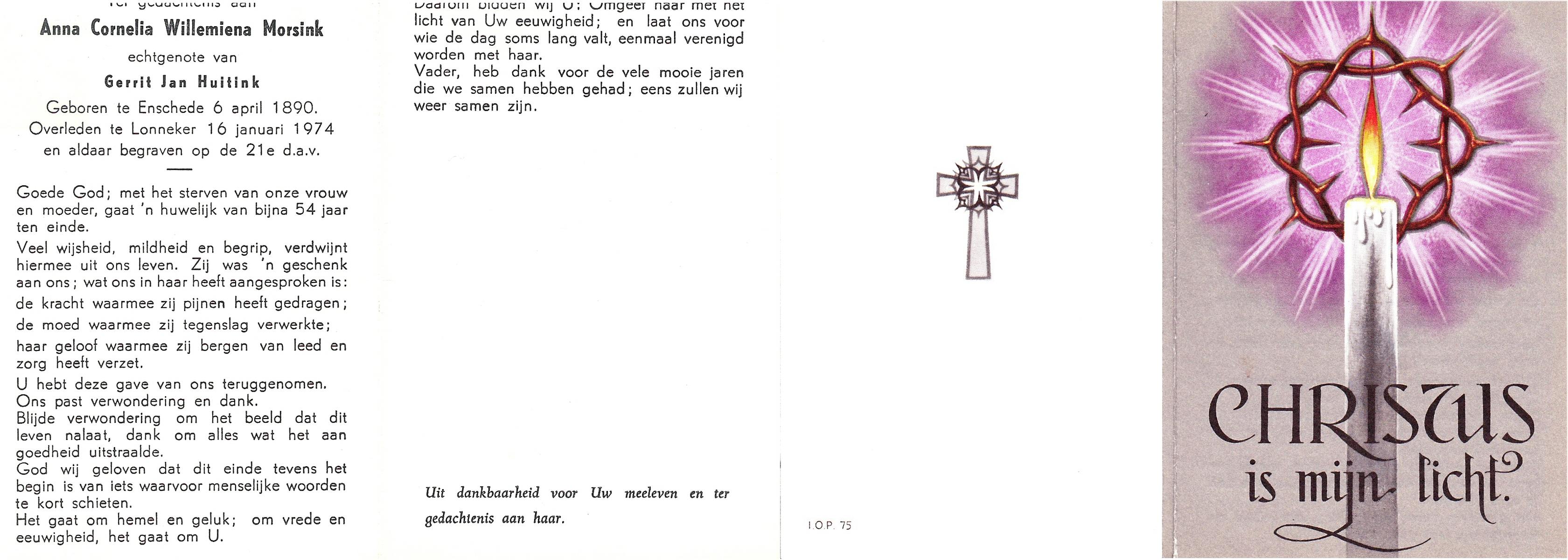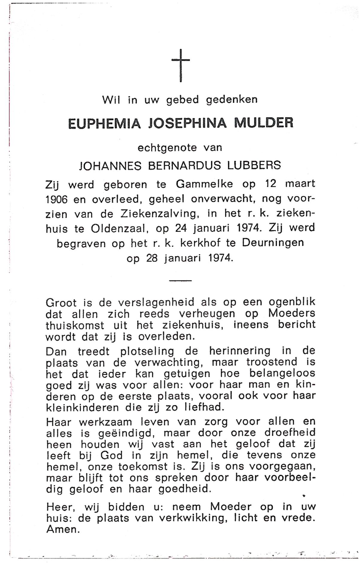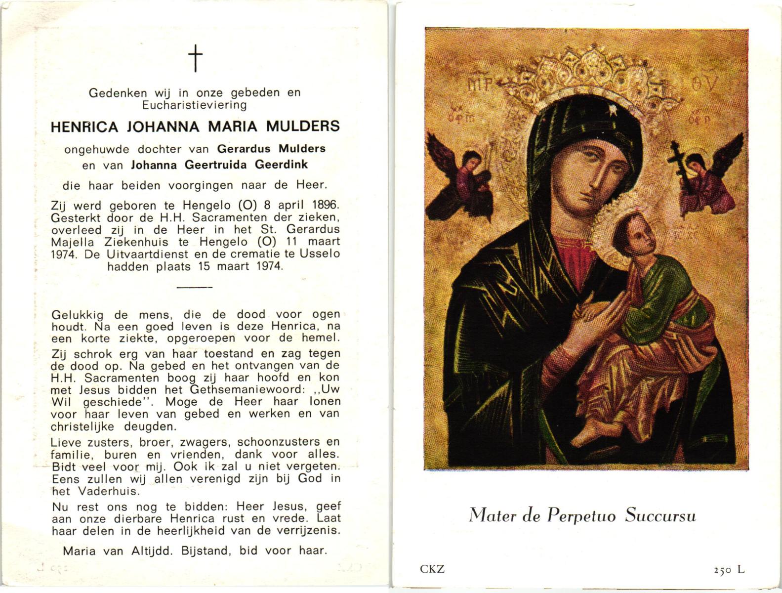 MULDERS, Henrica Johanna Maria, geboren op 08-04-1896 te Hengelo, overleden op 11-3-1974 te Hengelo, ziekenhuis op 77-jarige leeftijd, gecremeerd op 15-3-1974 te Usselo.