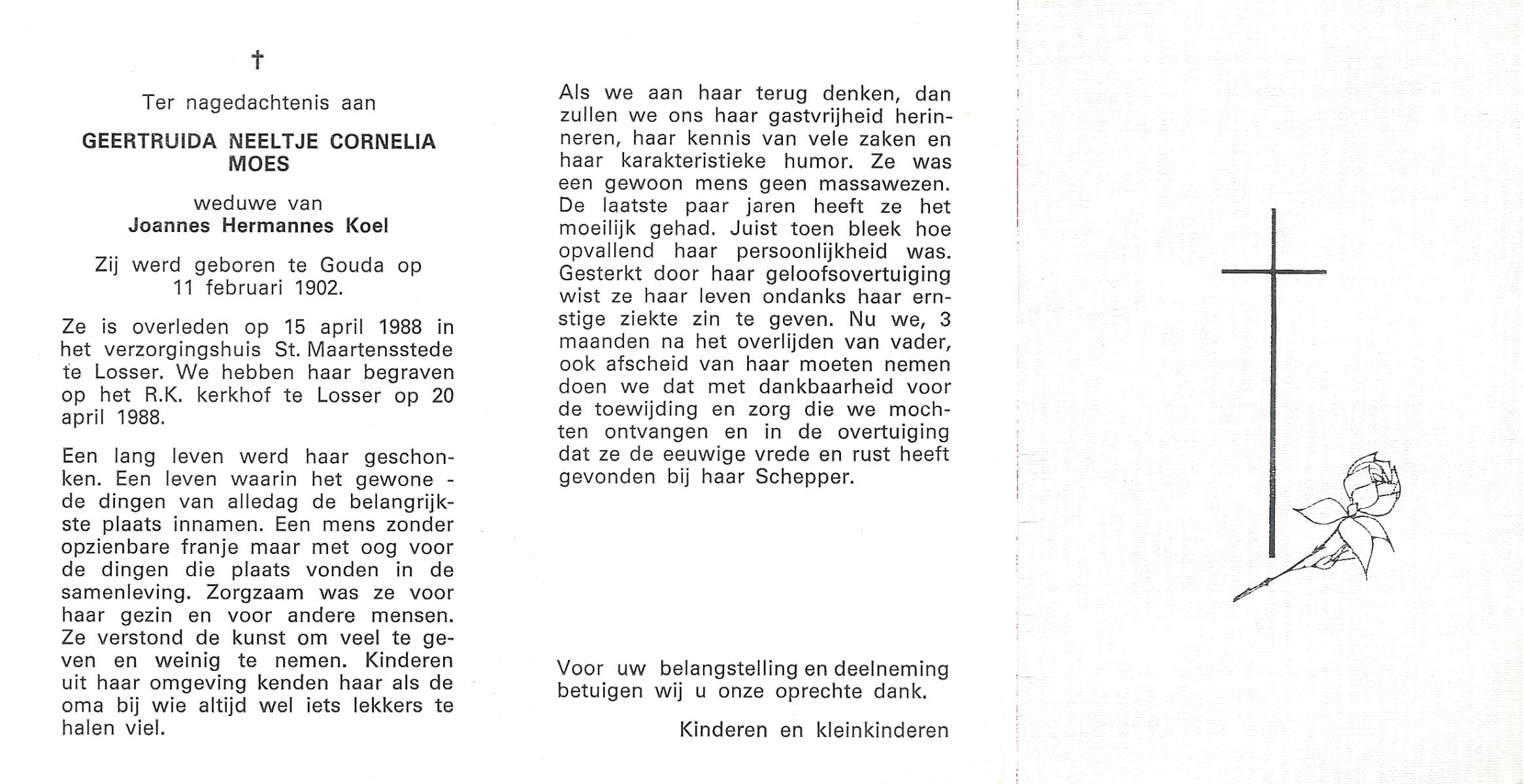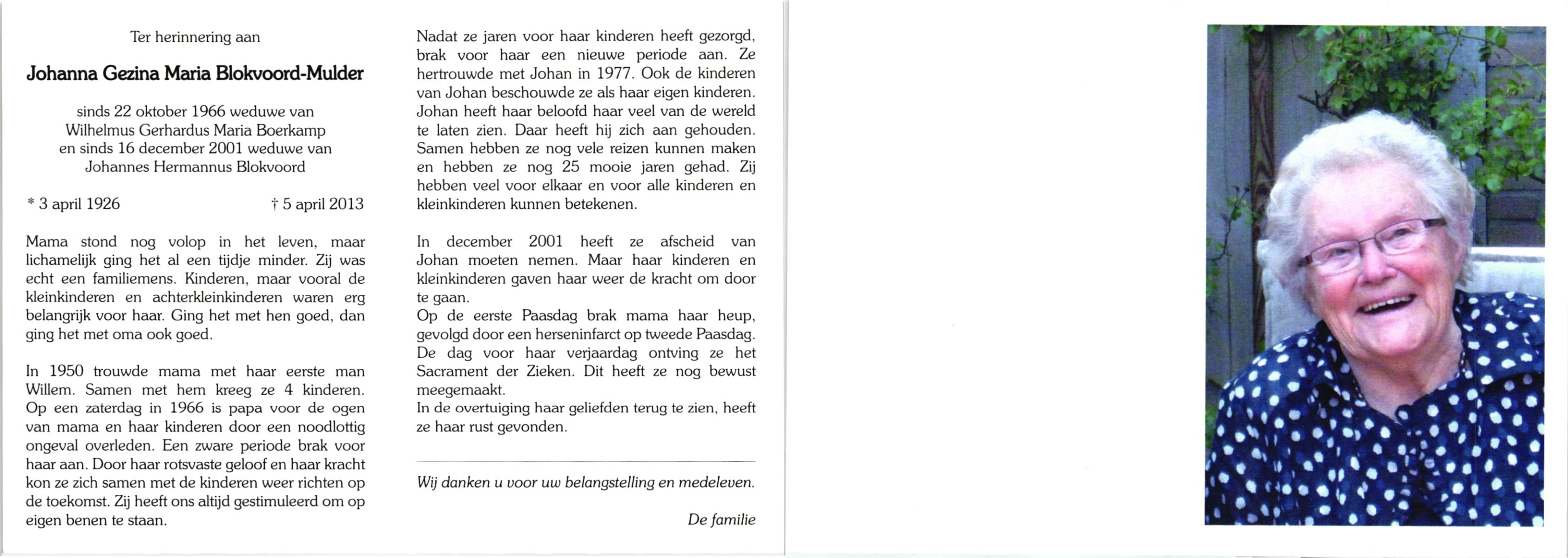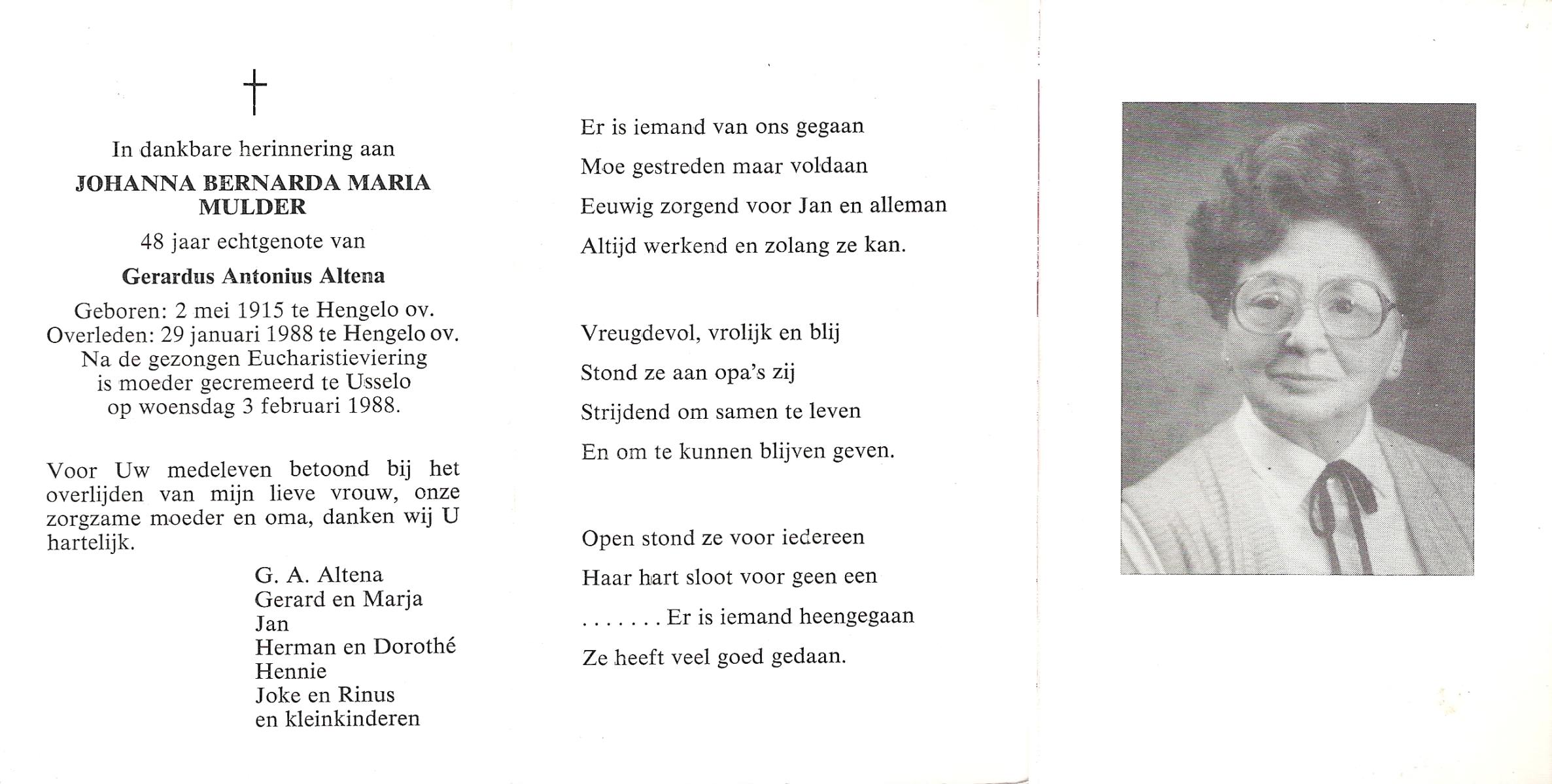 MULDER, Johanna Bernarda Maria, geboren op 2-5-1915 te Hengelo (O), overleden op 29-1-1988 te Hengelo (Ov.) op 72-jarige leeftijd, gecremeerd op 3-2-1988 te Usselo.
