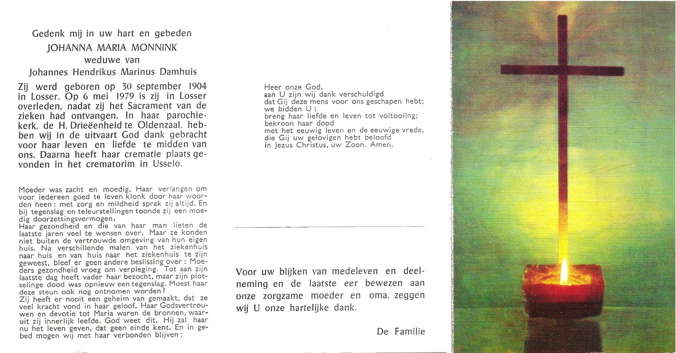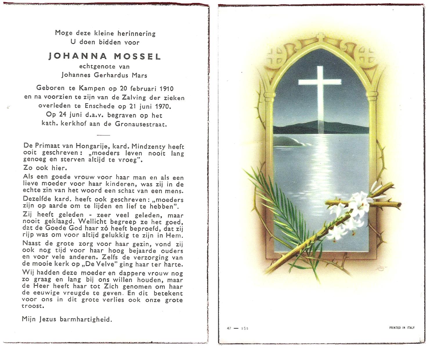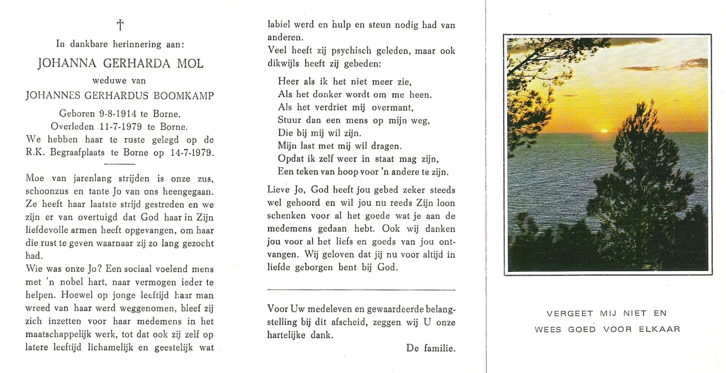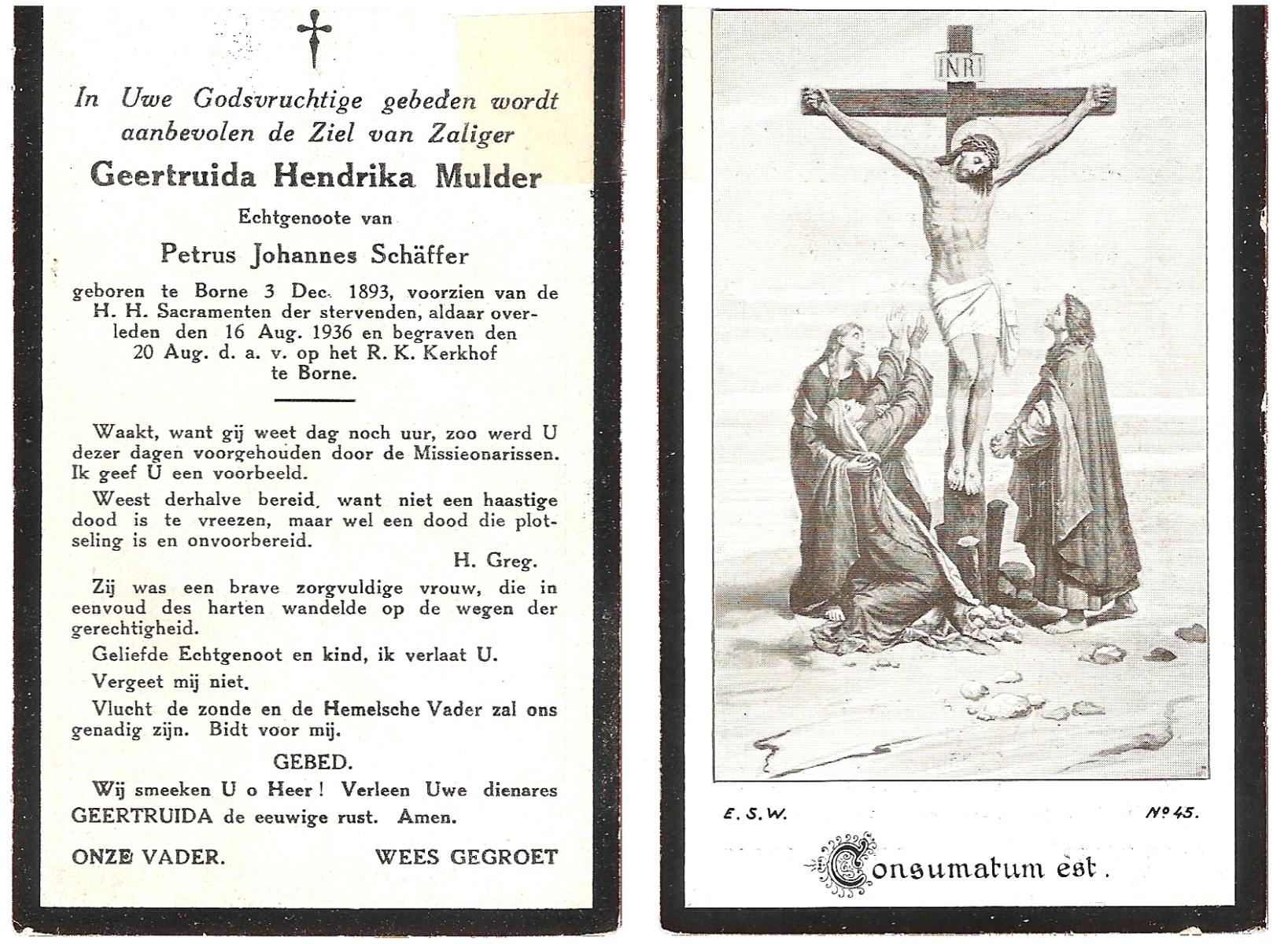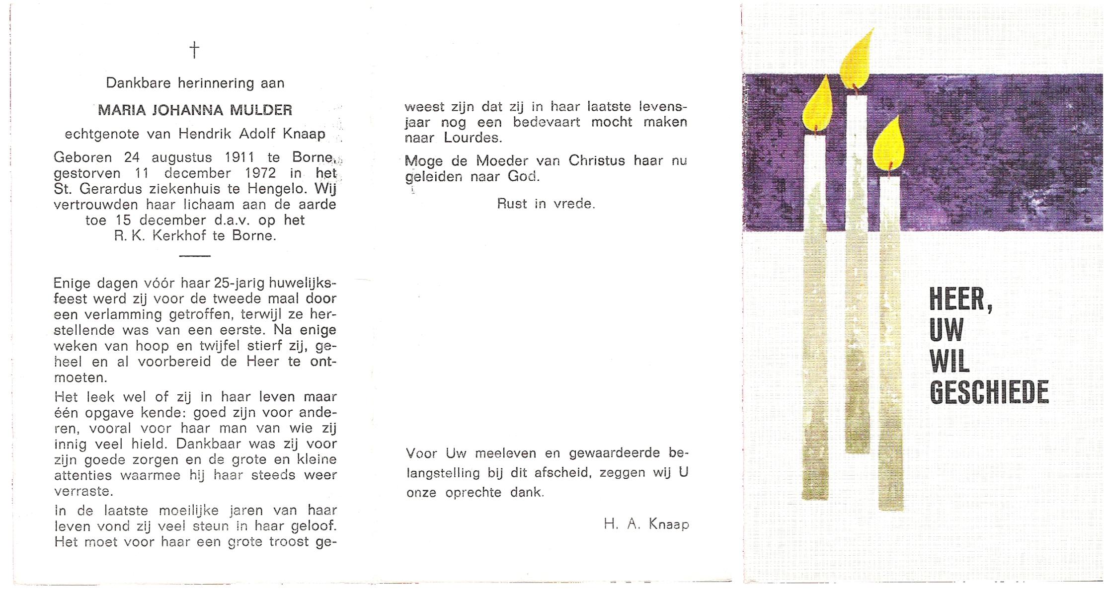 MULDER, Maria Johanna, geboren op 24-8-1911 te Borne, overleden op 11-12-1972 te Hengelo (Ov.) op 61-jarige leeftijd, begraven op 15-12-1972 te Borne.