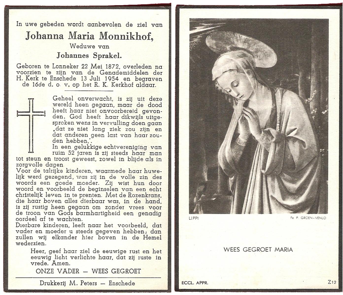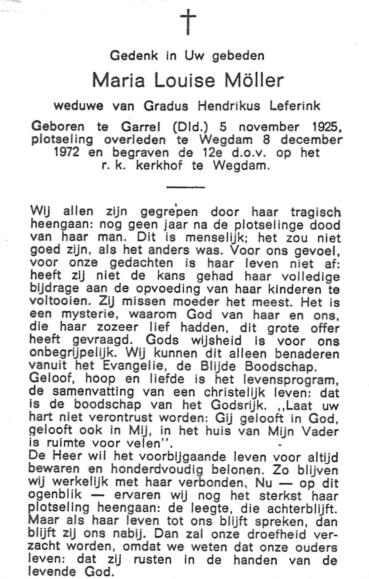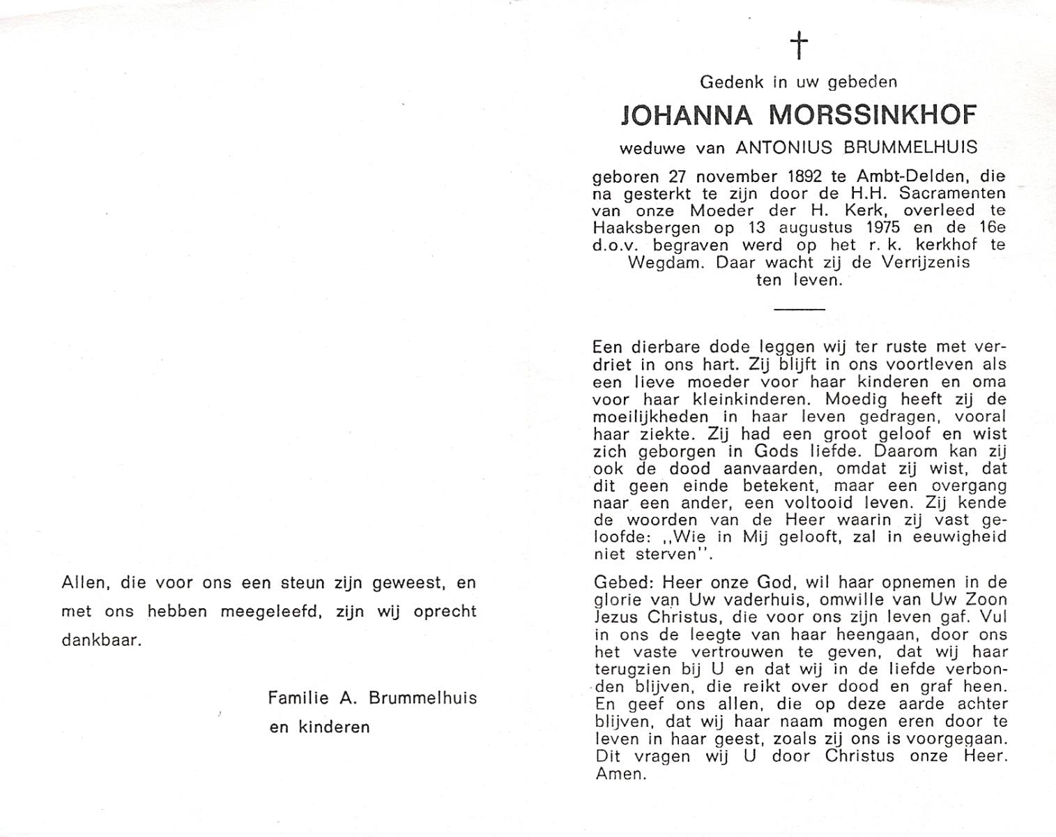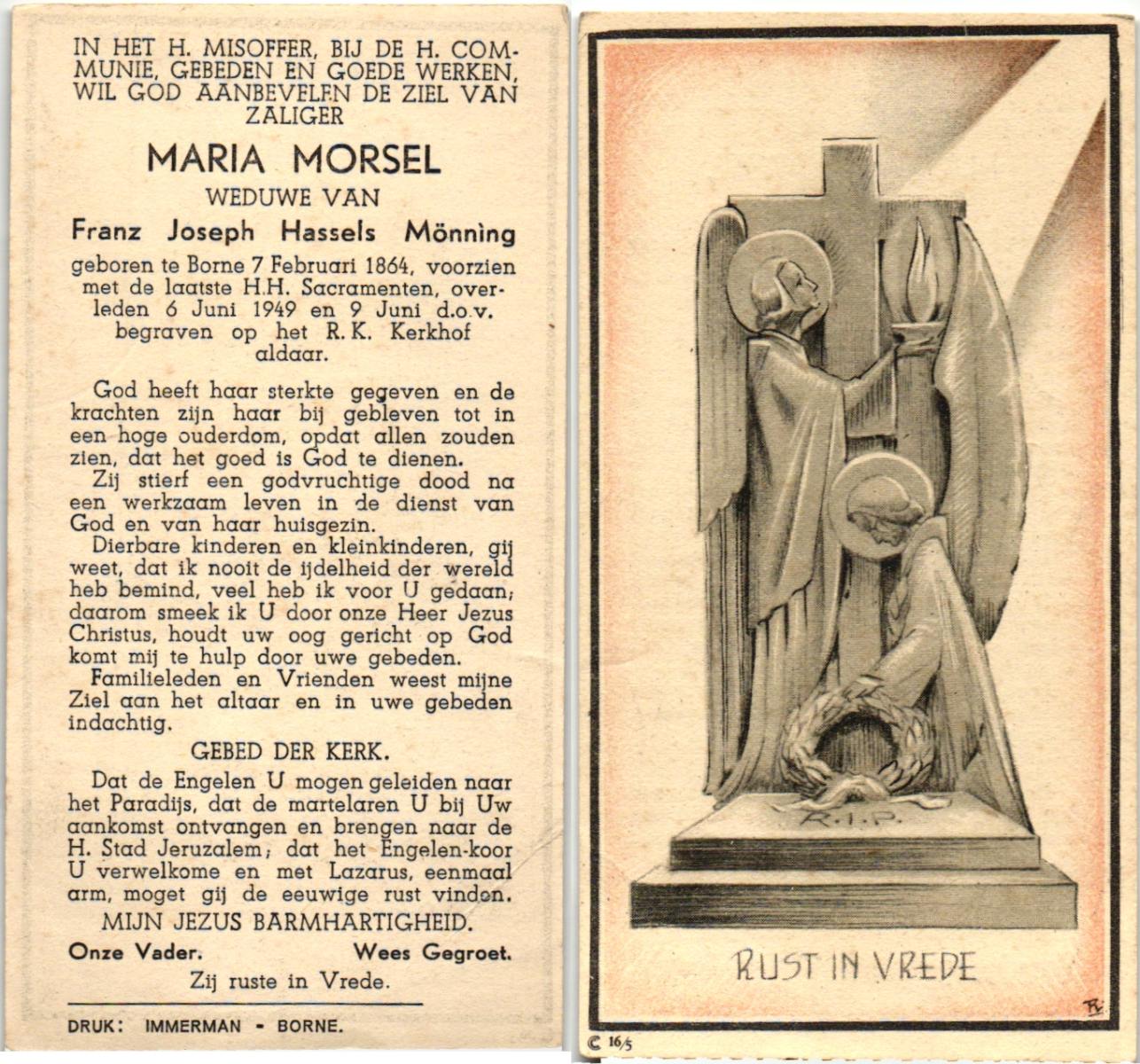 MULDER, Maria Johanna, geboren op 24-8-1911 te Borne, overleden op 11-12-1972 te Hengelo (Ov.) op 61-jarige leeftijd, begraven op 15-12-1972 te Borne.
