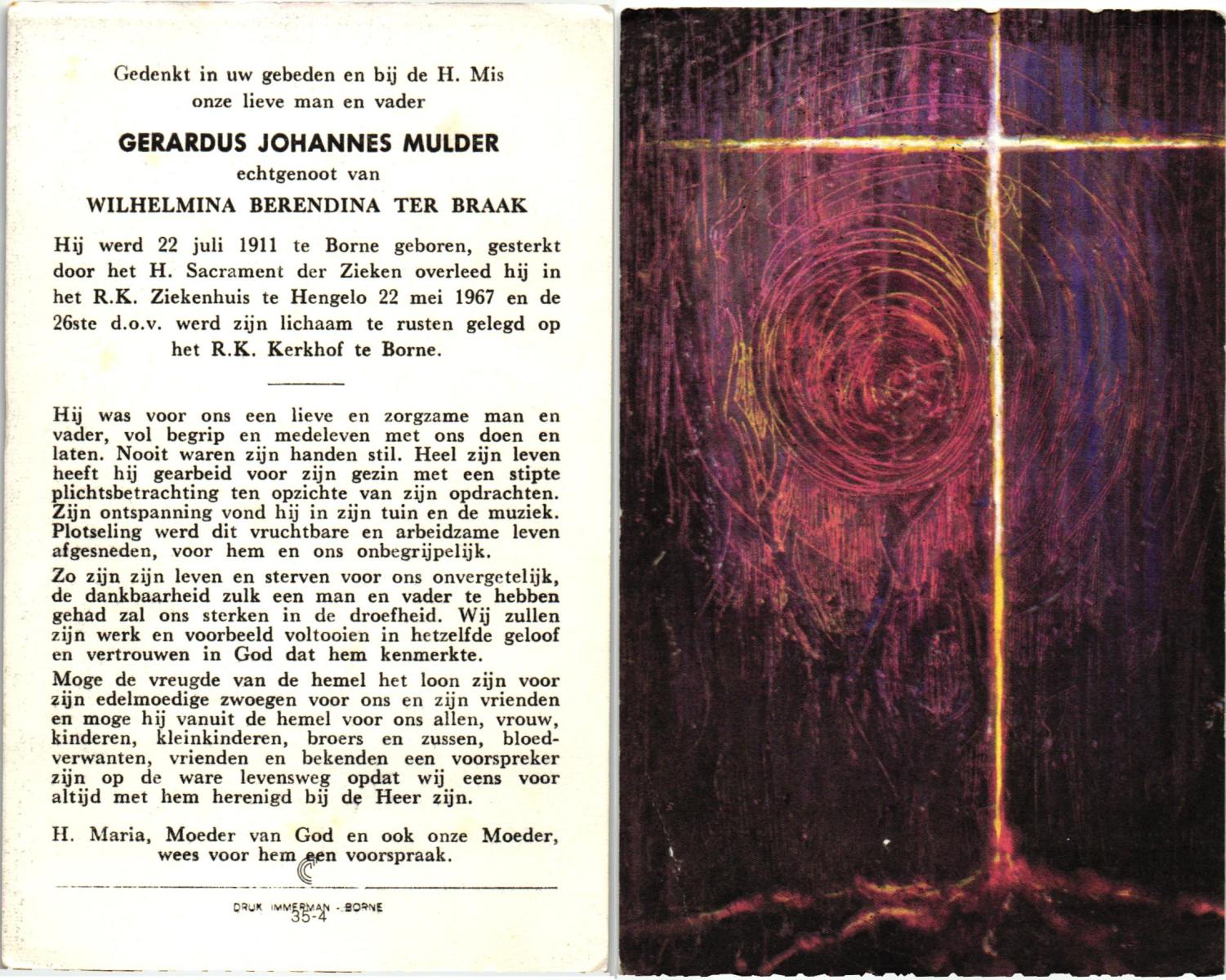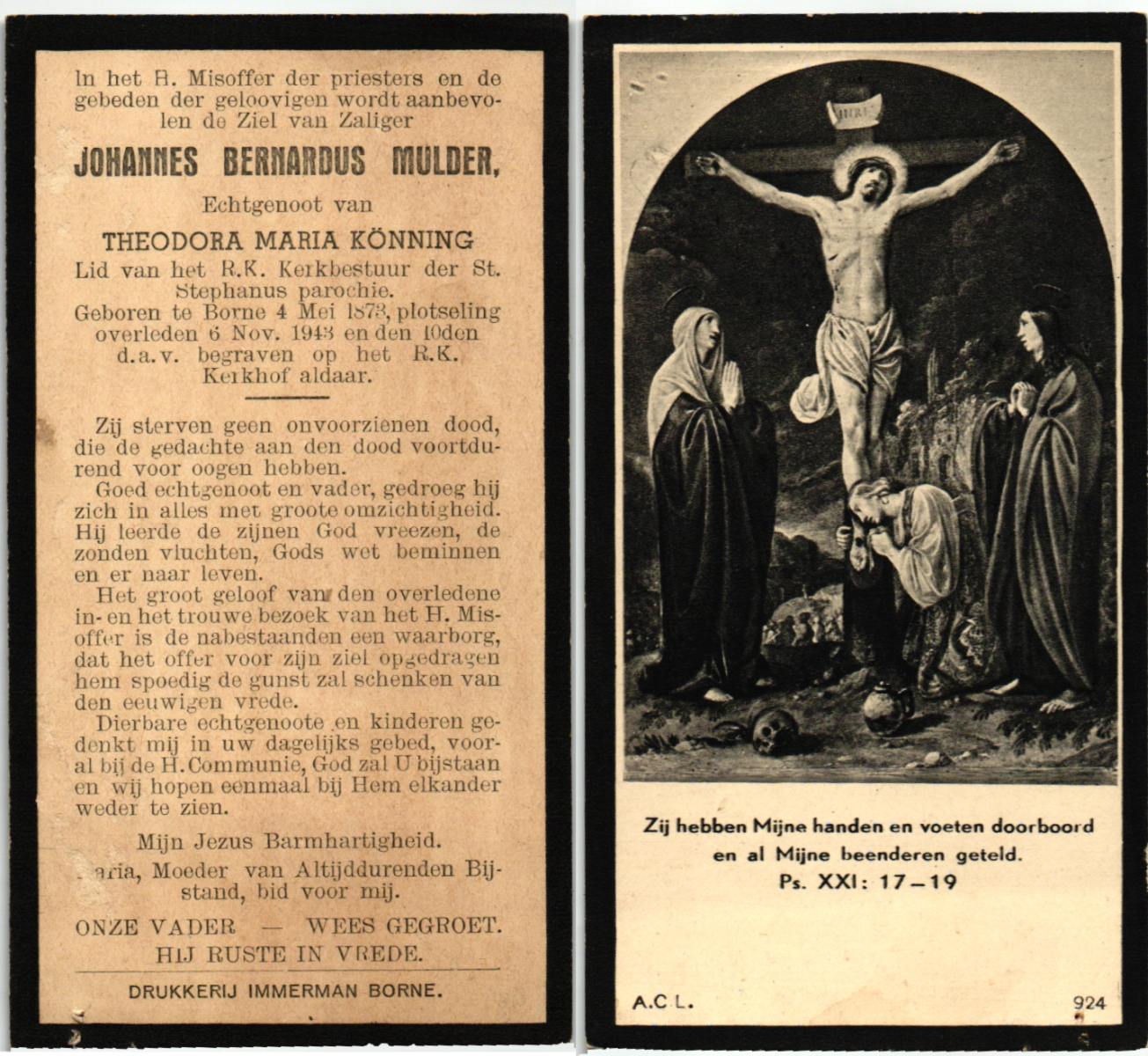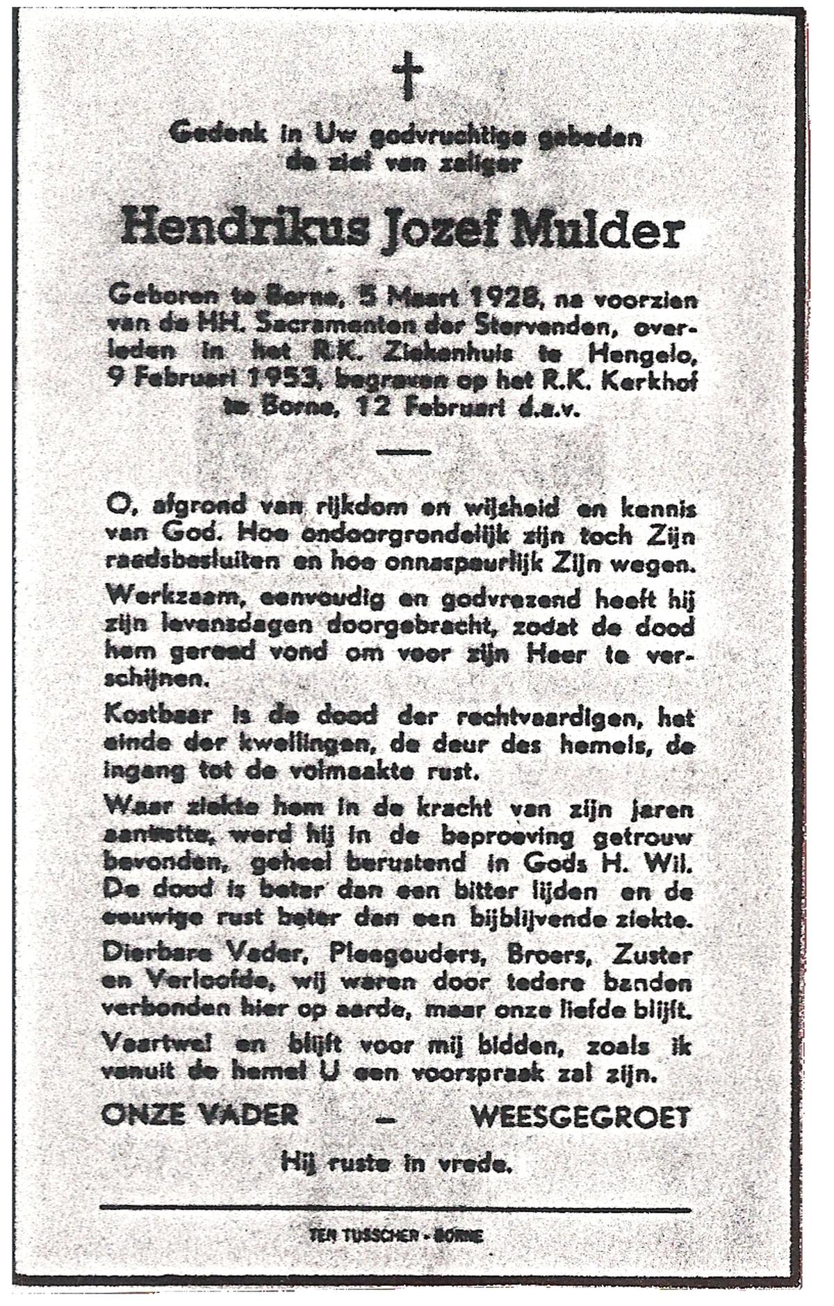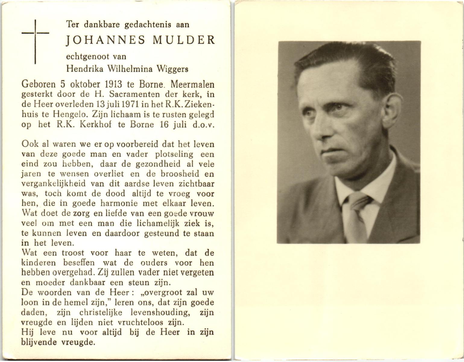 MULDER, Johannes, geboren op 5-10-1913 te Borne, overleden op 13-7-1971 te Hengelo, ziekenhuis op 57-jarige leeftijd, begraven op 16-7-1971 te Borne.