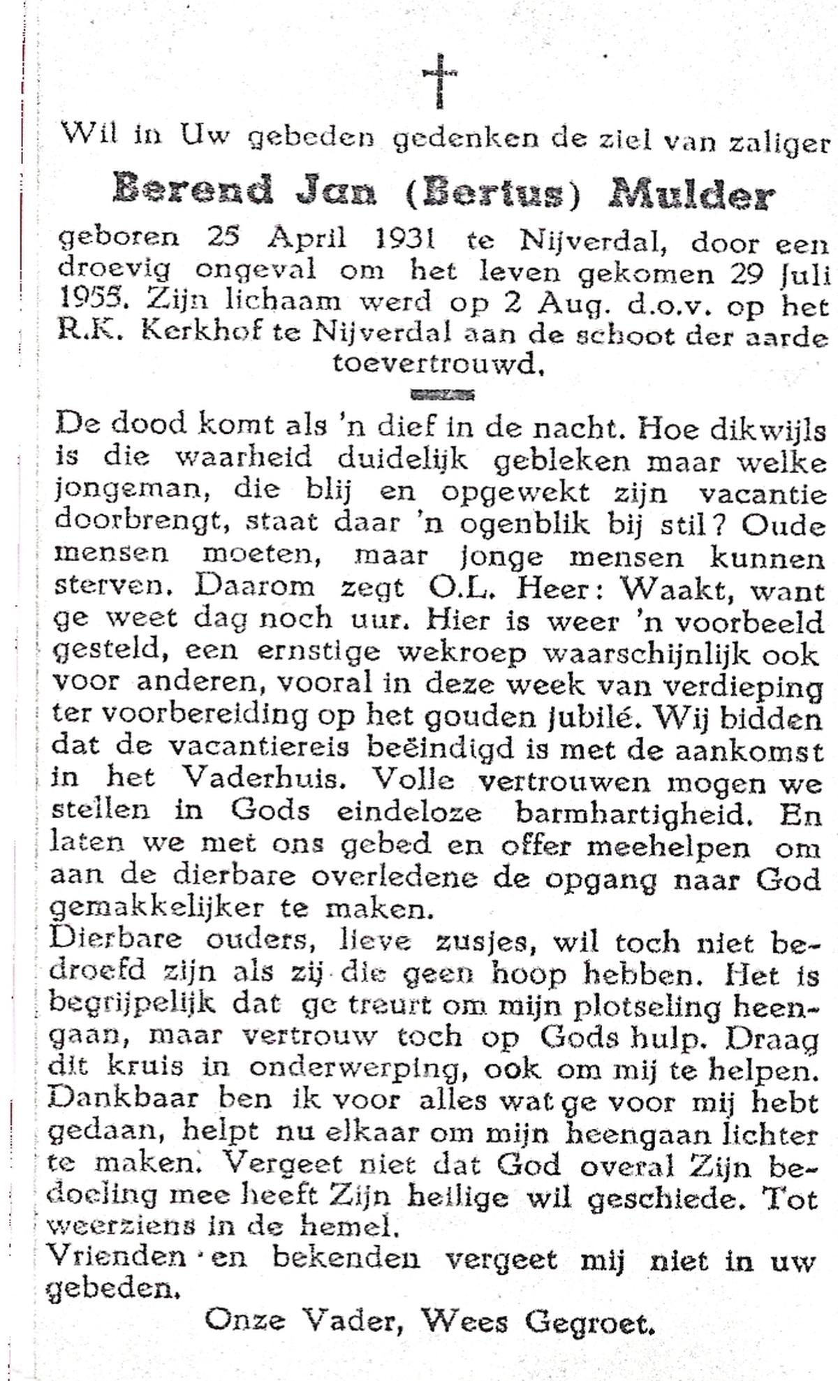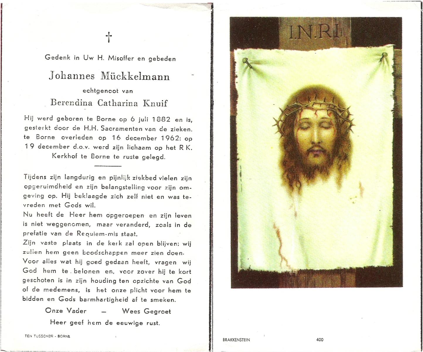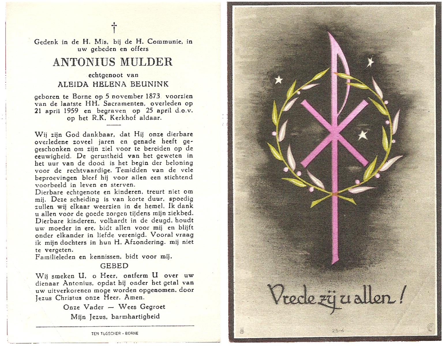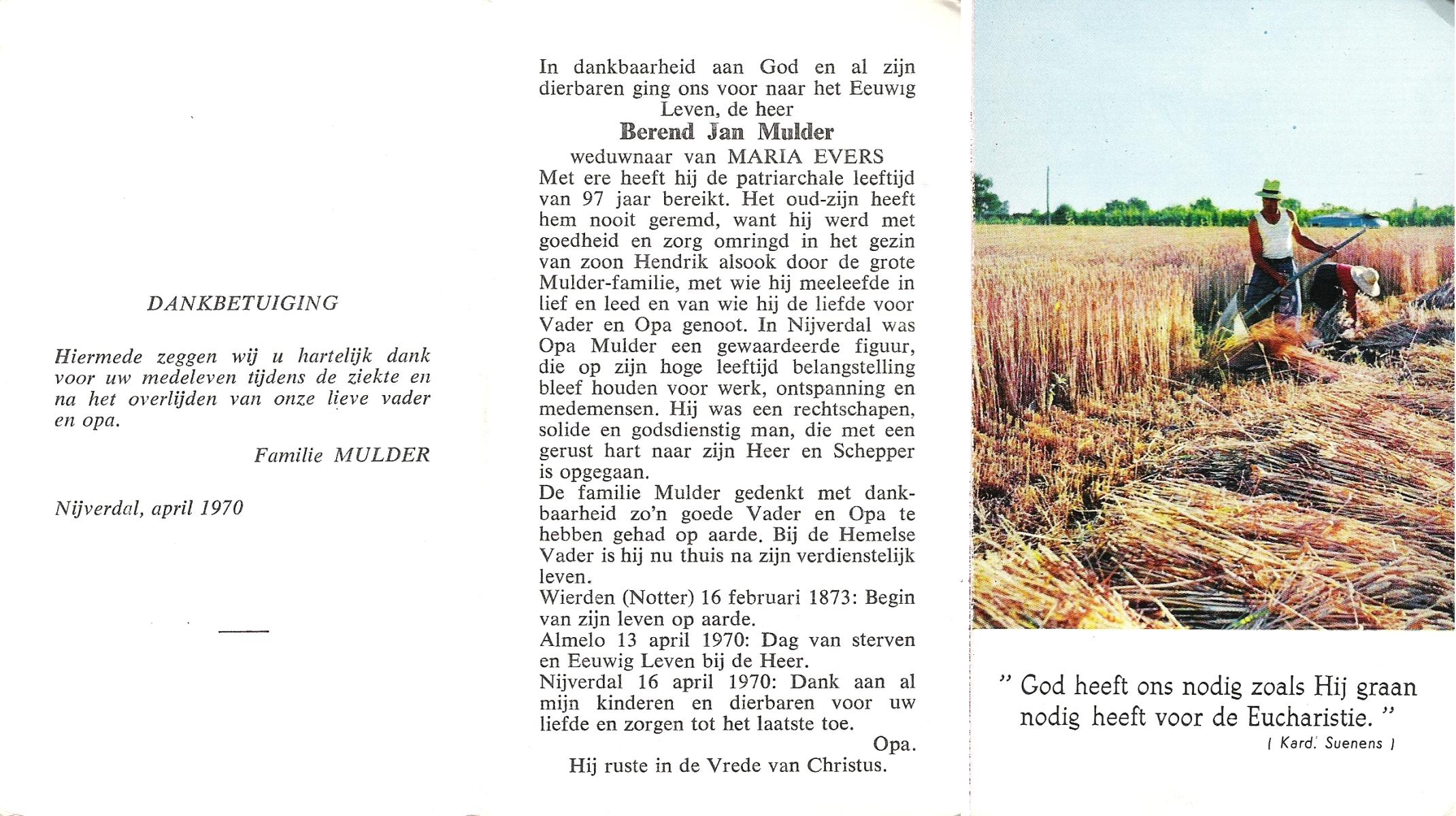 MULDER, Johannes, geboren op 5-10-1913 te Borne, overleden op 13-7-1971 te Hengelo, ziekenhuis op 57-jarige leeftijd, begraven op 16-7-1971 te Borne.