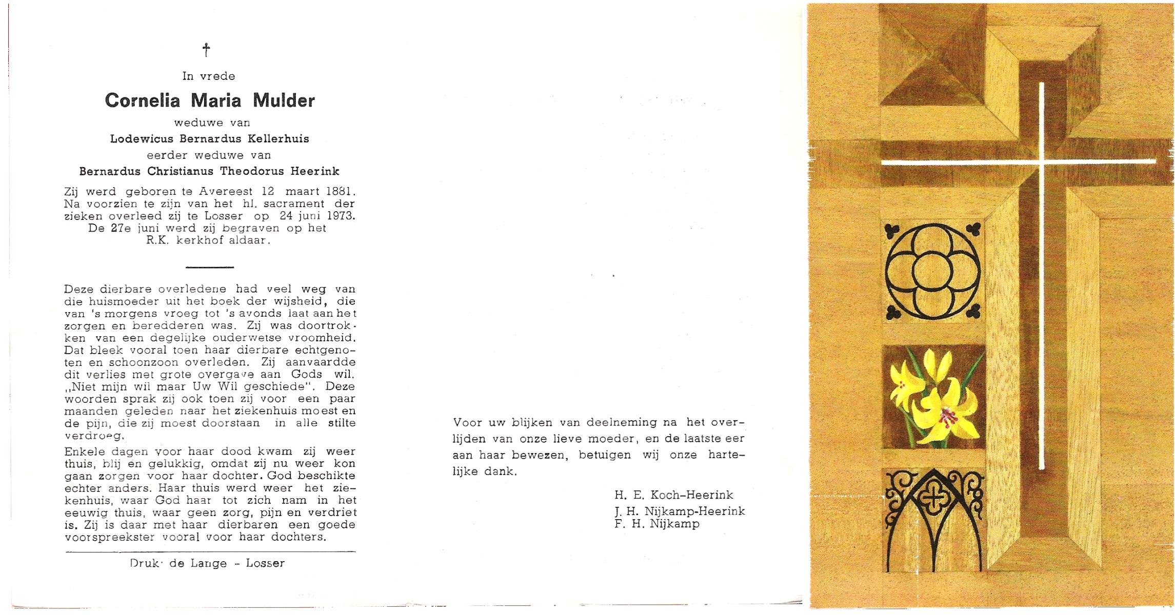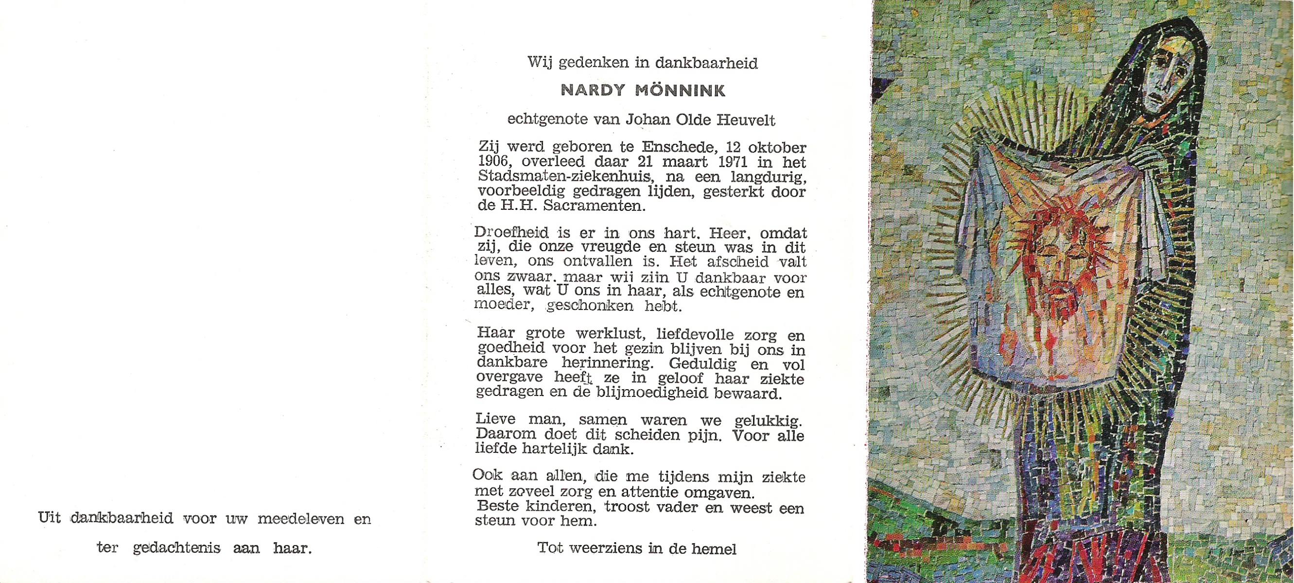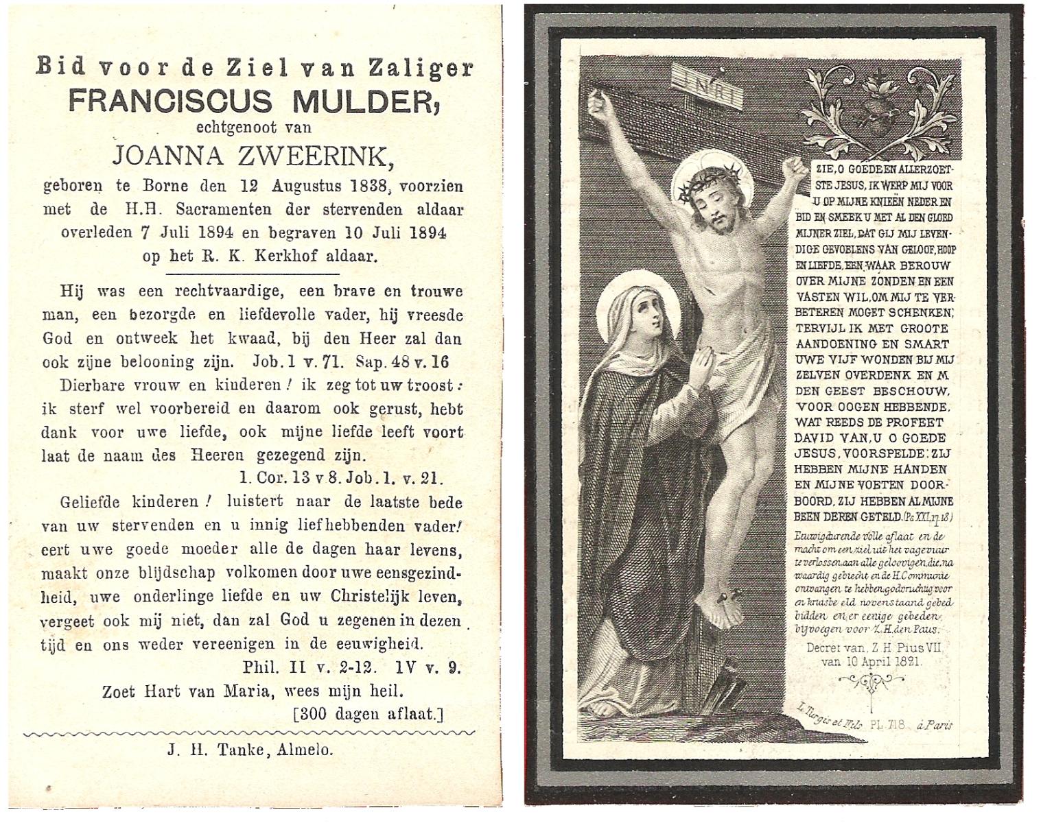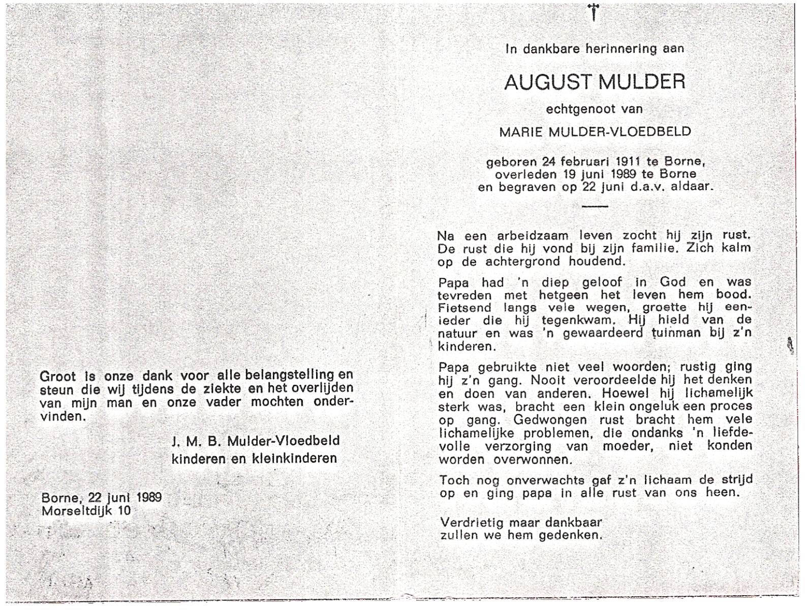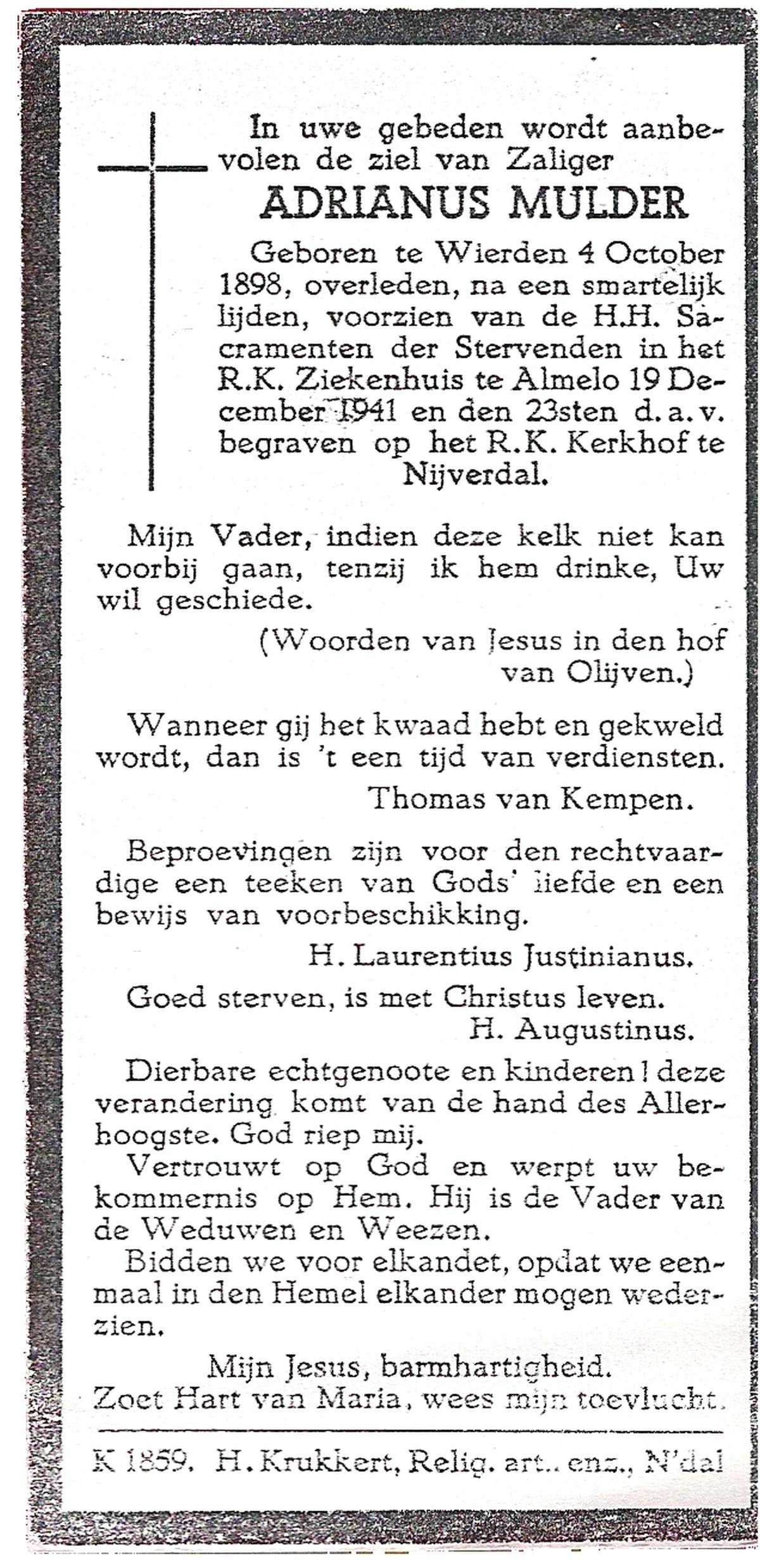 MULDER, Johannes, geboren op 5-10-1913 te Borne, overleden op 13-7-1971 te Hengelo, ziekenhuis op 57-jarige leeftijd, begraven op 16-7-1971 te Borne.