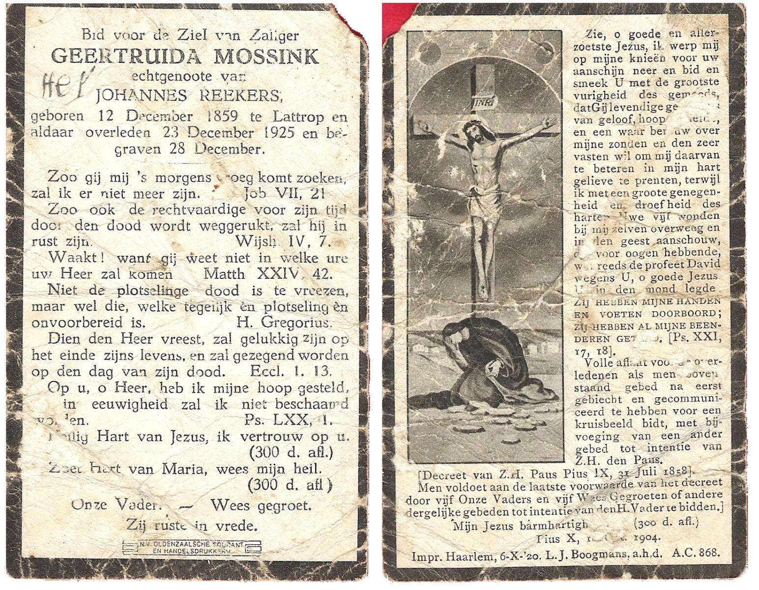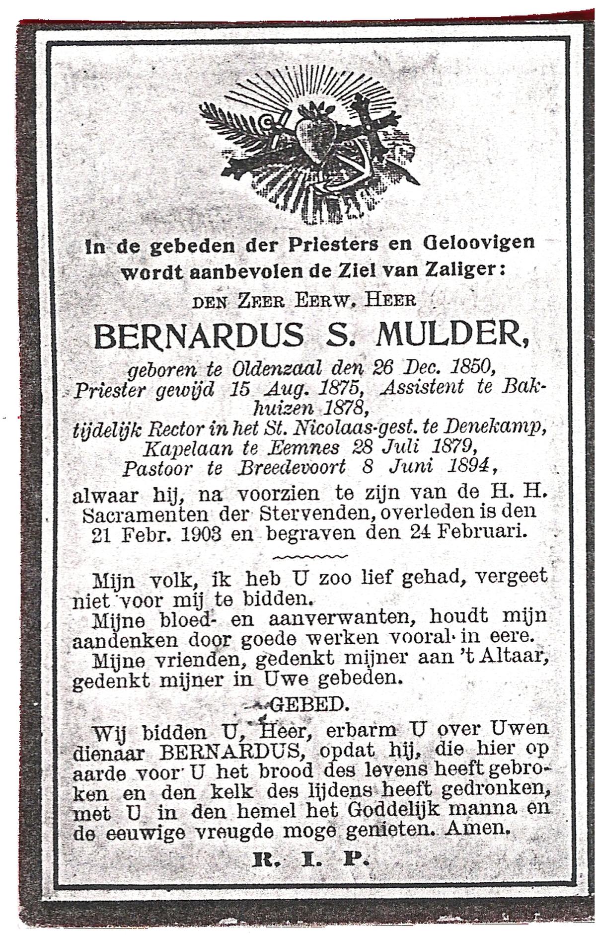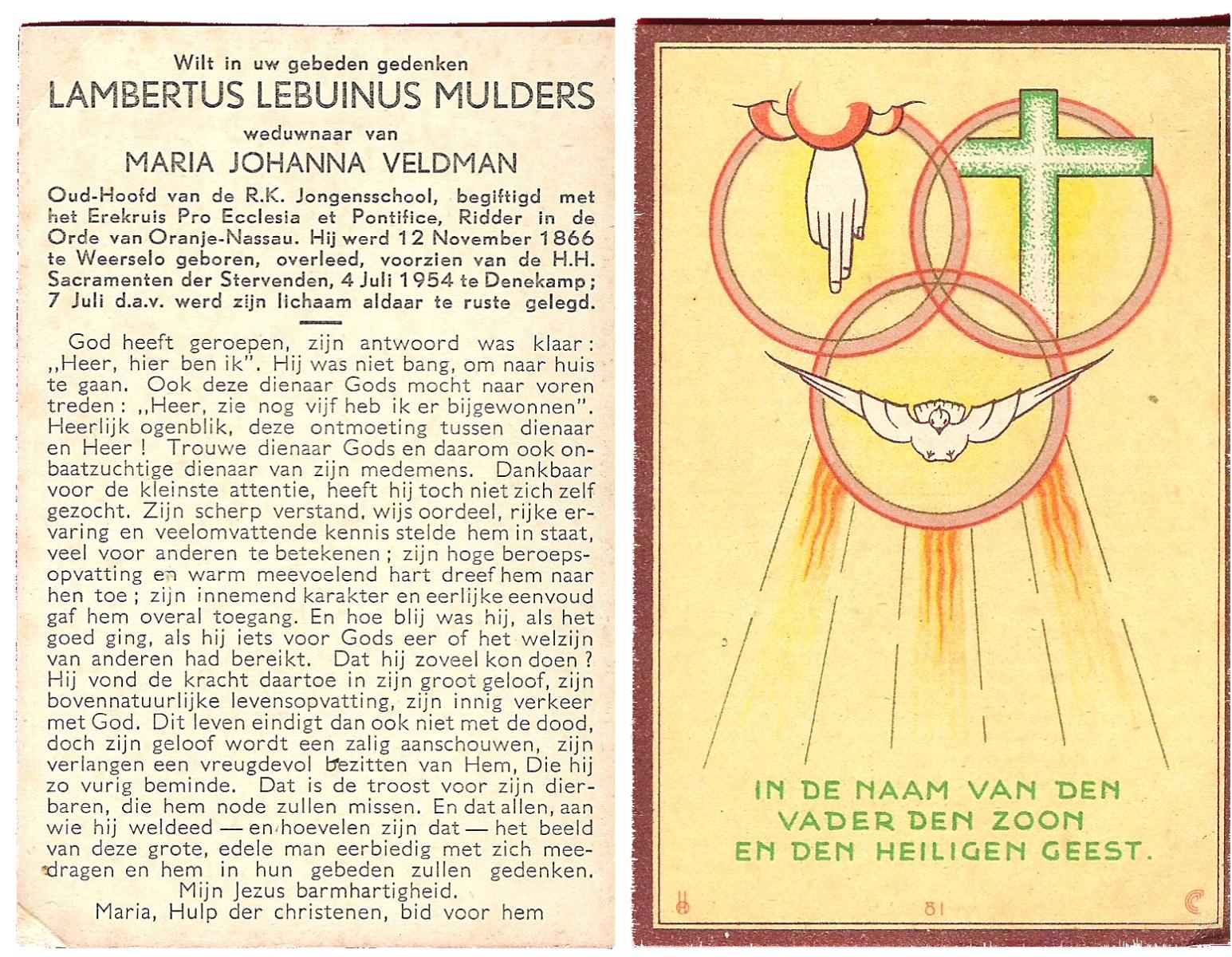 MULDERS, Lambertus Lebuinis, geboren op 12-11-1866 te Weerselo, overleden op 4-7-1954 te Denekamp op 87-jarige leeftijd, begraven op 7-7-1954 te Denekamp.
