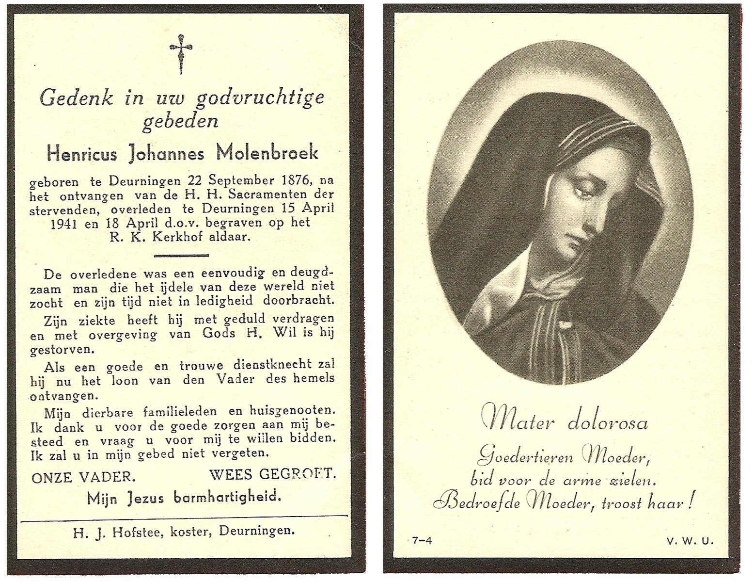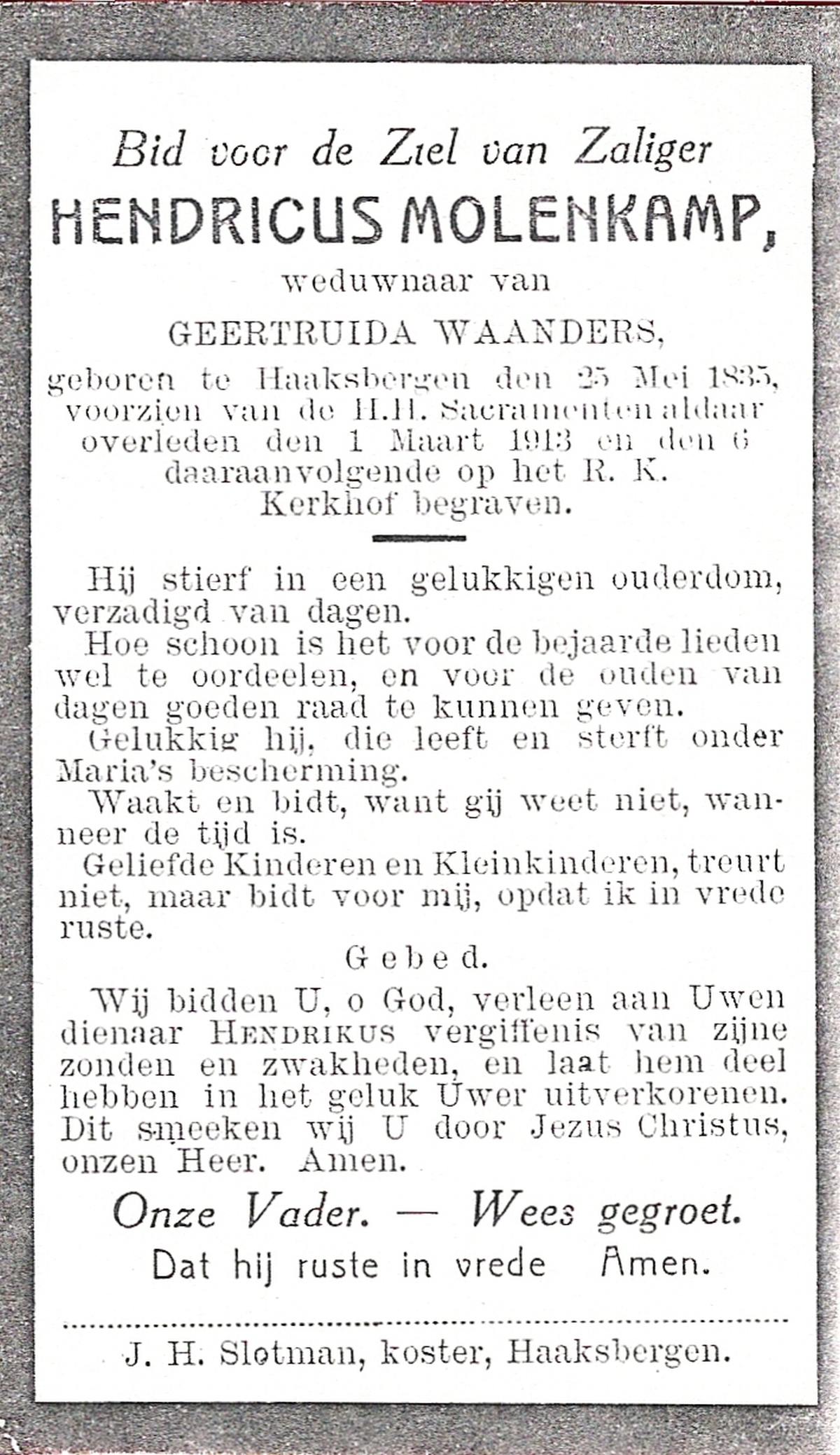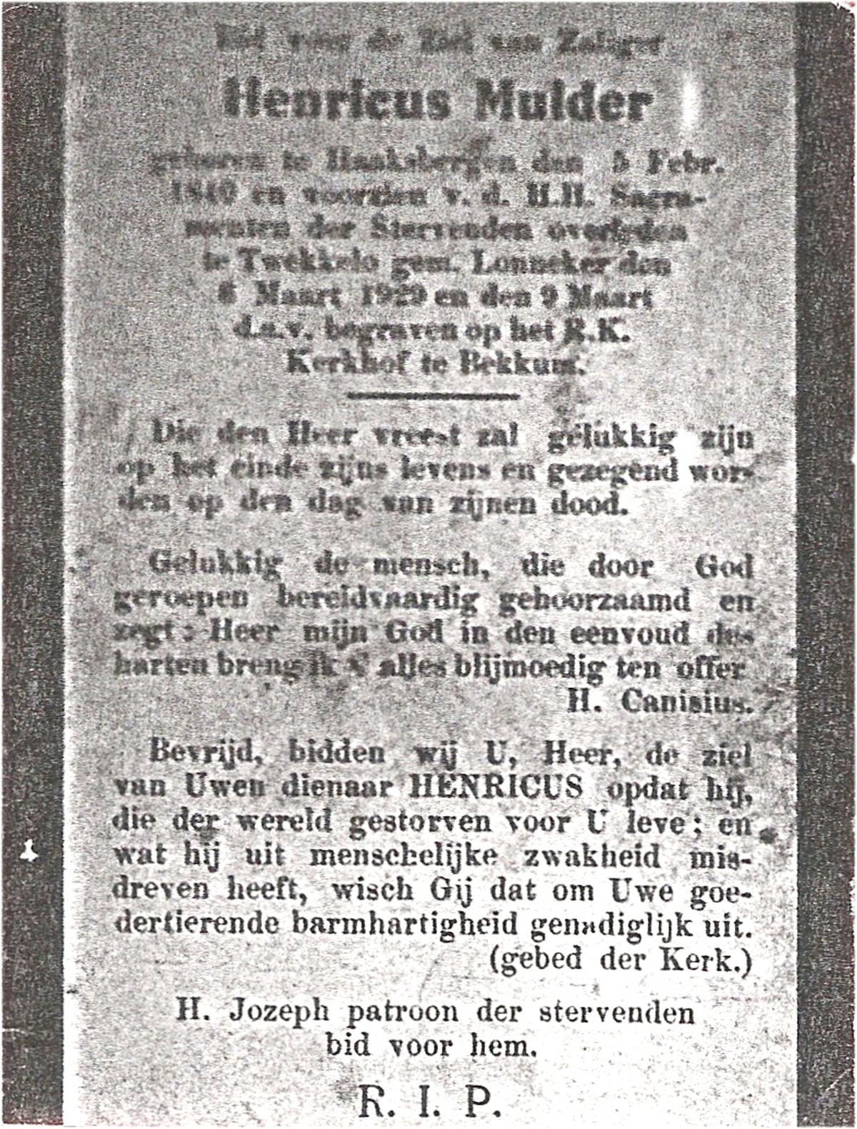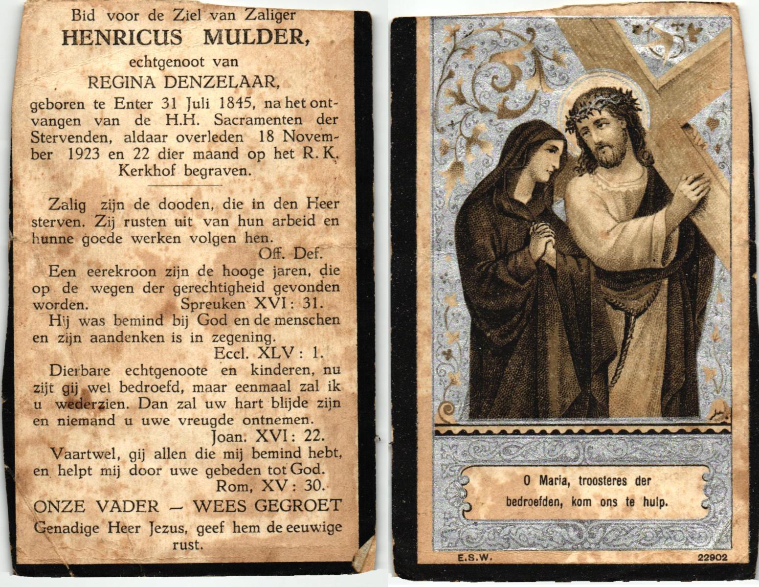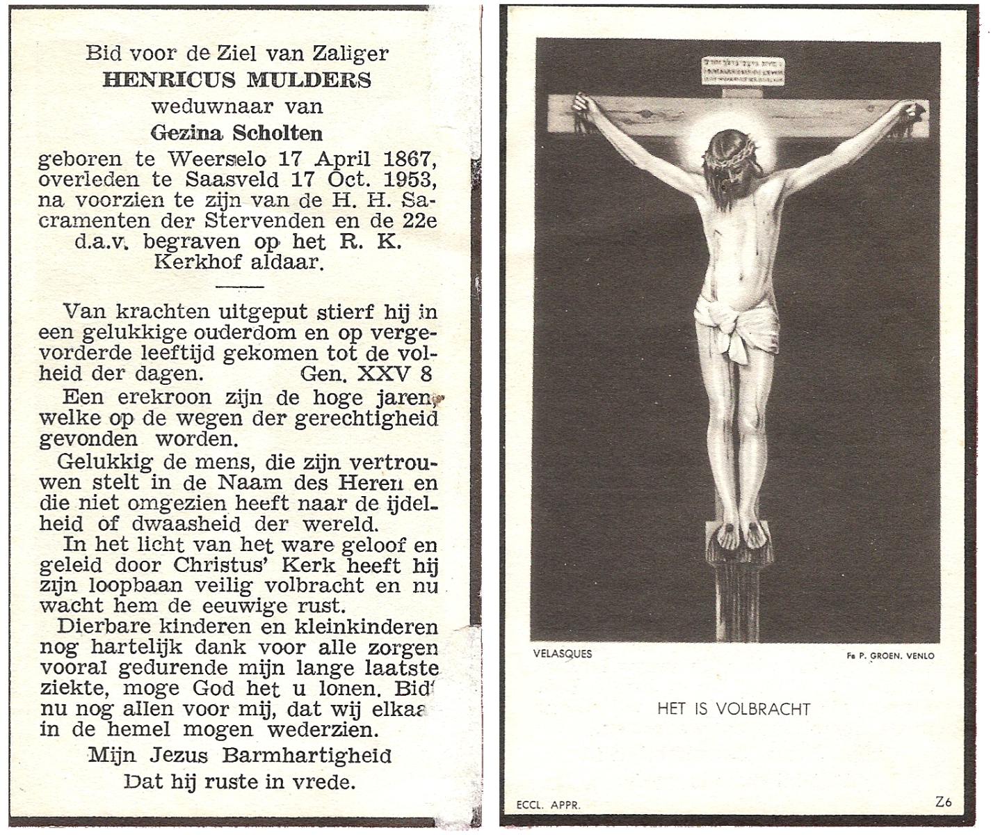 MULDERS, Henricus, geboren op 17-04-1867 te Weerselo, overleden op 17-10-1953 te Saasveld op 86-jarige leeftijd, begraven op 22-10-1953 te Saasveld.