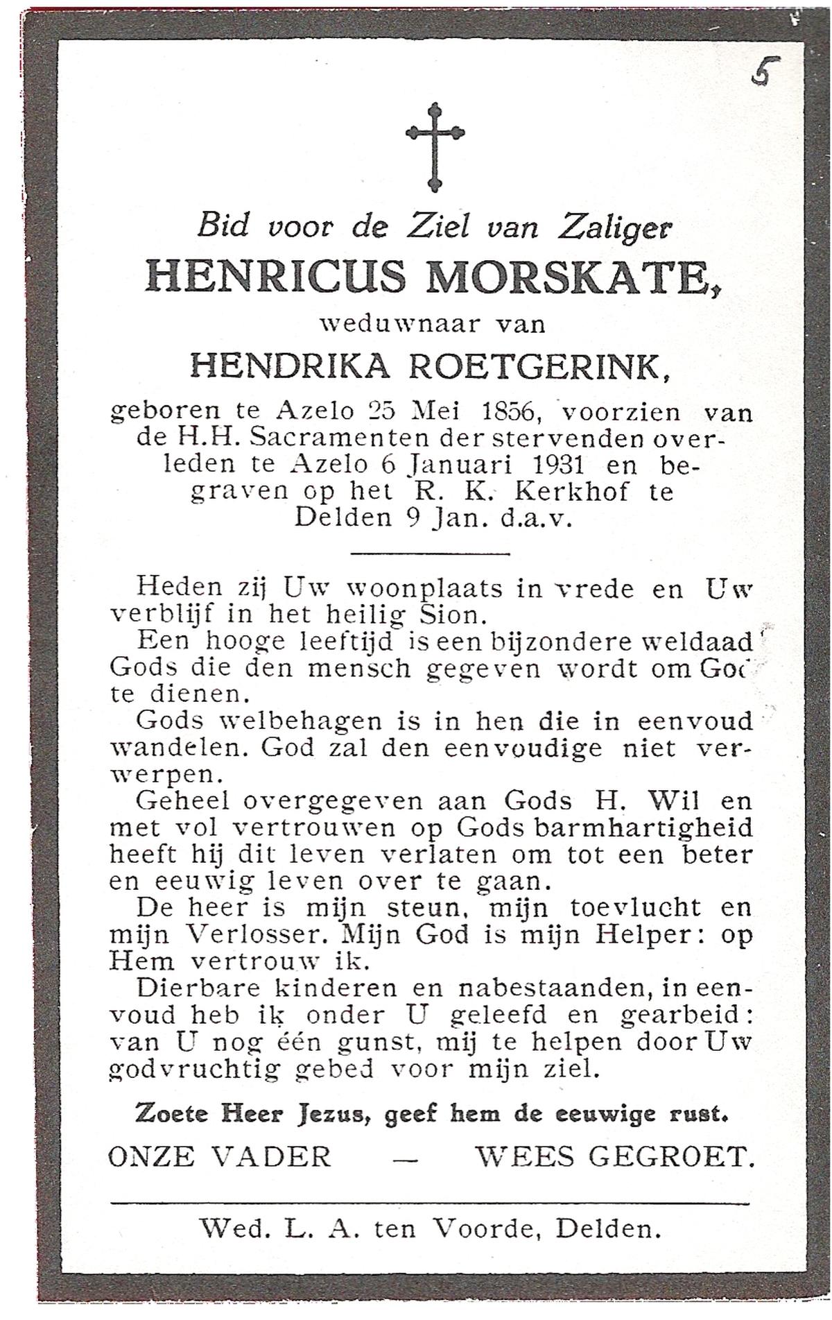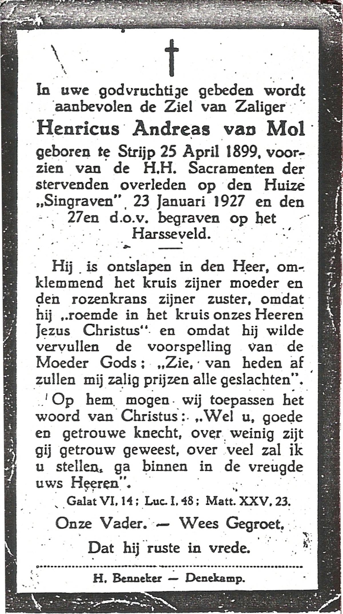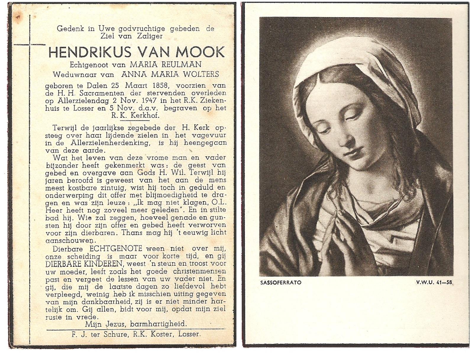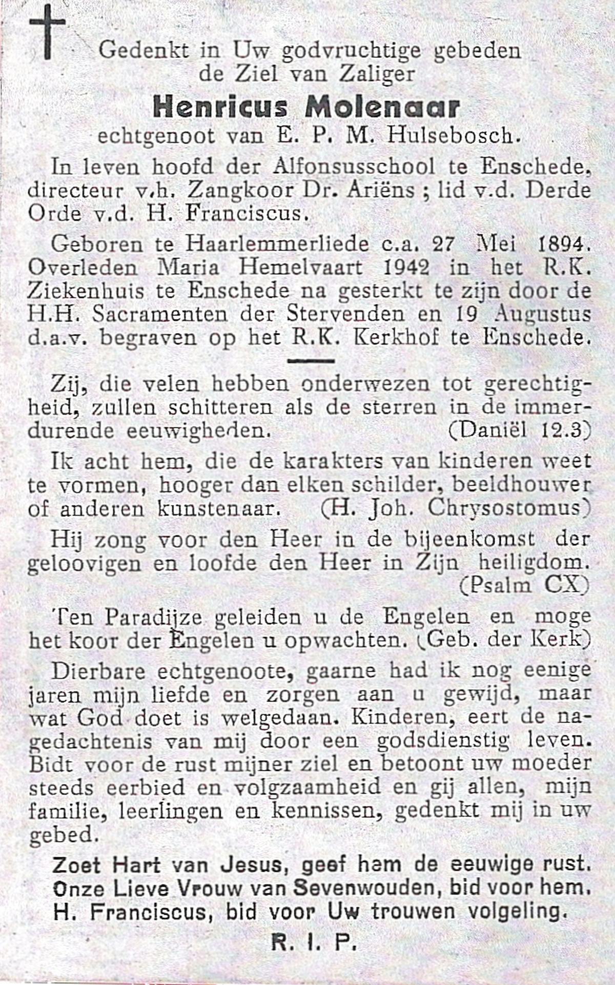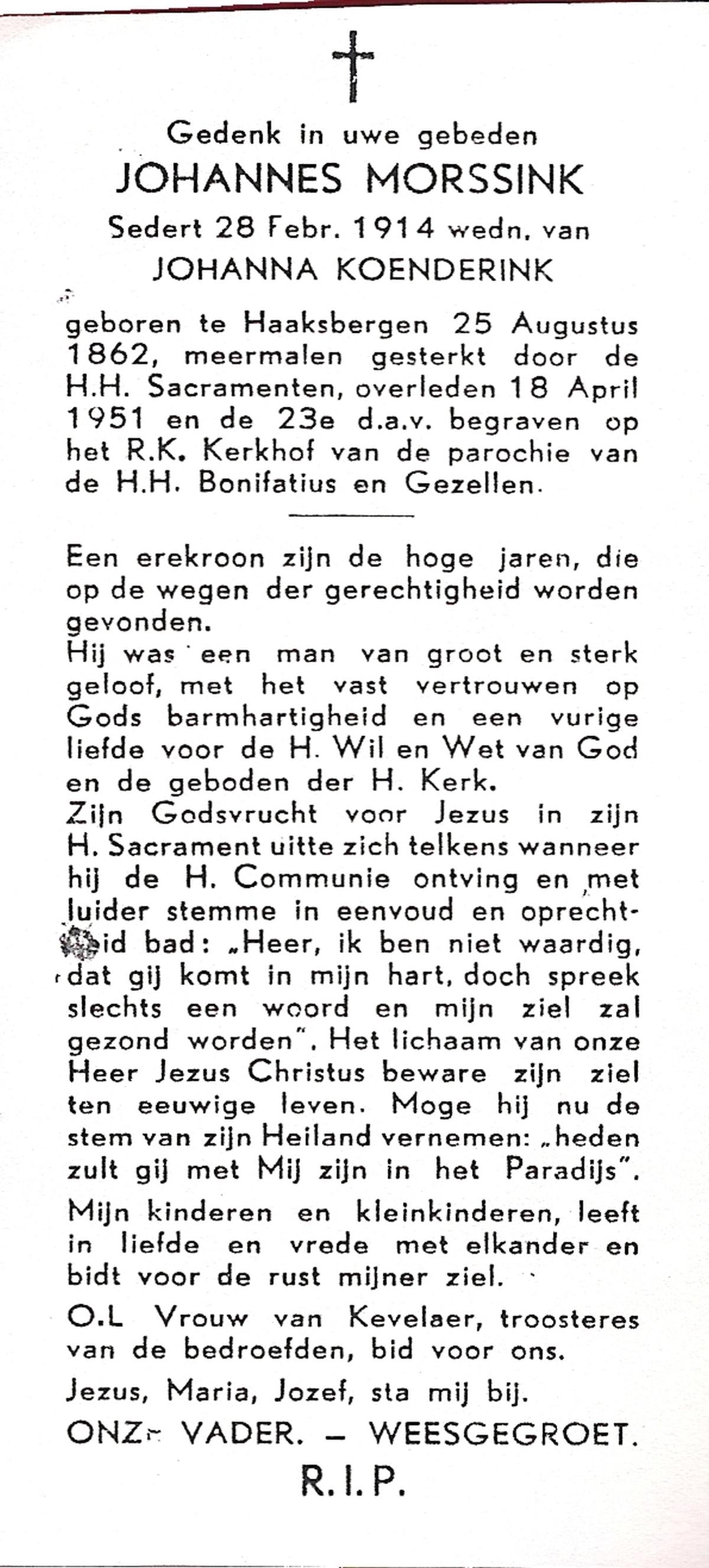 MULDERS, Henricus, geboren op 17-04-1867 te Weerselo, overleden op 17-10-1953 te Saasveld op 86-jarige leeftijd, begraven op 22-10-1953 te Saasveld.
