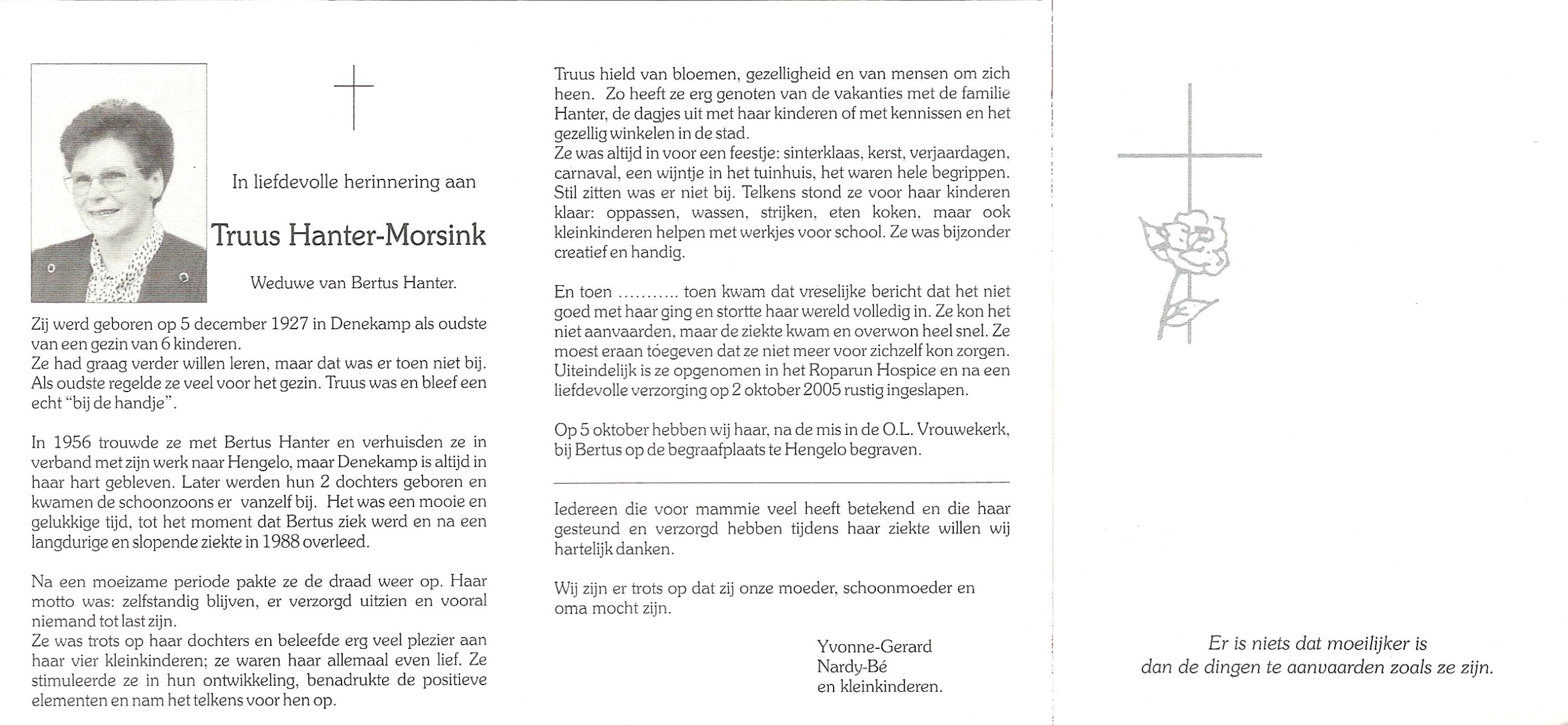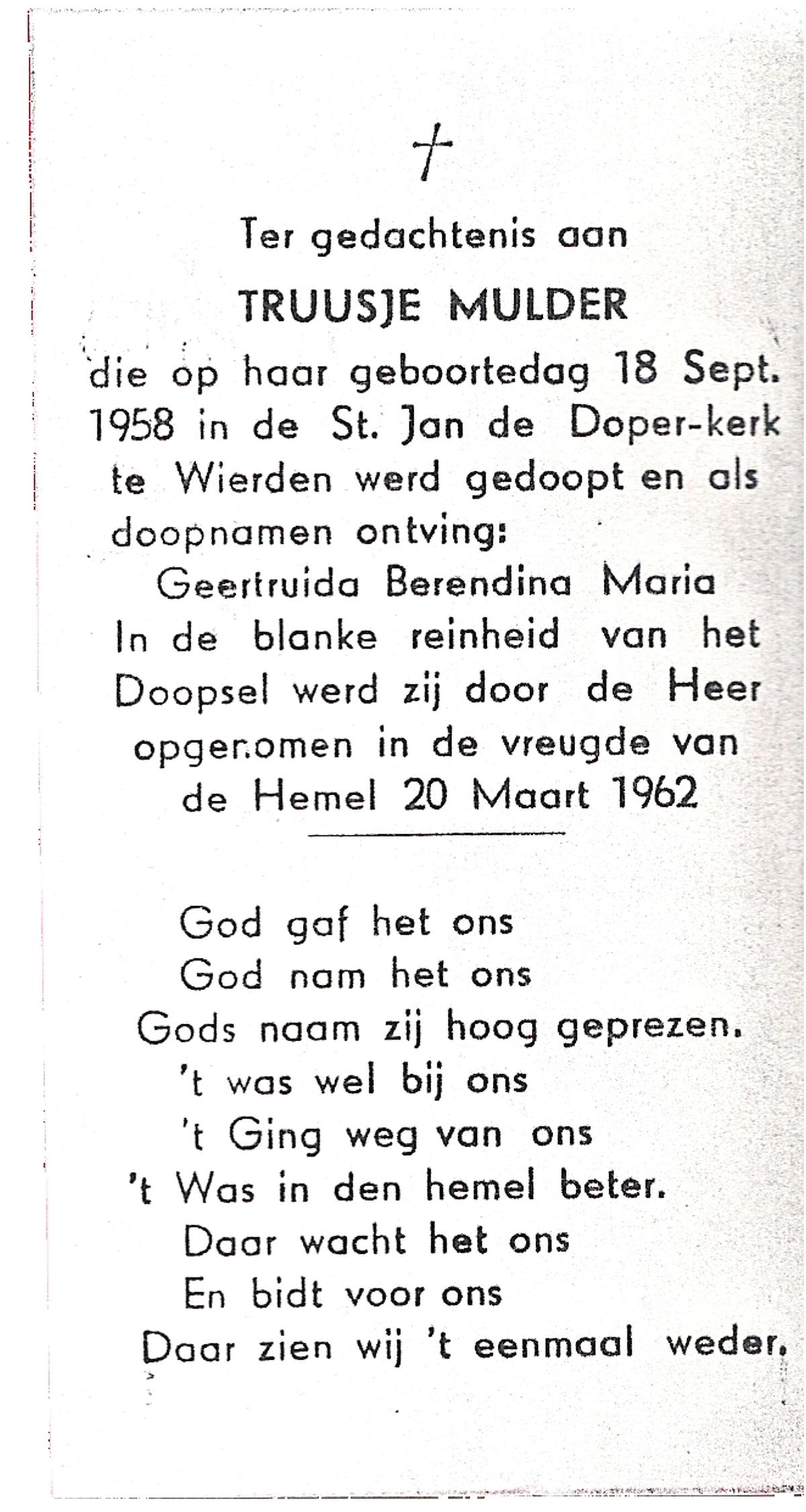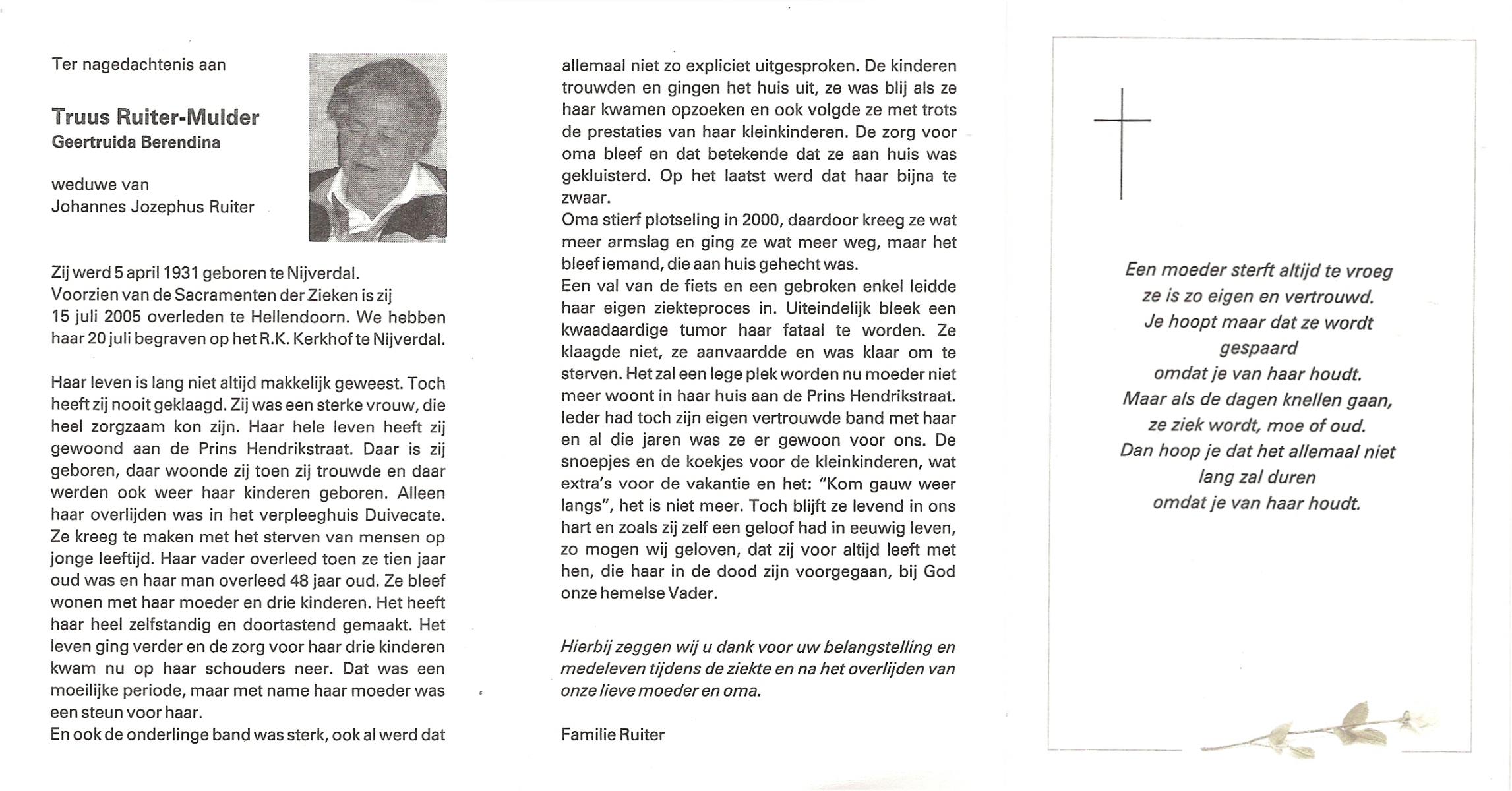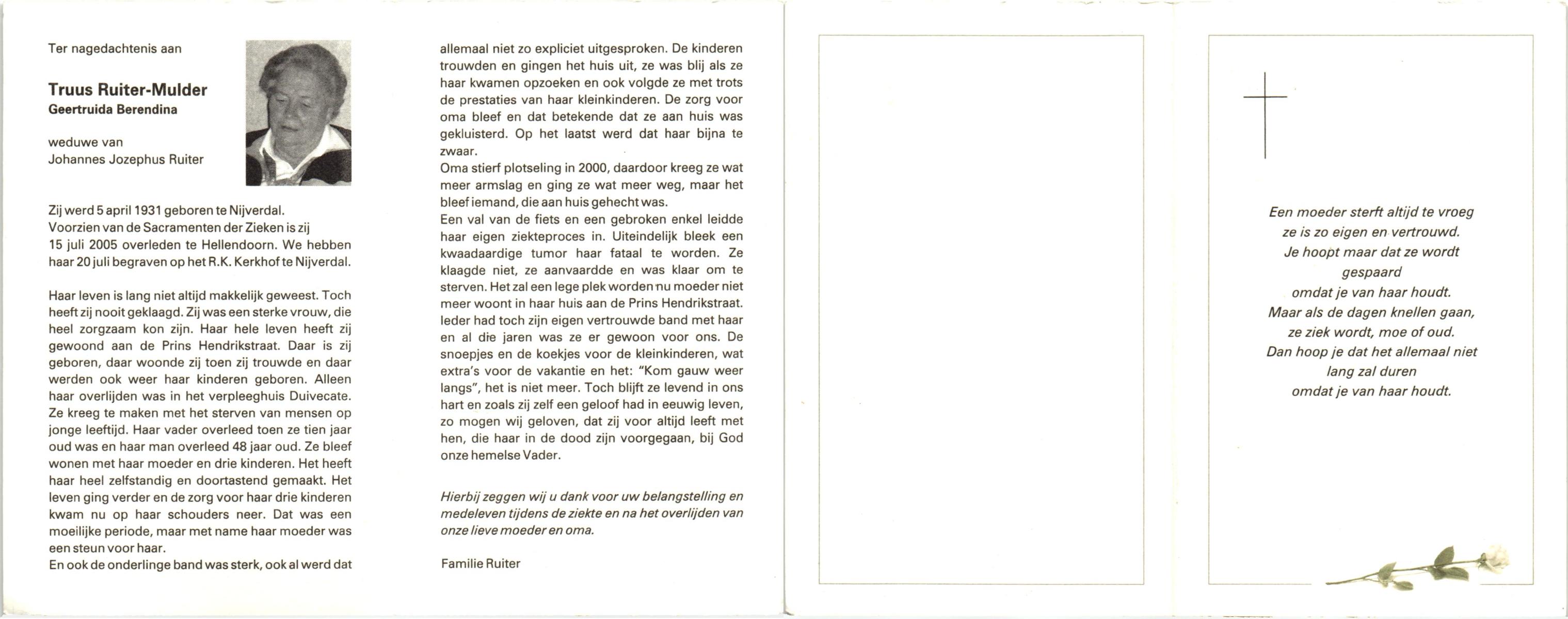 MULDER, Truus (Geertruida Berendina), geboren op 5-4-1931 te Hellendoorn, Nijverdal, overleden op 15-7-2005 te Hellendoorn op 74-jarige leeftijd, begraven op 20-7-2005 te Hellendoorn, Nijverdal.