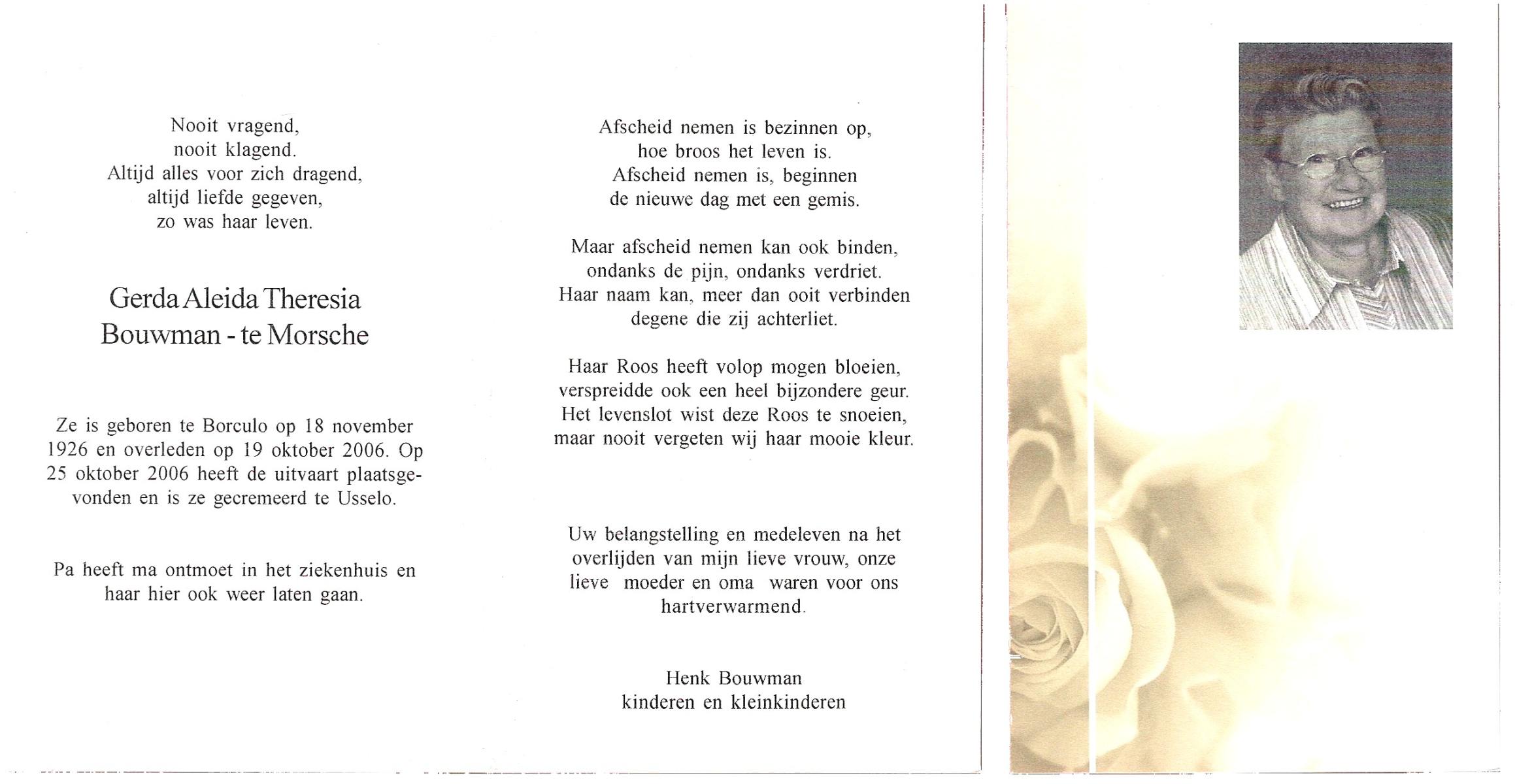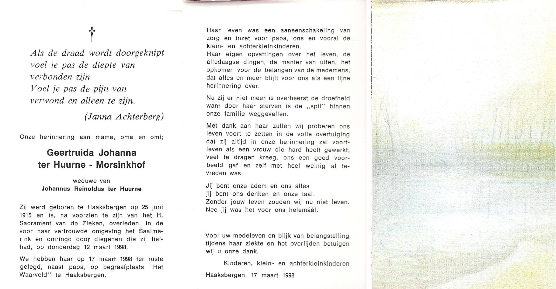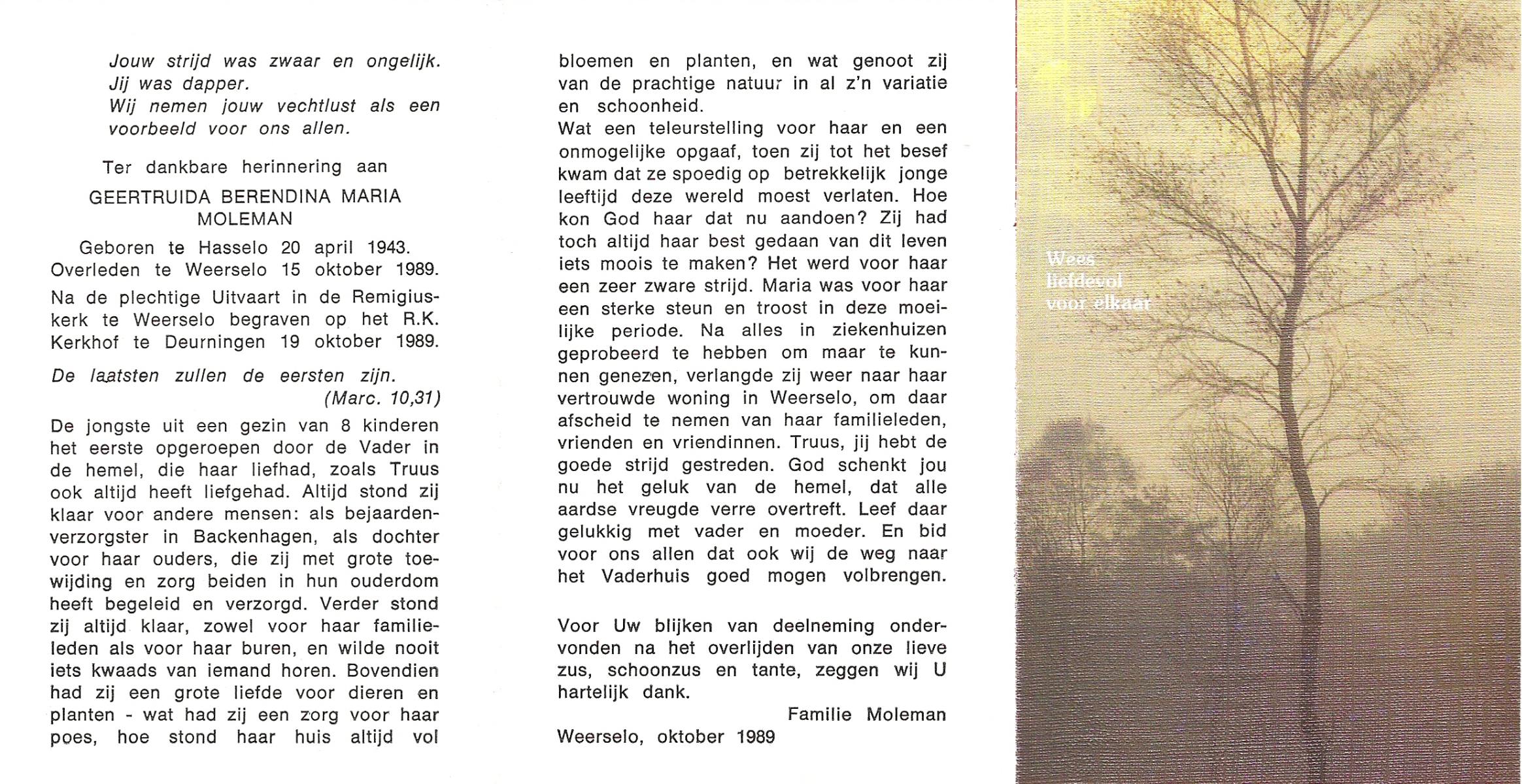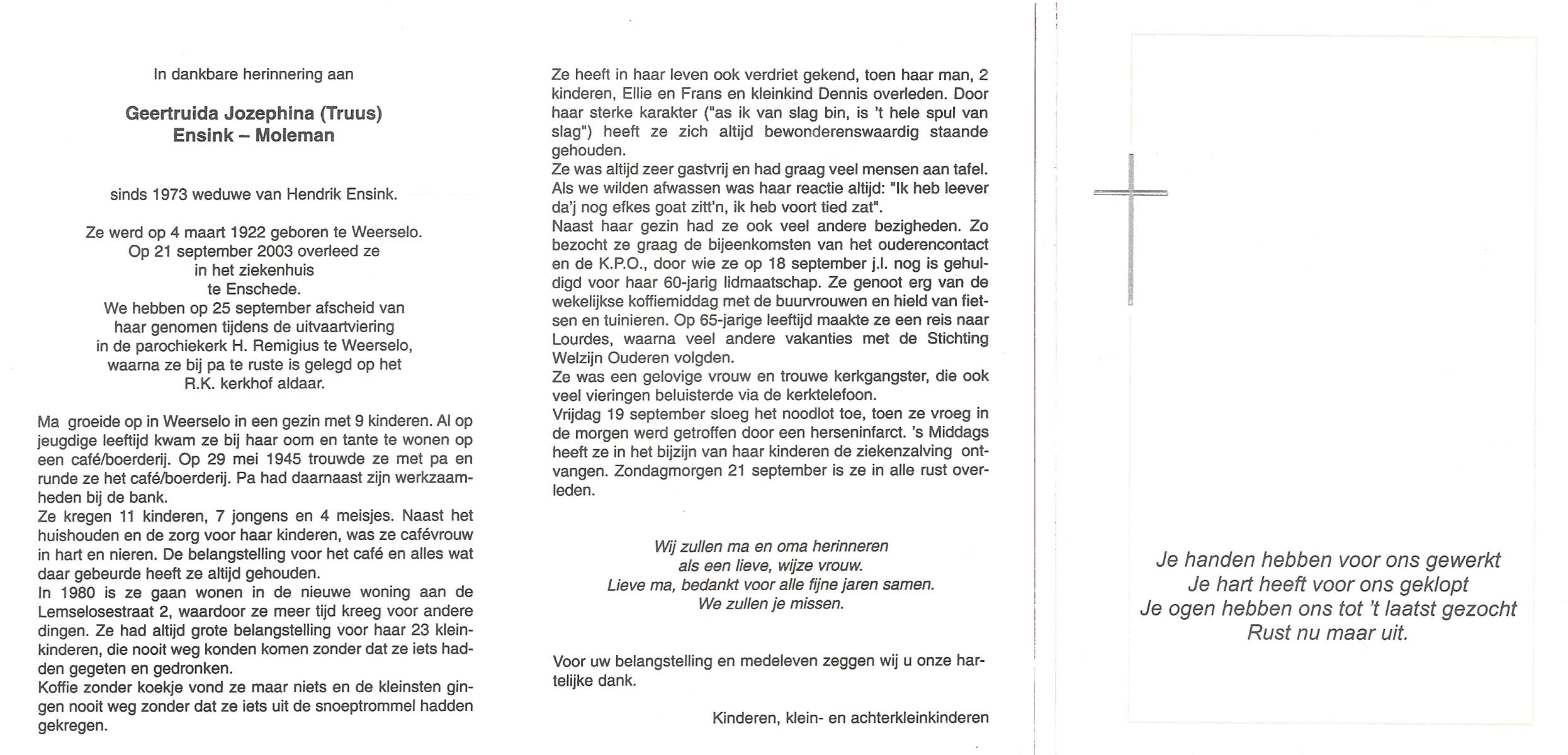 MULDER, Truus (Geertruida Berendina), geboren op 5-4-1931 te Hellendoorn, Nijverdal, overleden op 15-7-2005 te Hellendoorn op 74-jarige leeftijd, begraven op 20-7-2005 te Hellendoorn, Nijverdal.