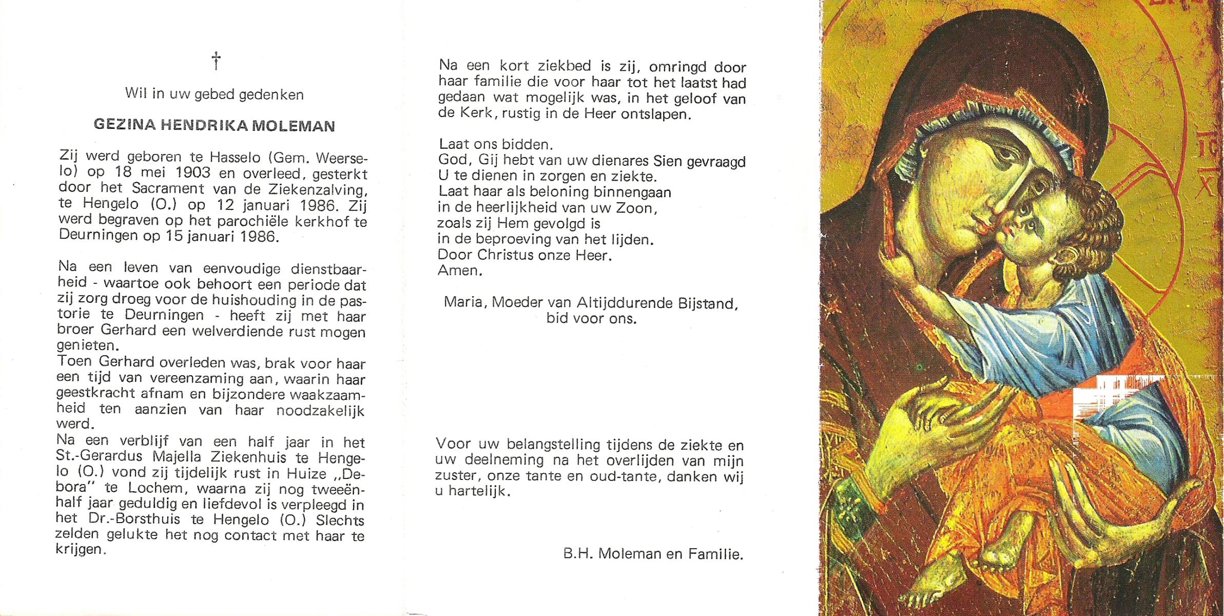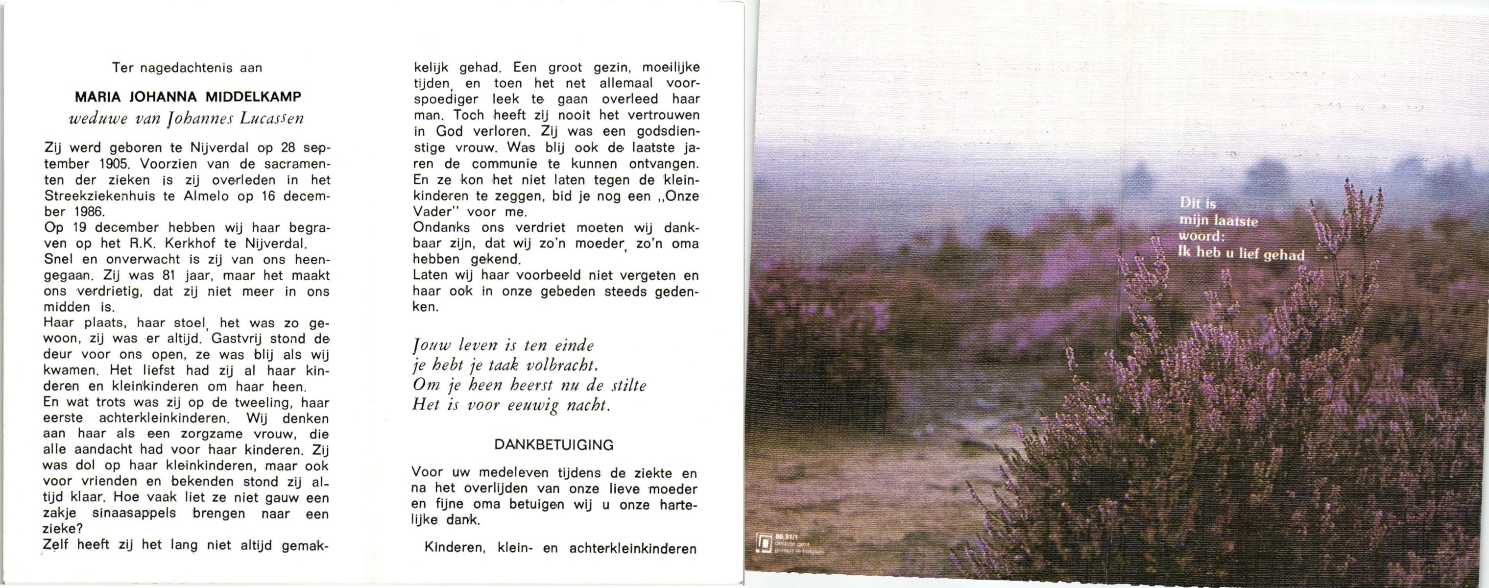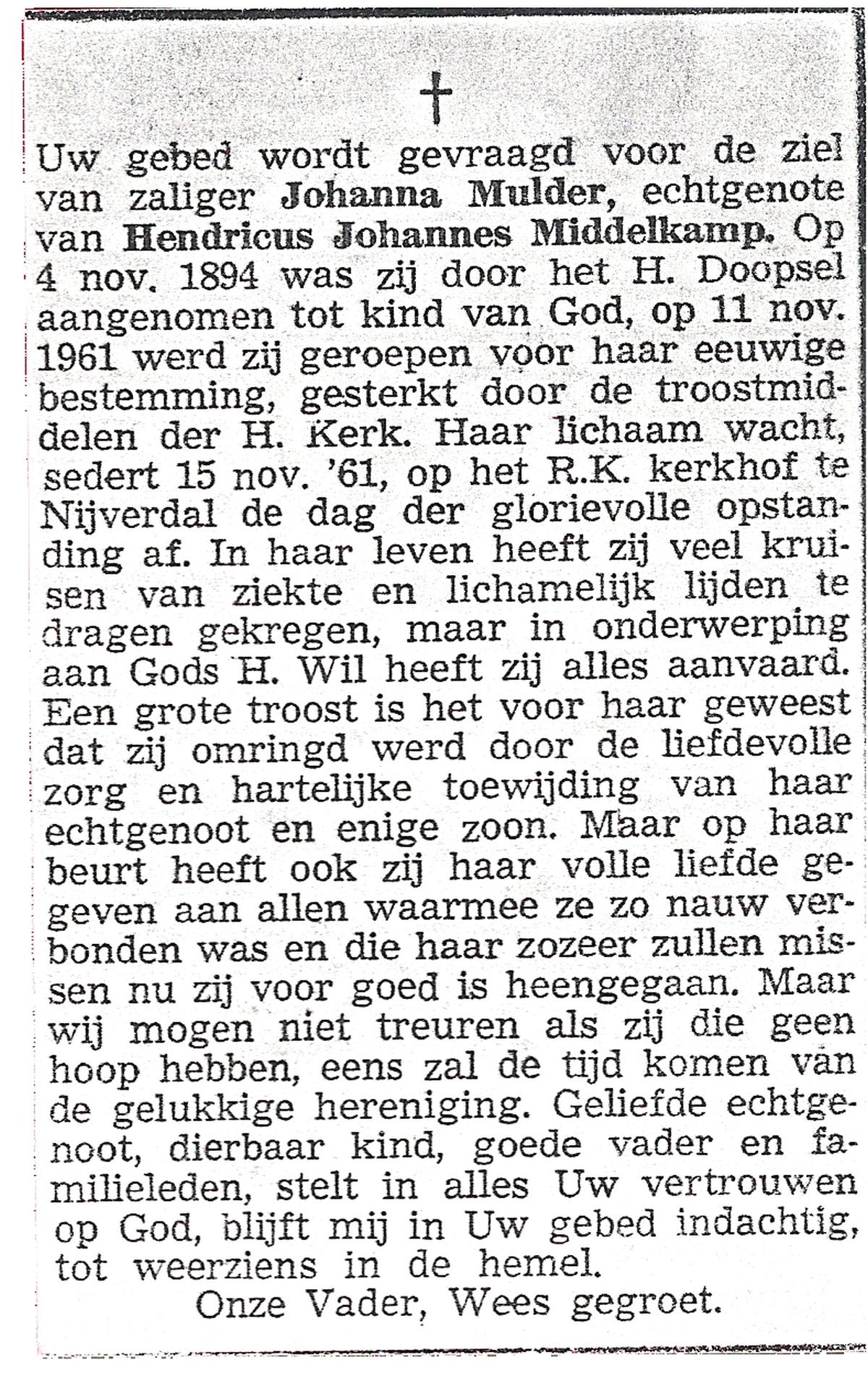 MIDDELKAMP, Maria Johanna, geboren op 28-9-1905 te Hellendoorn, Nijverdal, overleden op 16-12-1986 te Almelo, ziekenhuis op 81-jarige leeftijd, begraven op 19-12-1986 te Hellendoorn, Nijverdal, rk.