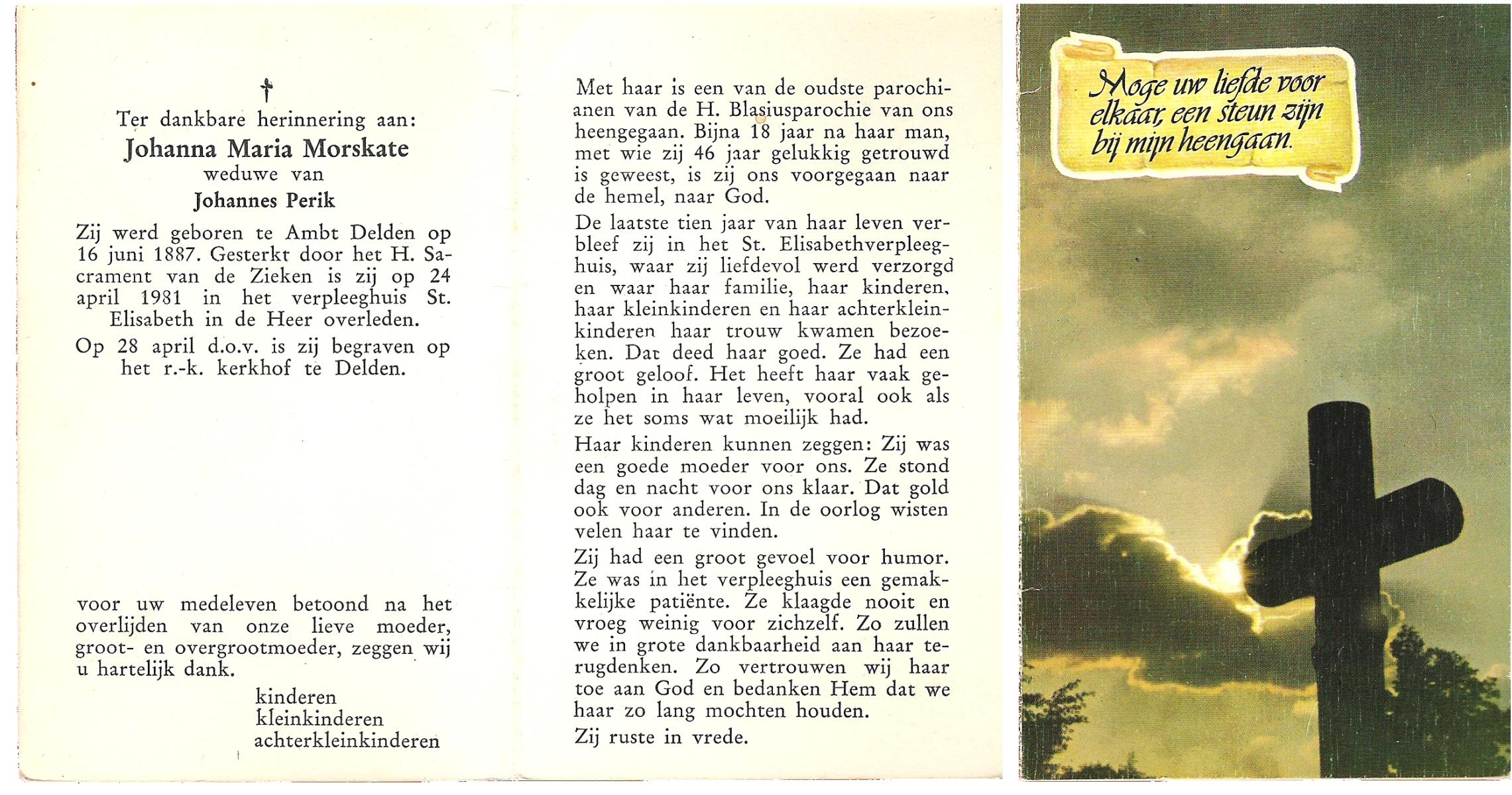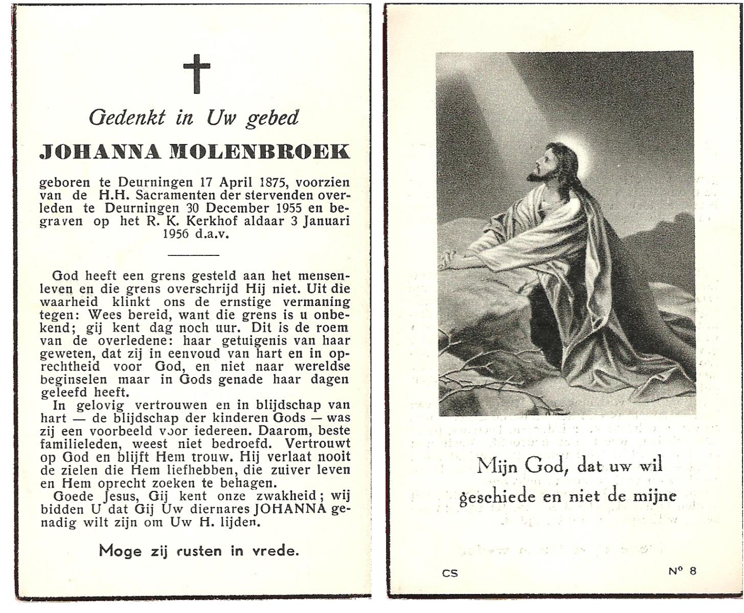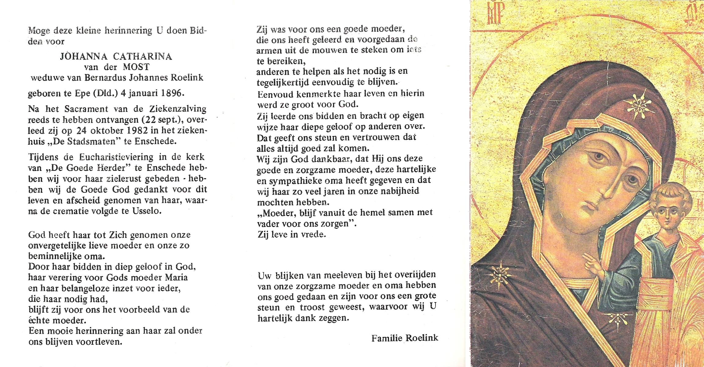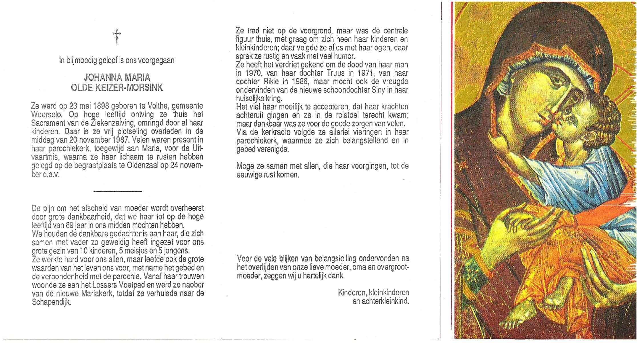 MIDDELKAMP, Maria Johanna, geboren op 28-9-1905 te Hellendoorn, Nijverdal, overleden op 16-12-1986 te Almelo, ziekenhuis op 81-jarige leeftijd, begraven op 19-12-1986 te Hellendoorn, Nijverdal, rk.