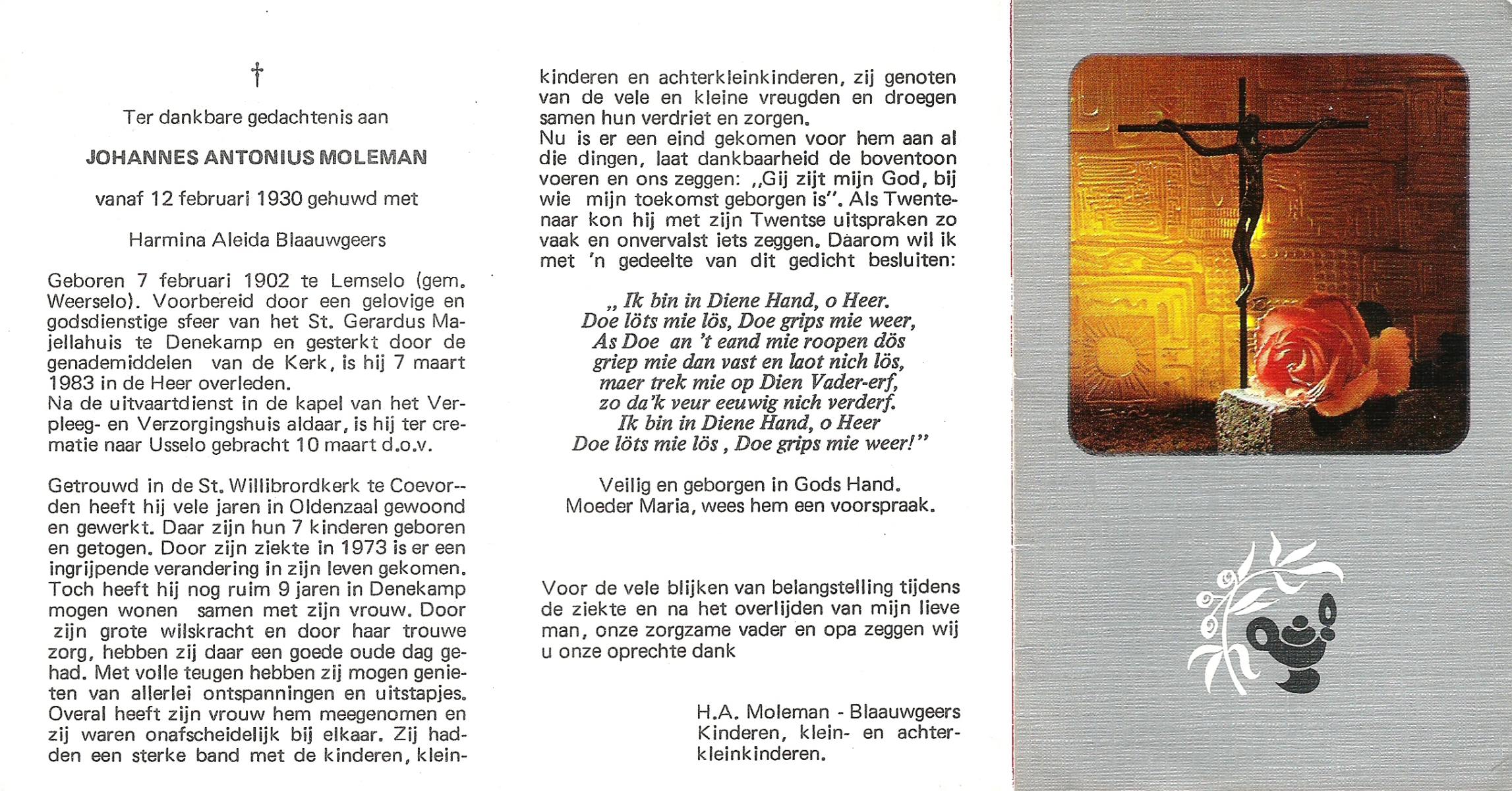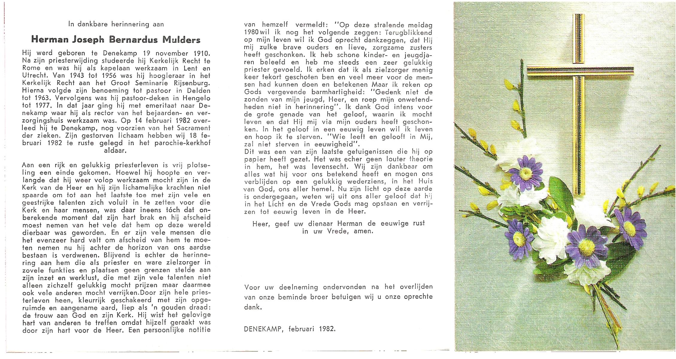 MULDERS, Herman Joseph Bernardus, geboren op 19-11-1910 te Denekamp, overleden op 14-2-1982 te Denekamp op 71-jarige leeftijd, begraven op 18-2-1982 te Denekamp.