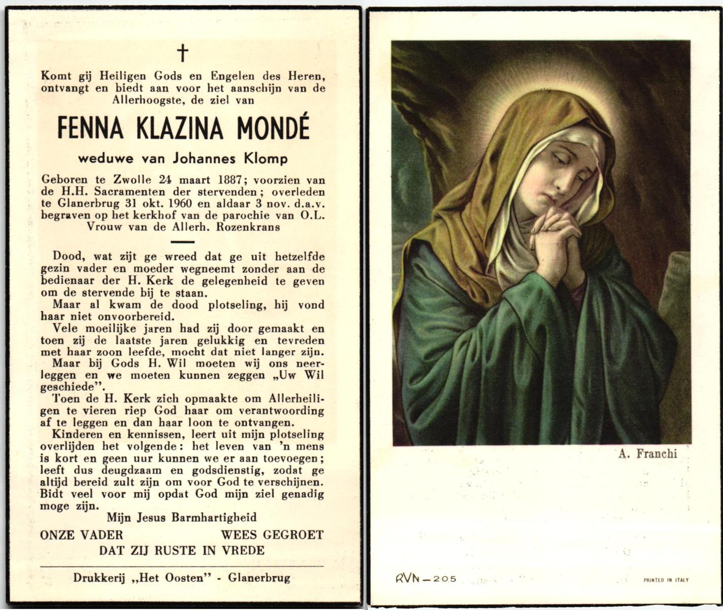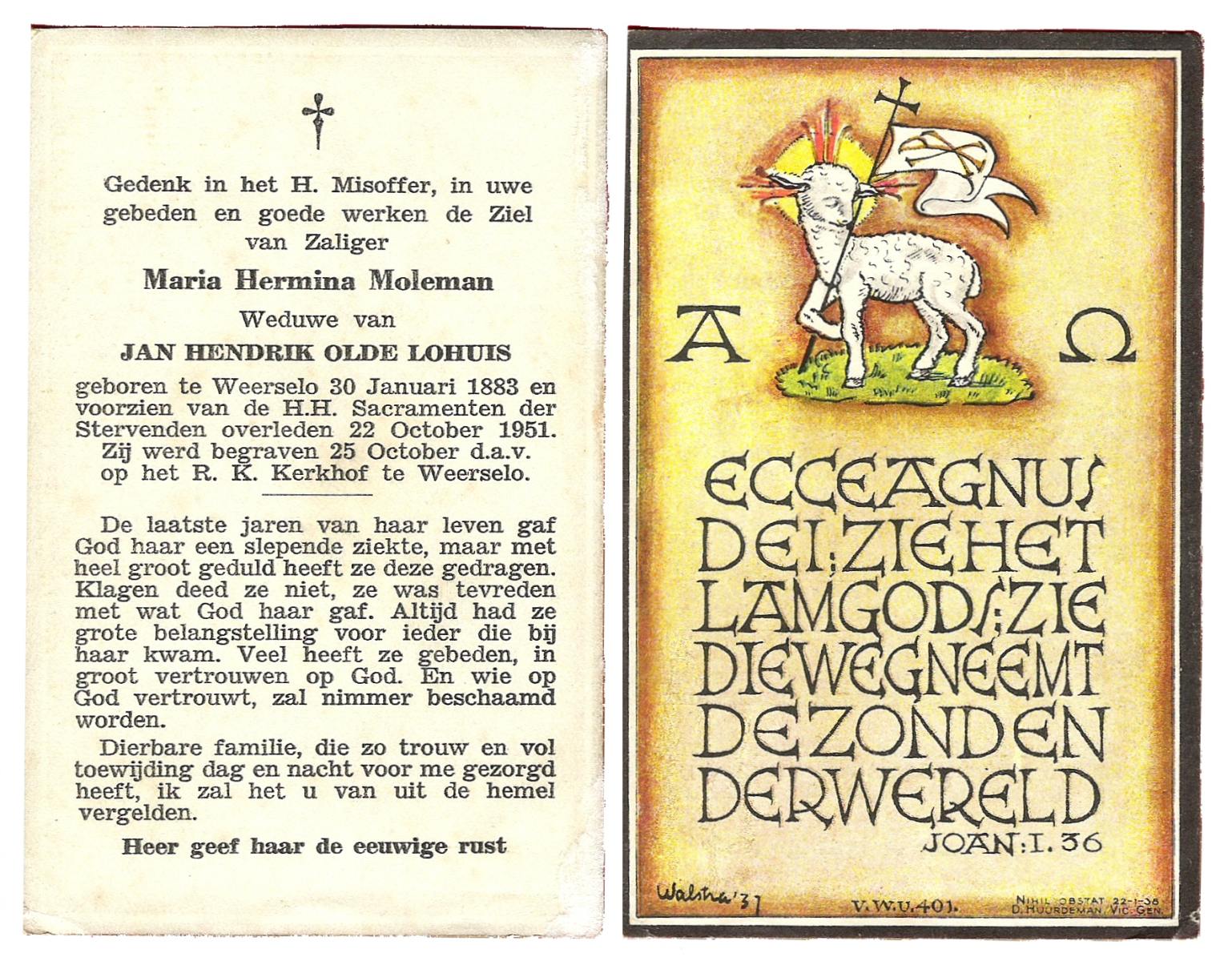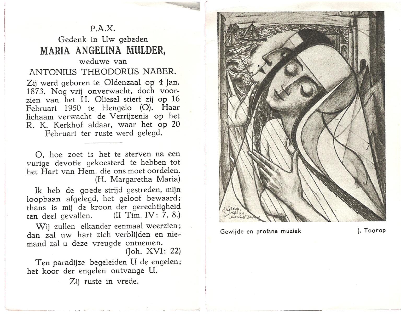 MULDER, Maria Angelina, geboren op 04-01-1873 te Oldenzaal, overleden op 16-2-1950 te Hengelo (Ov.) op 77-jarige leeftijd, begraven op 20-2-1950 te Hengelo (Ov.).