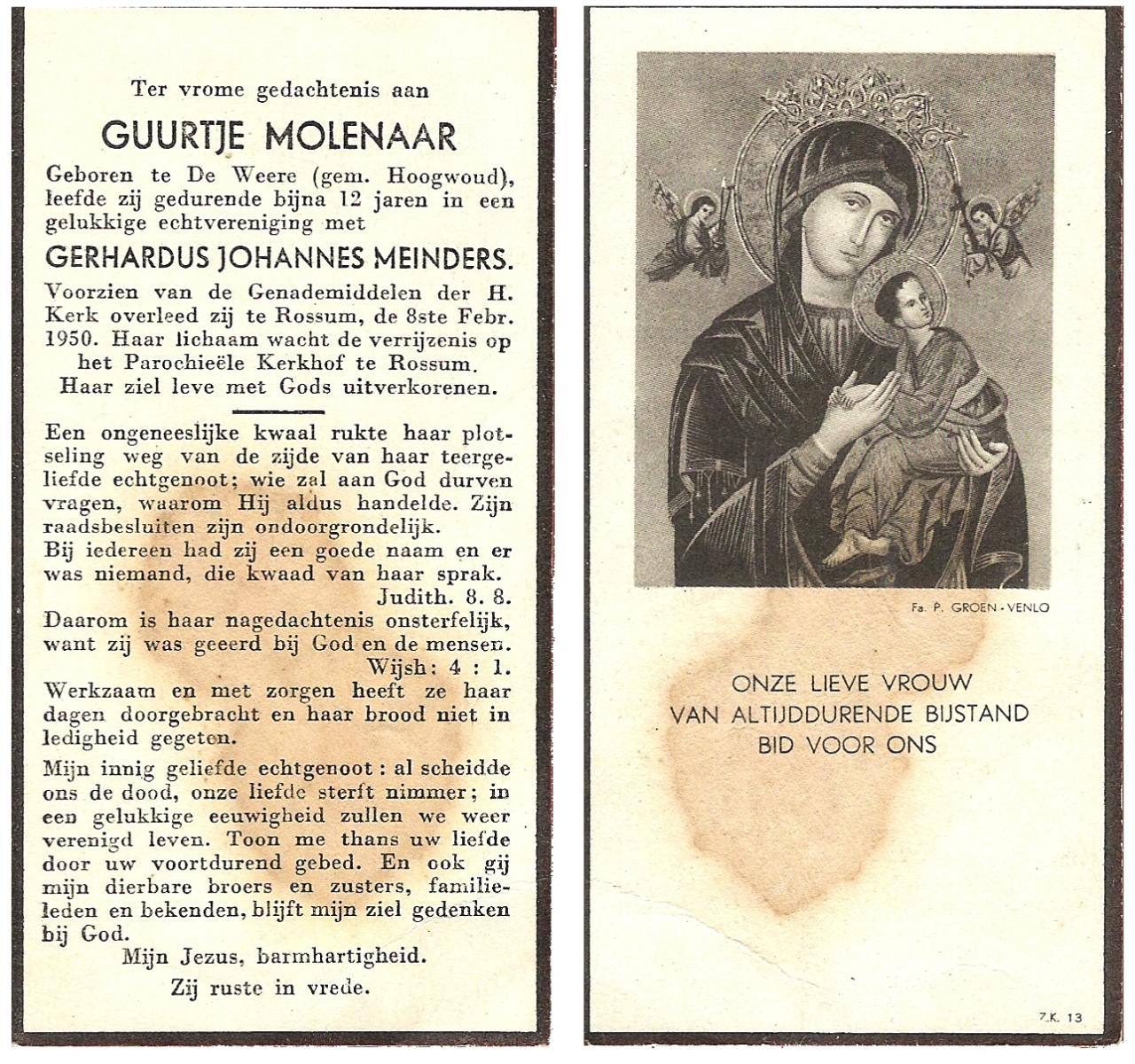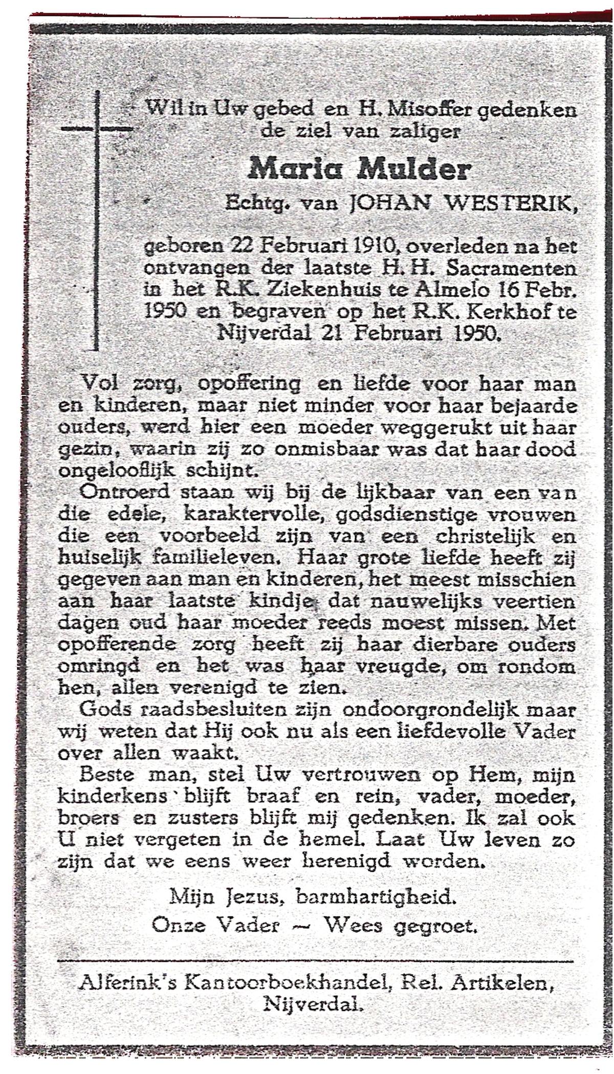 MULDER, Maria, geboren op 22-2-1910, overleden op 16-2-1950 te Almelo op 39-jarige leeftijd, begraven op 21-2-1950 te Hellendoorn, Nijverdal.