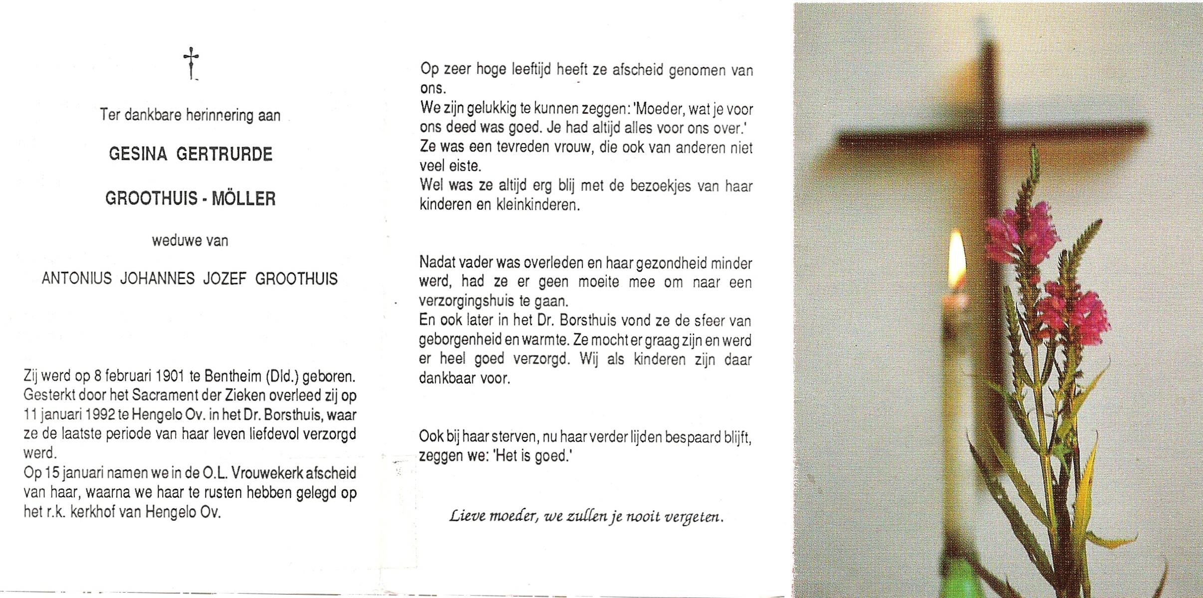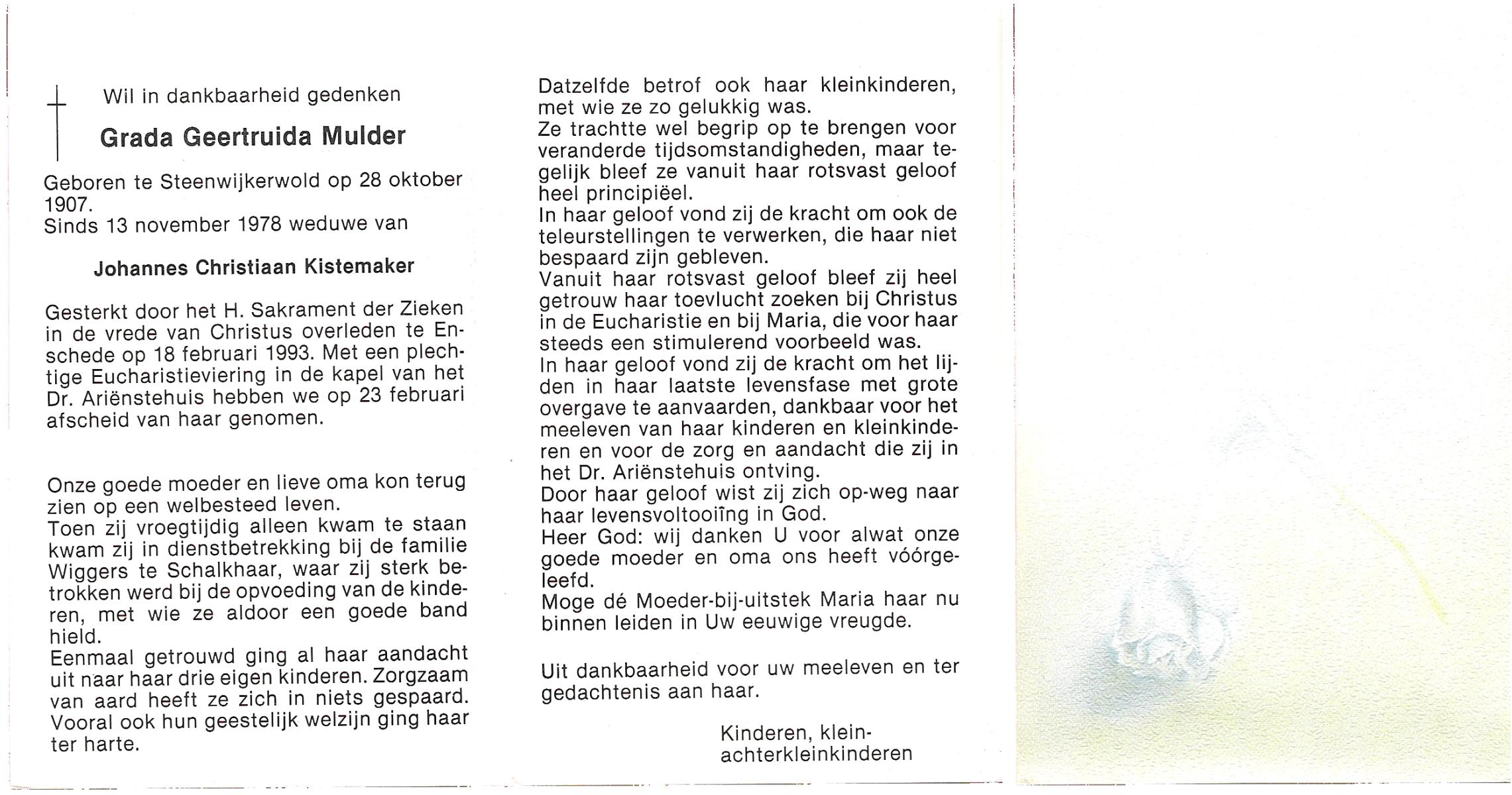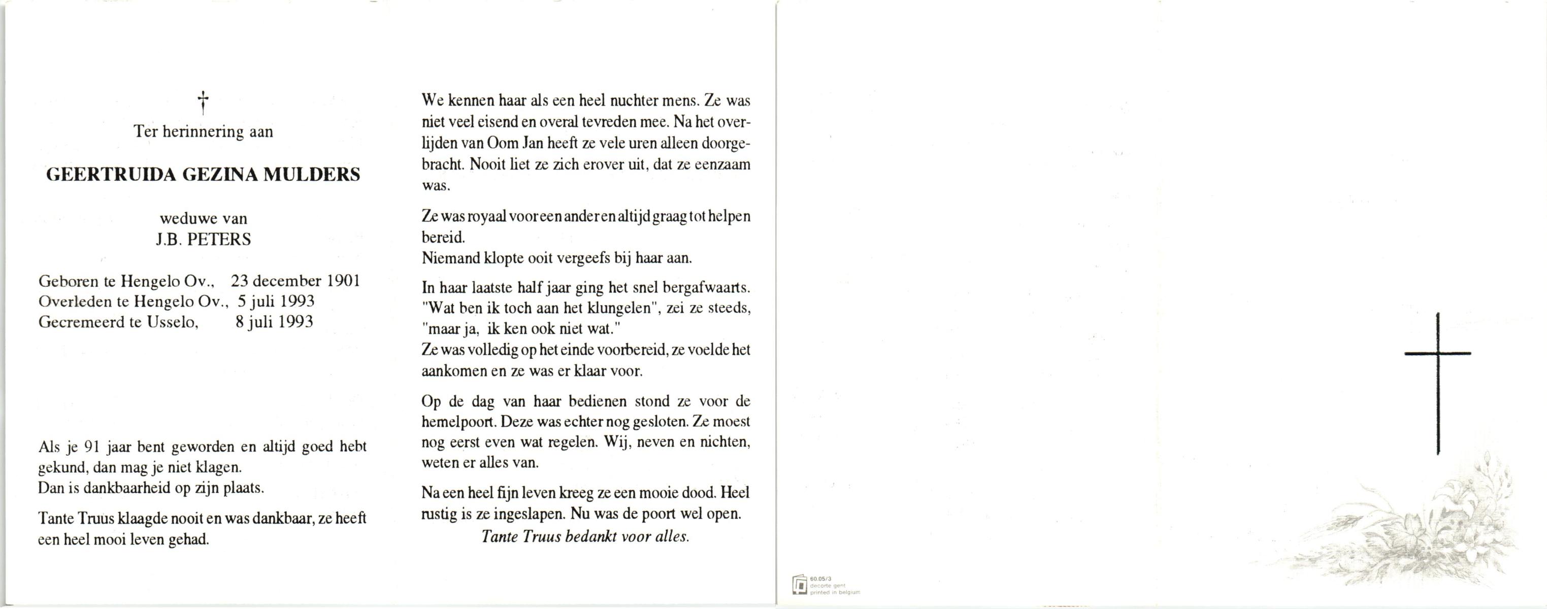 MULDERS, Geertruida Gezina, geboren op 23-12-1901 te Hengelo, overleden op 5-7-1993 te Hengelo op 91-jarige leeftijd, gecremeerd op 8-7-1993 te Usselo.