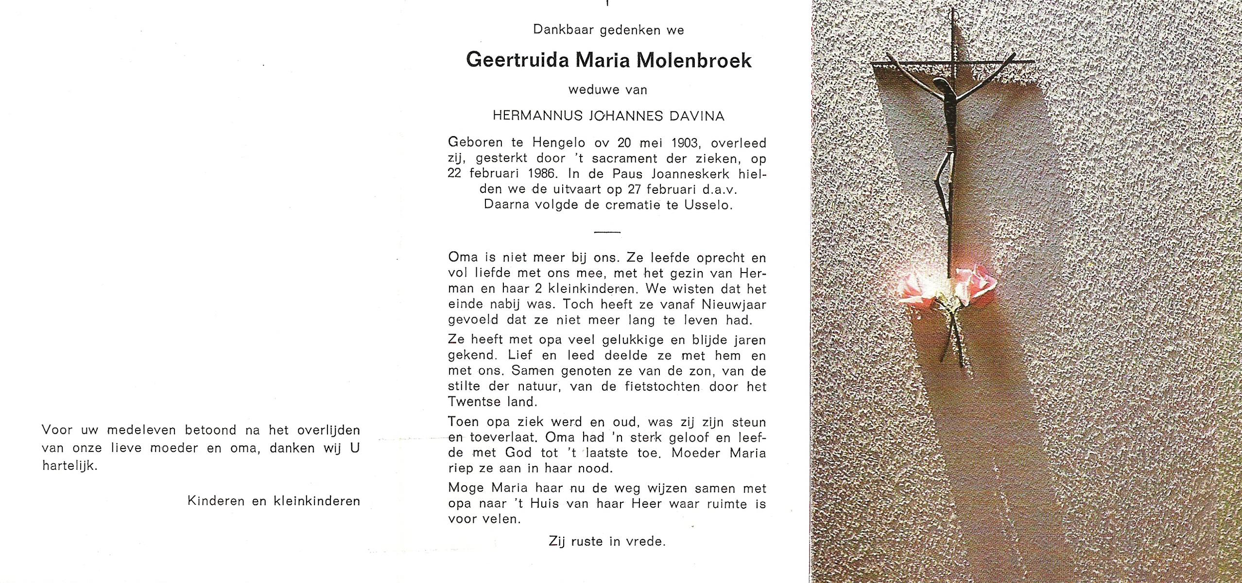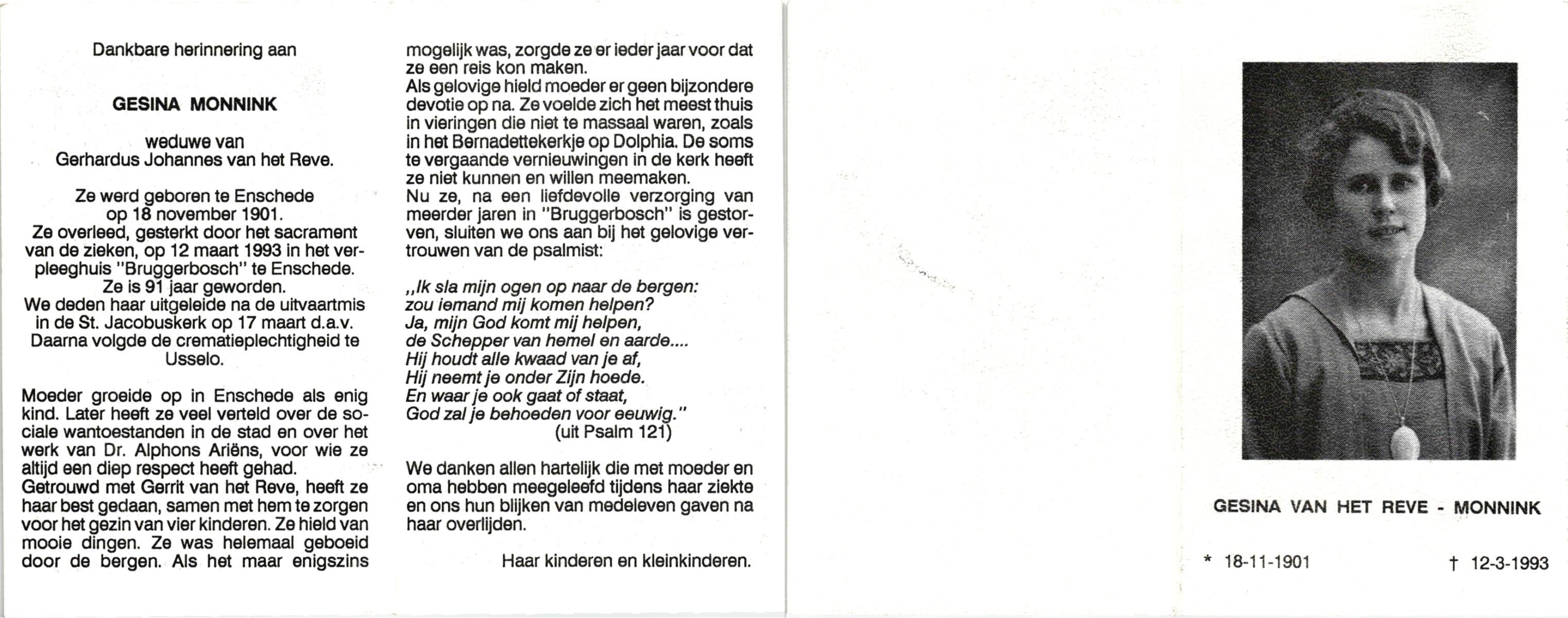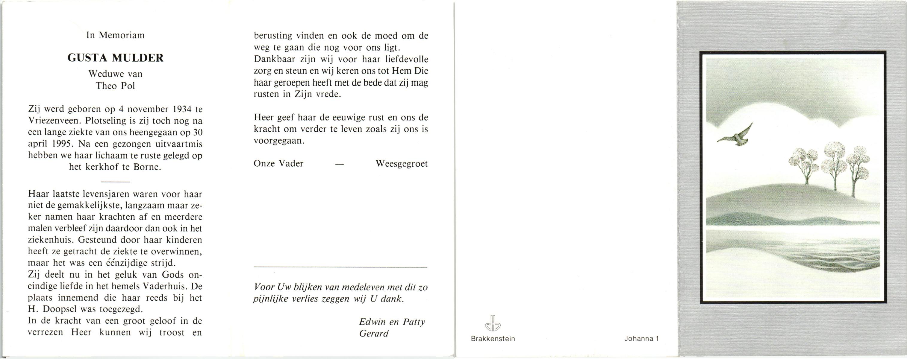 MULDERS, Geertruida Gezina, geboren op 23-12-1901 te Hengelo, overleden op 5-7-1993 te Hengelo op 91-jarige leeftijd, gecremeerd op 8-7-1993 te Usselo.