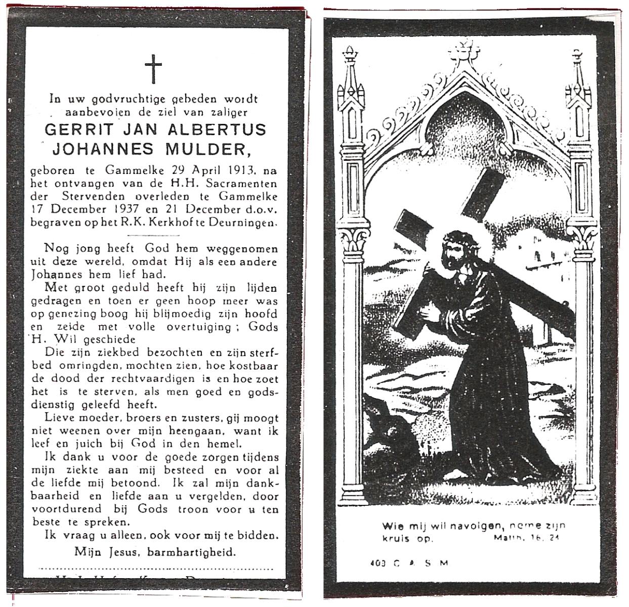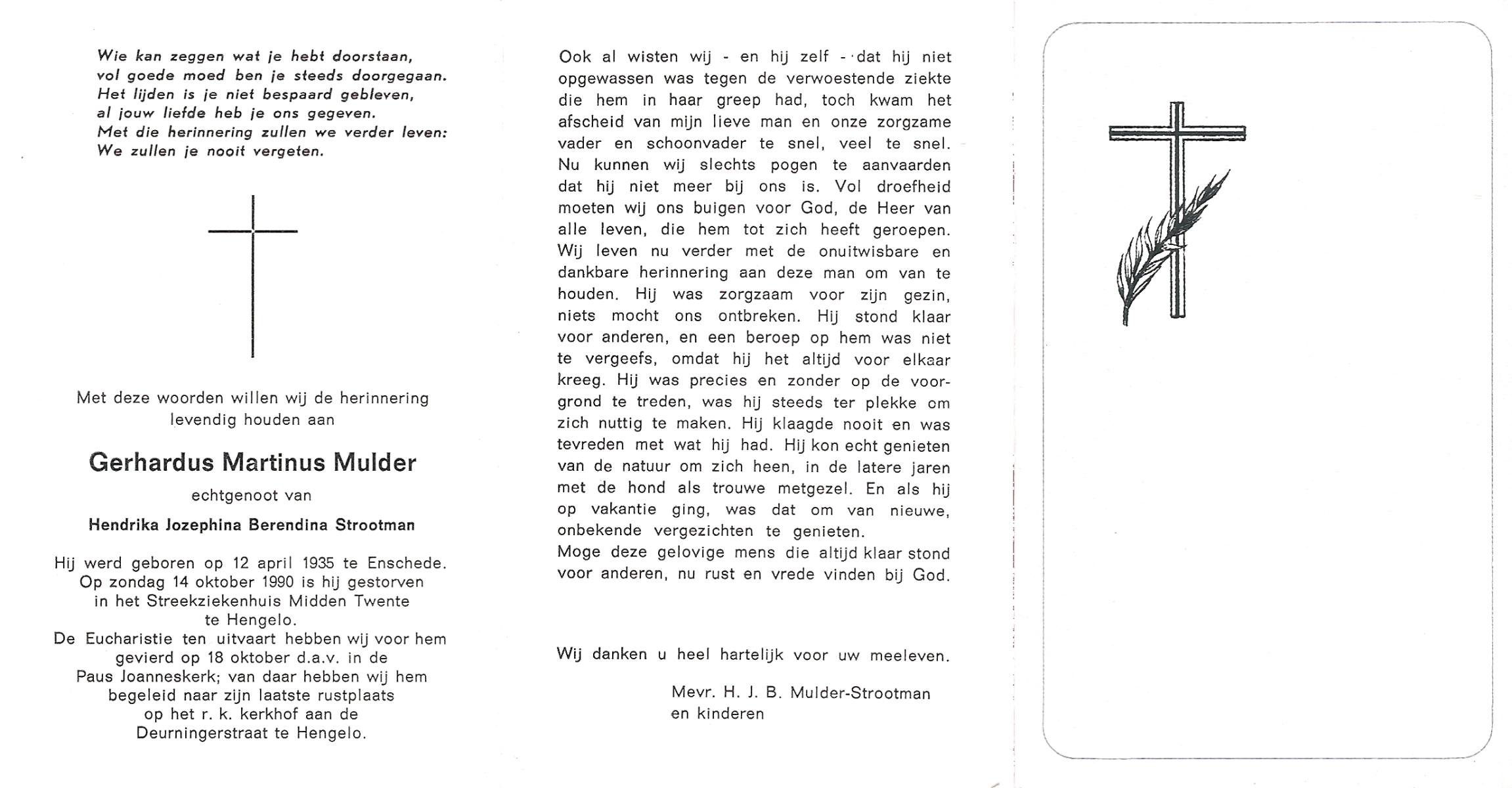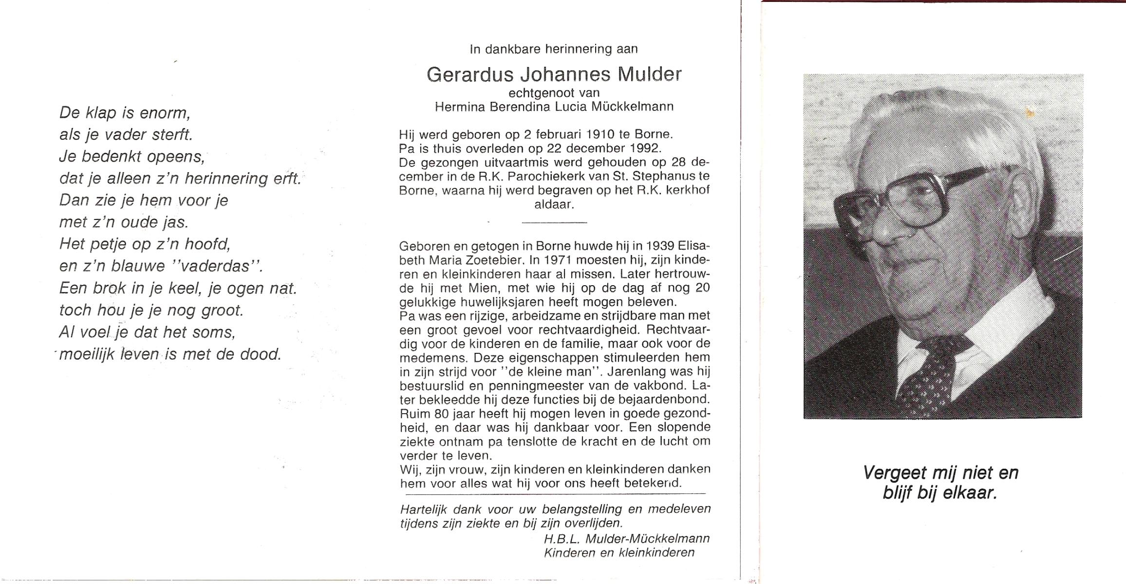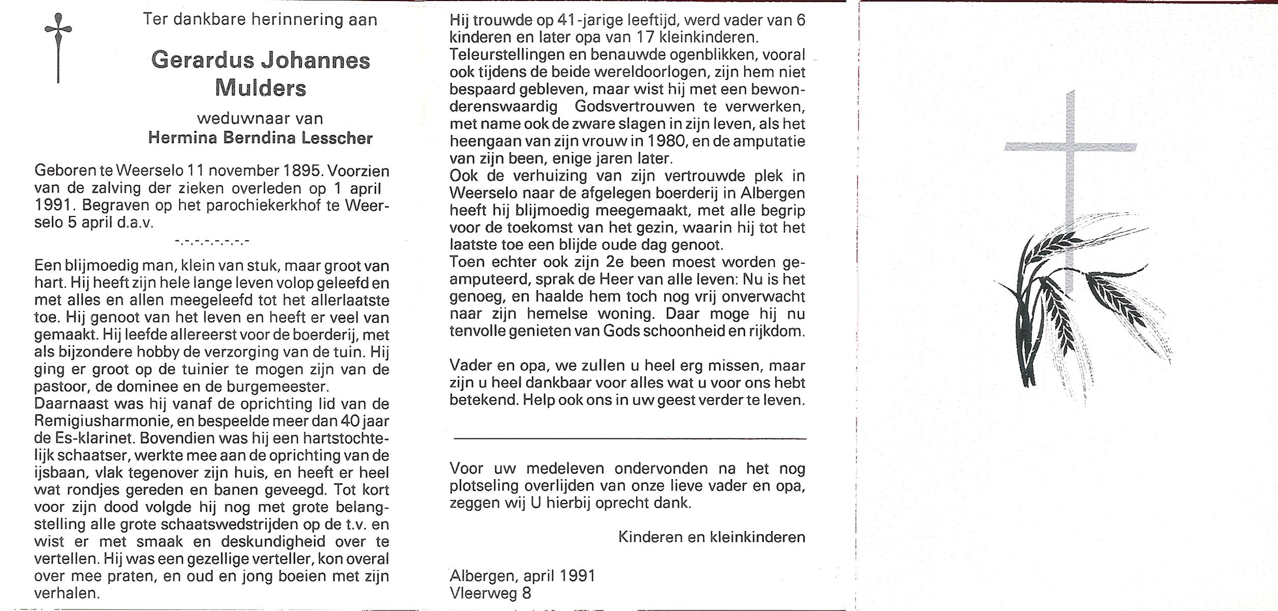 MULDERS, Gerardus Johannes, geboren op 11-11-1895 te Weerselo, overleden op 1-4-1991 op 95-jarige leeftijd, begraven op 5-4-1991 te Weerselo.