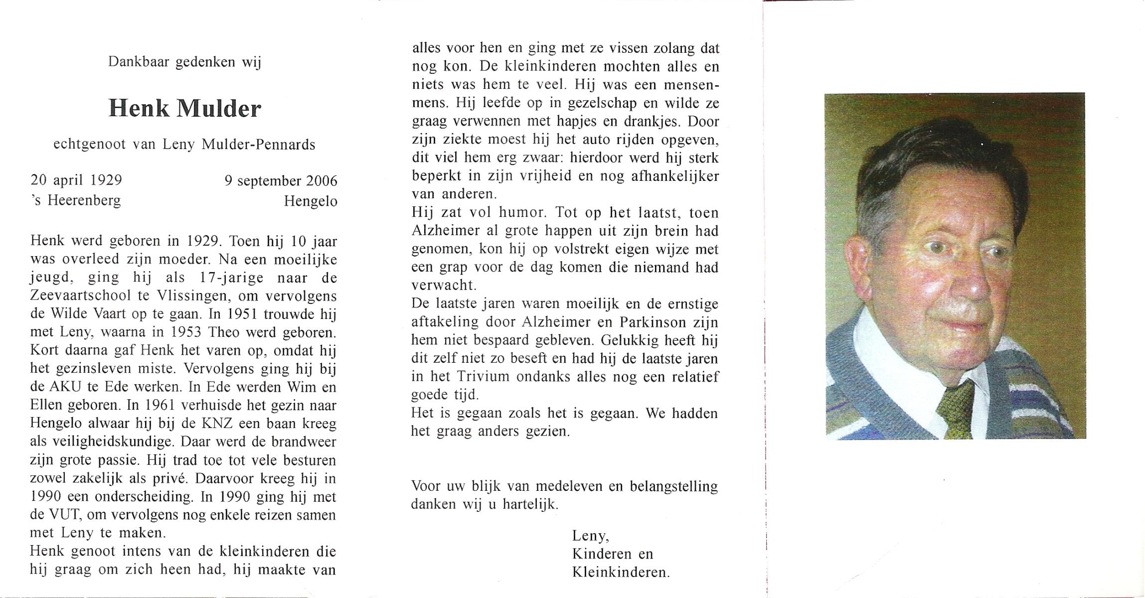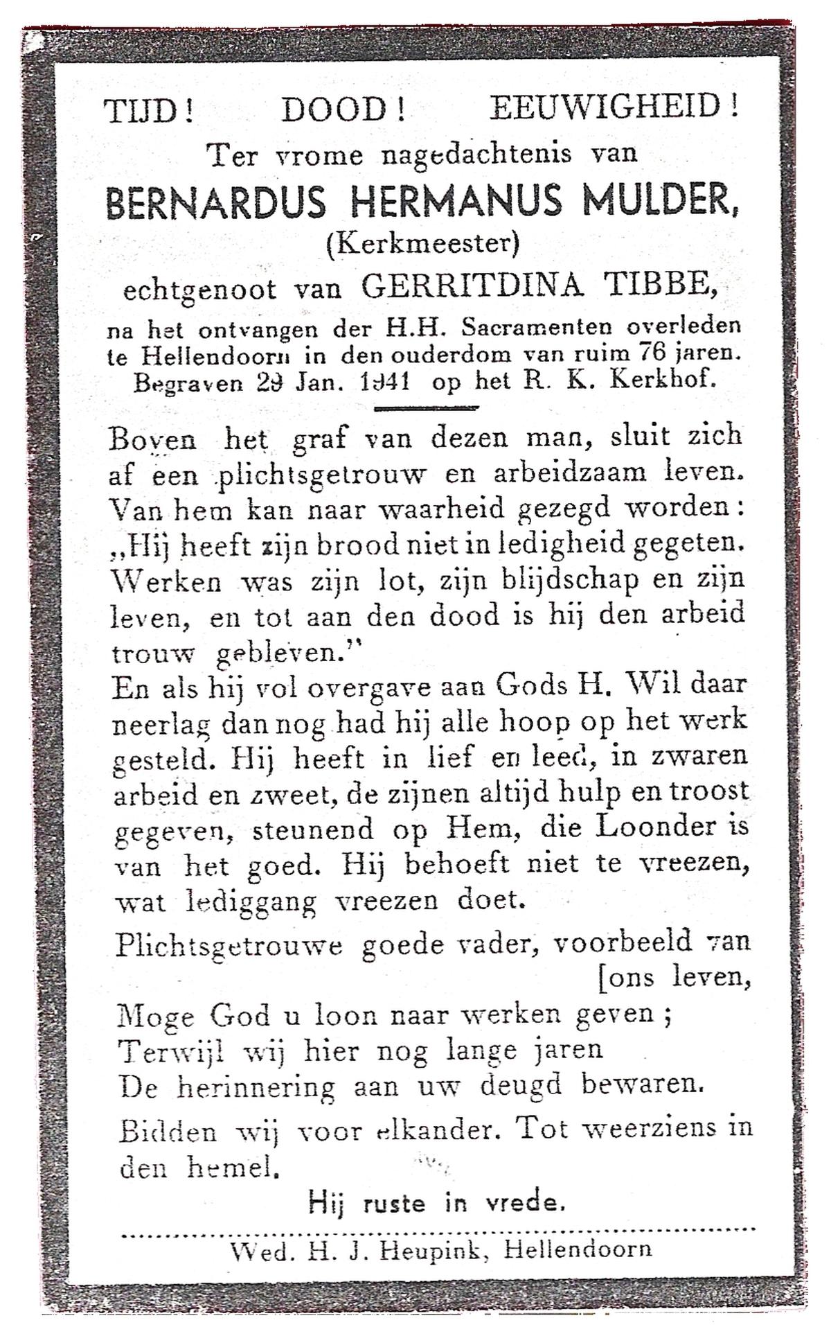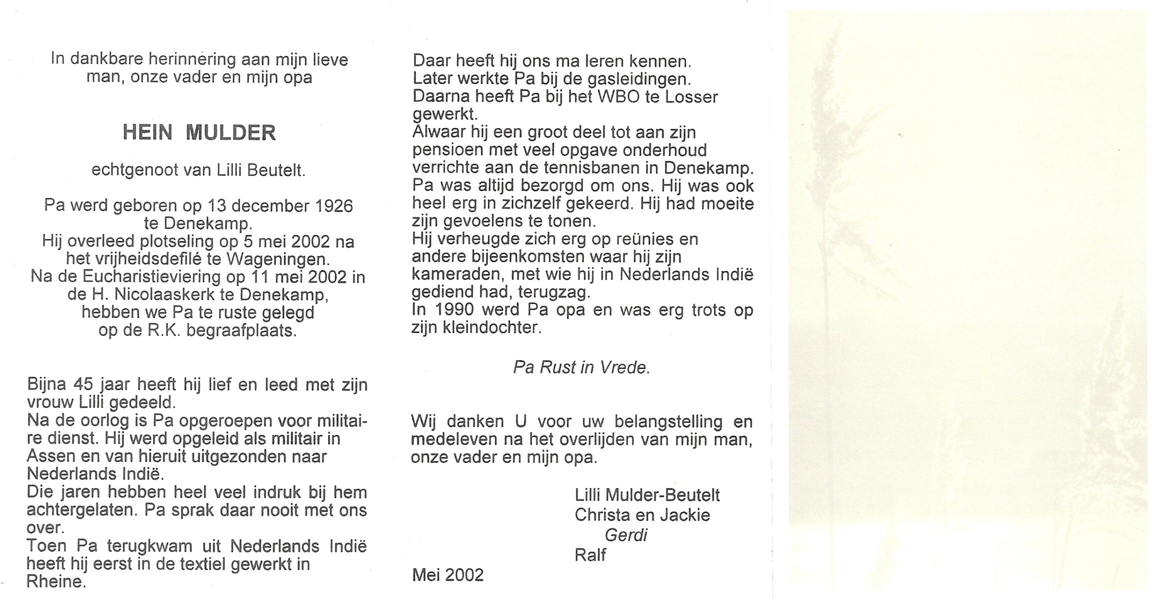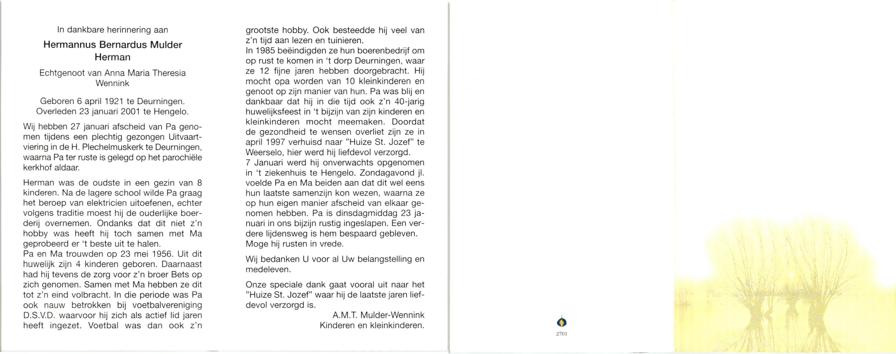 MULDER, , Hermannus Bernardus (Herman), geboren op 6-4-1921 te Deurningen, overleden op 23-1-2001 te Hengelo (O) op 79-jarige leeftijd, begraven op 27-1-2001 te Deurningen.