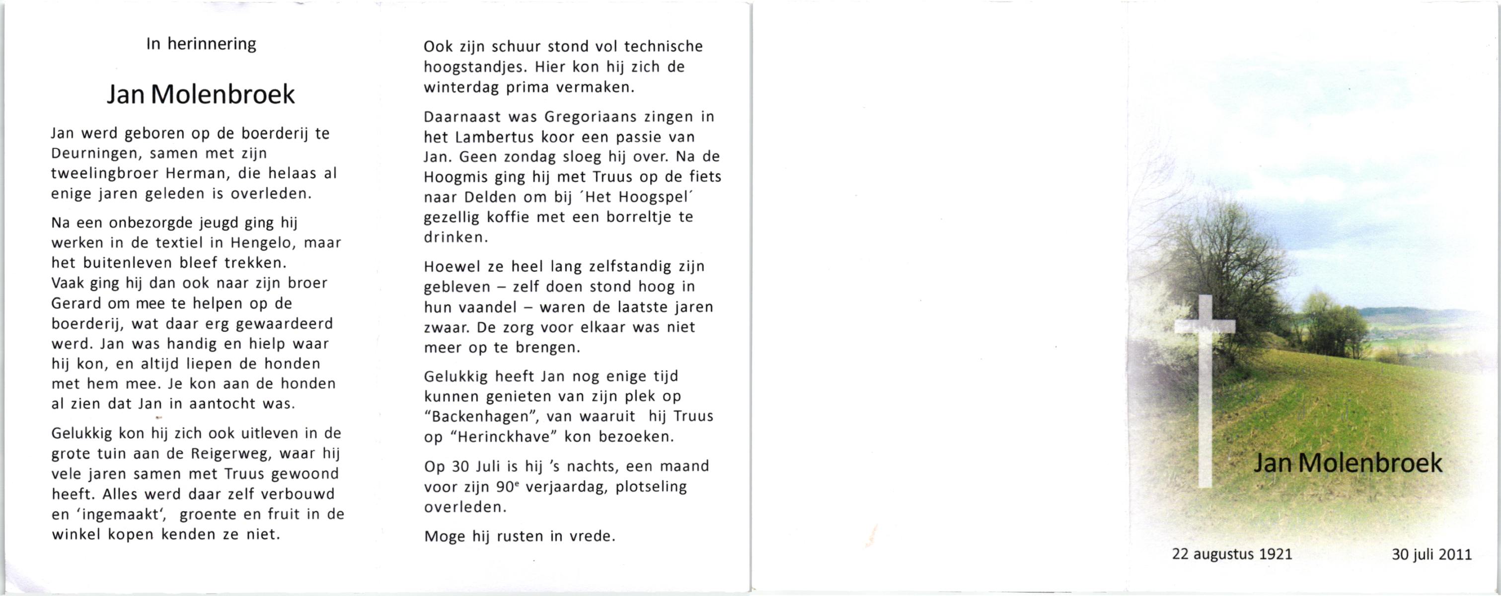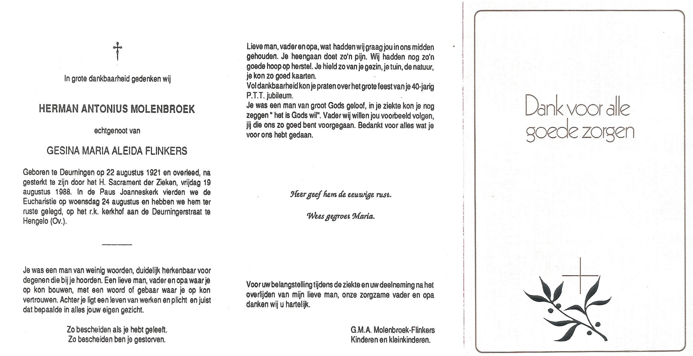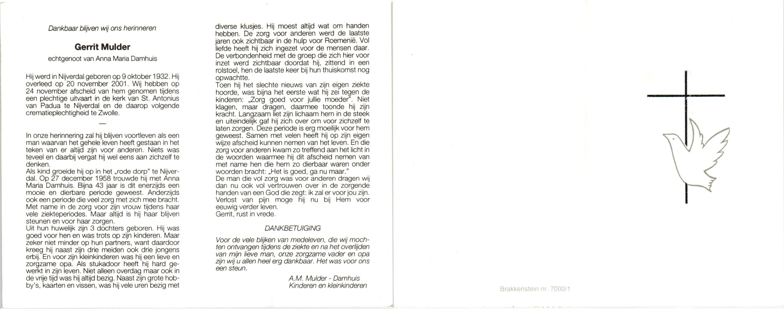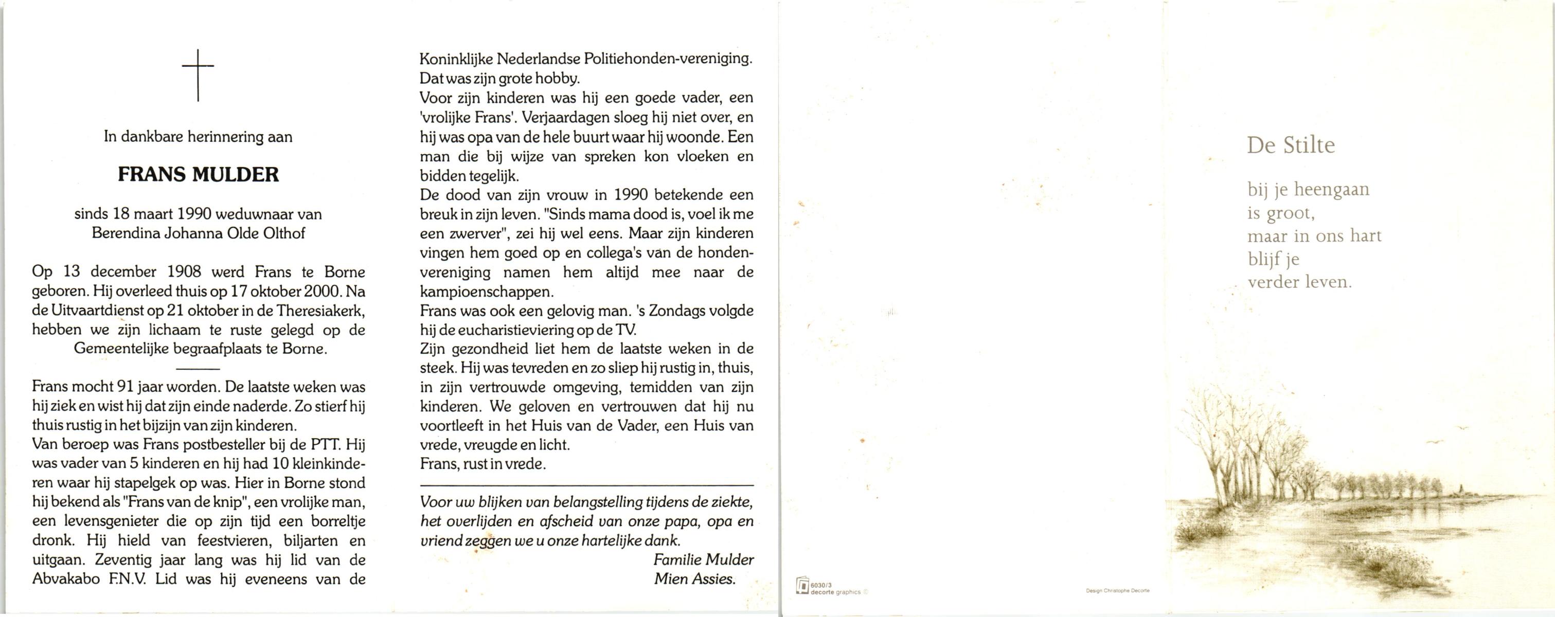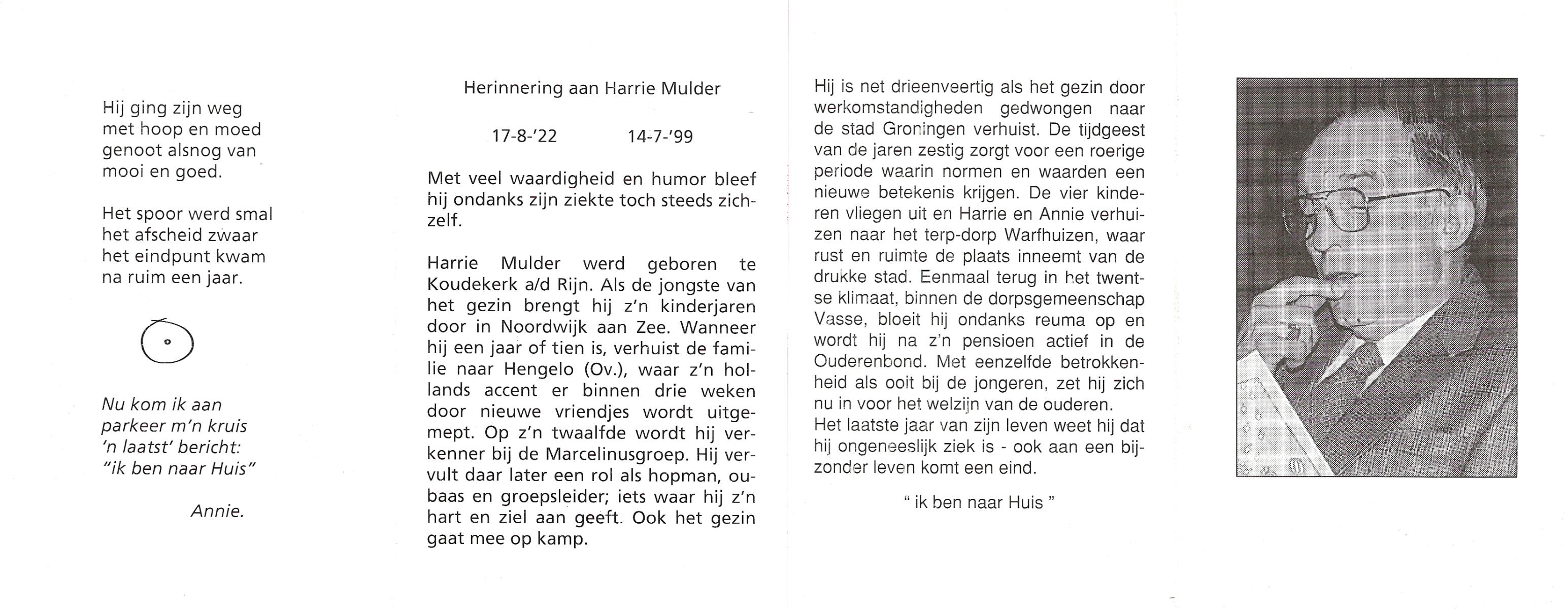 MULDER, , Hermannus Bernardus (Herman), geboren op 6-4-1921 te Deurningen, overleden op 23-1-2001 te Hengelo (O) op 79-jarige leeftijd, begraven op 27-1-2001 te Deurningen.
