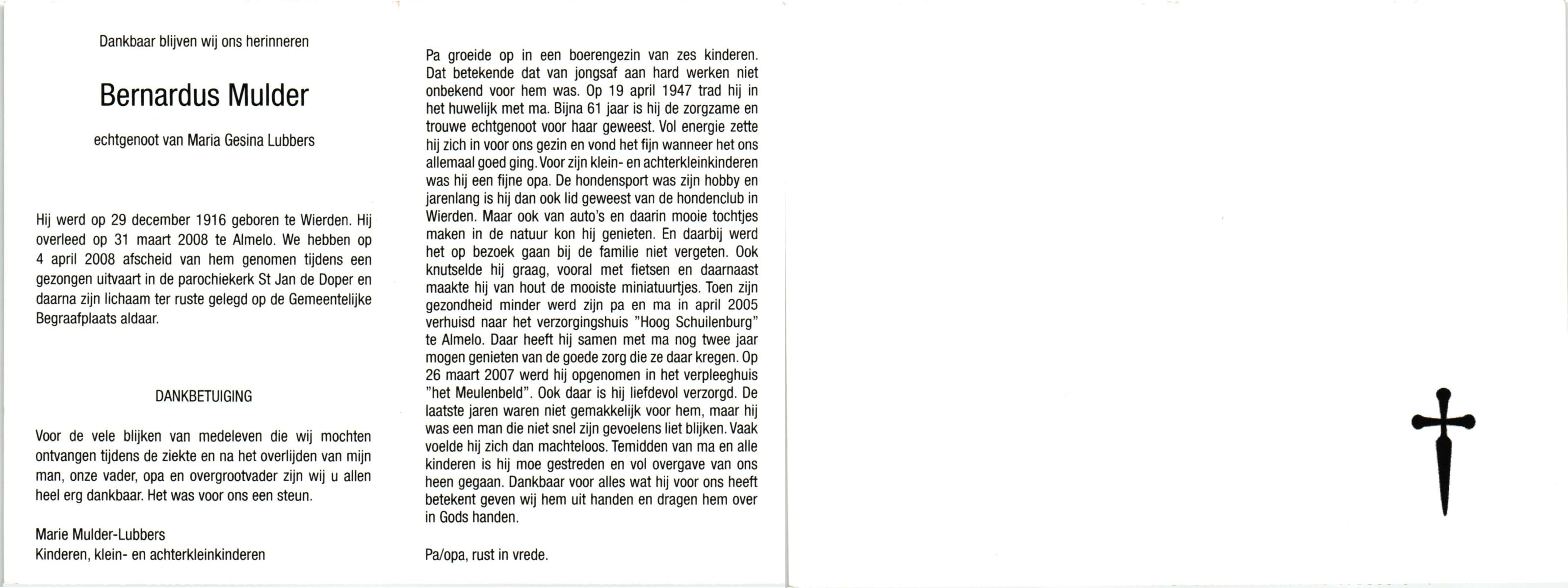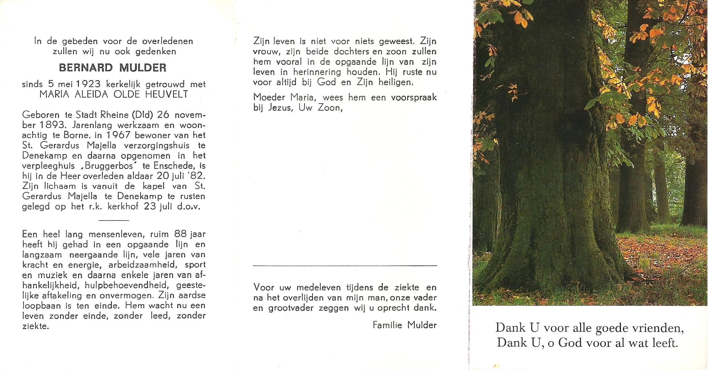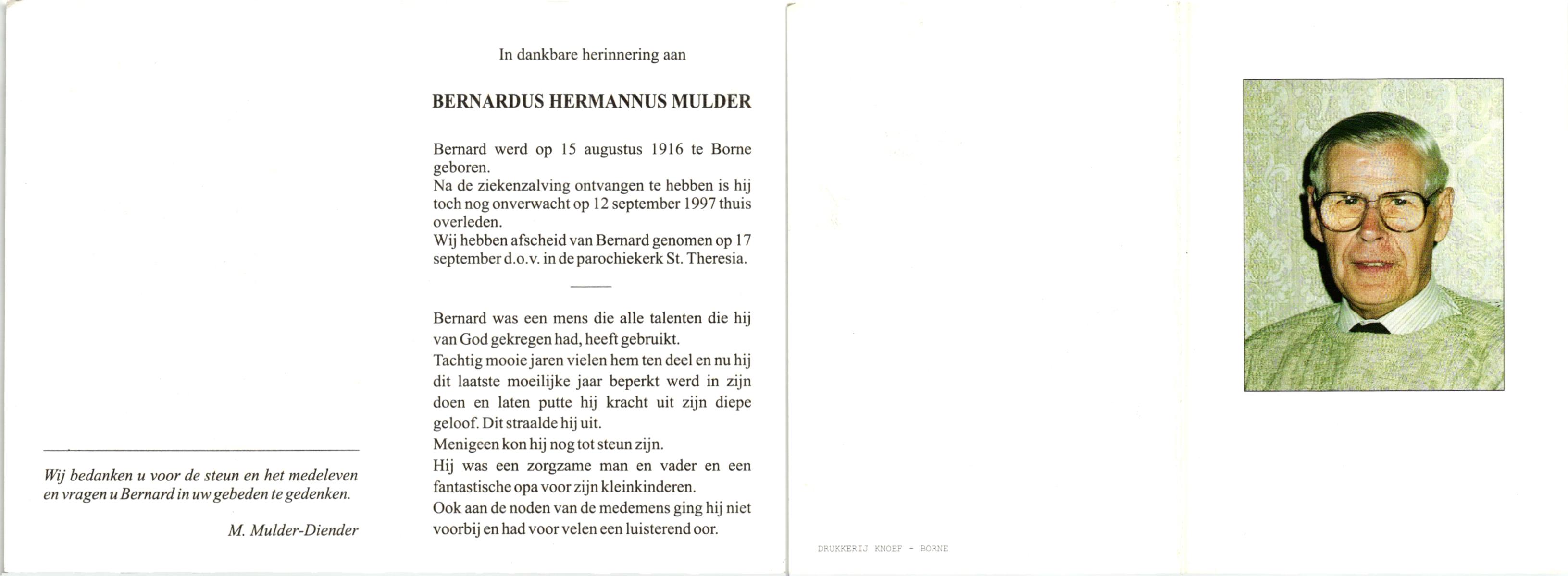 MULDER, , Bernardus Hermannus, geboren op 15-8-1916 te Borne, overleden op 12-9-1997 te Borne op 80-jarige leeftijd.