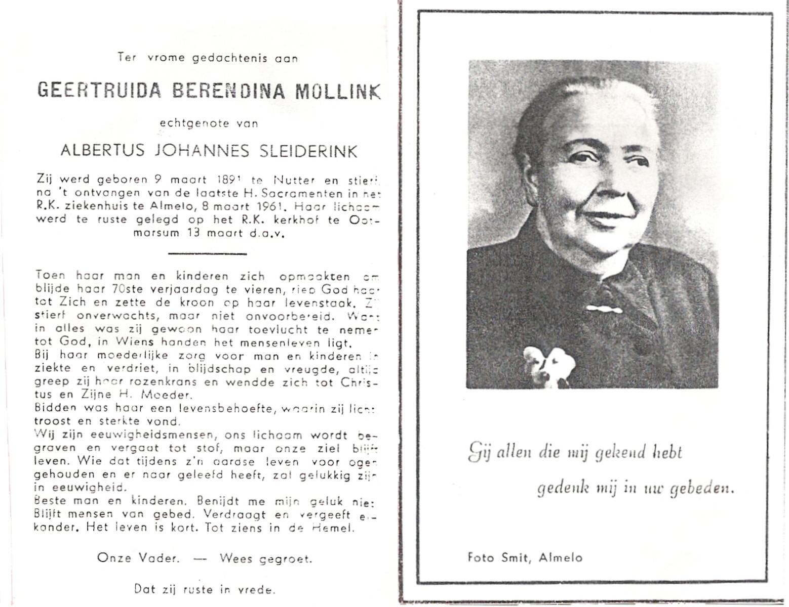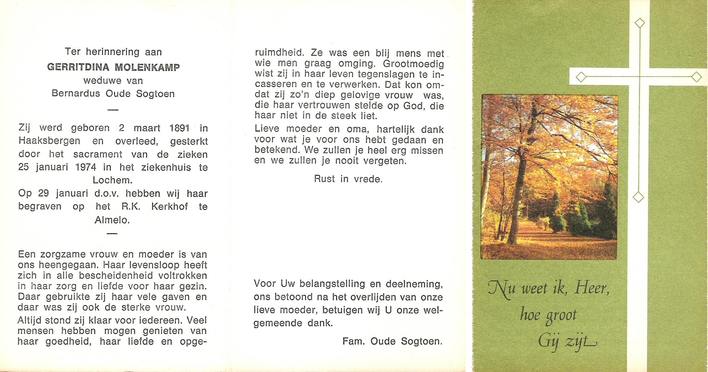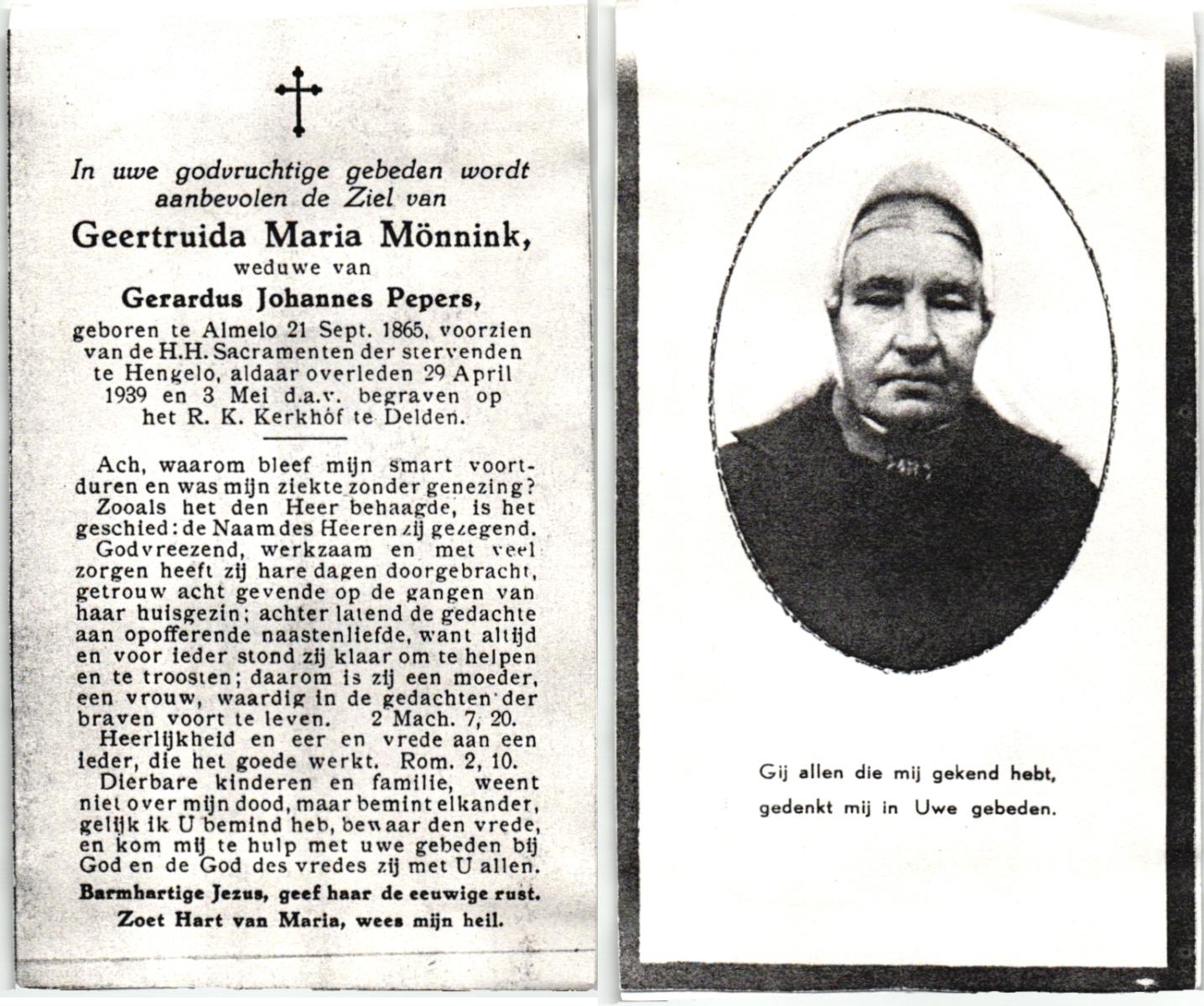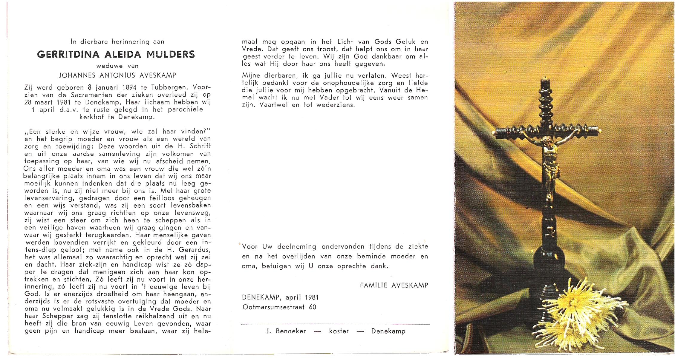 MULDERS, Gerritdina Aleida, geboren op 08-01-1894 te Tubbergen, overleden op 28-3-1981 te Denekamp op 87-jarige leeftijd, begraven op 1-4-1981 te Denekamp.