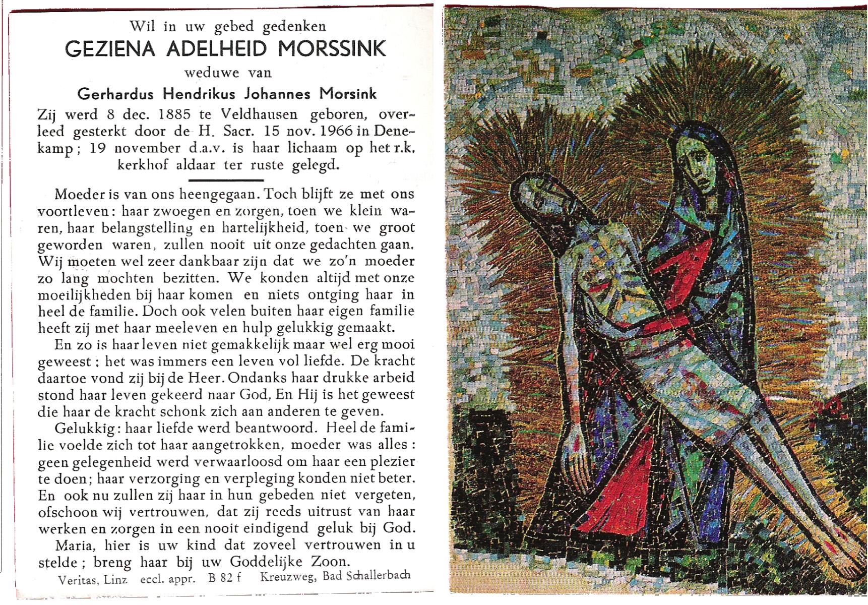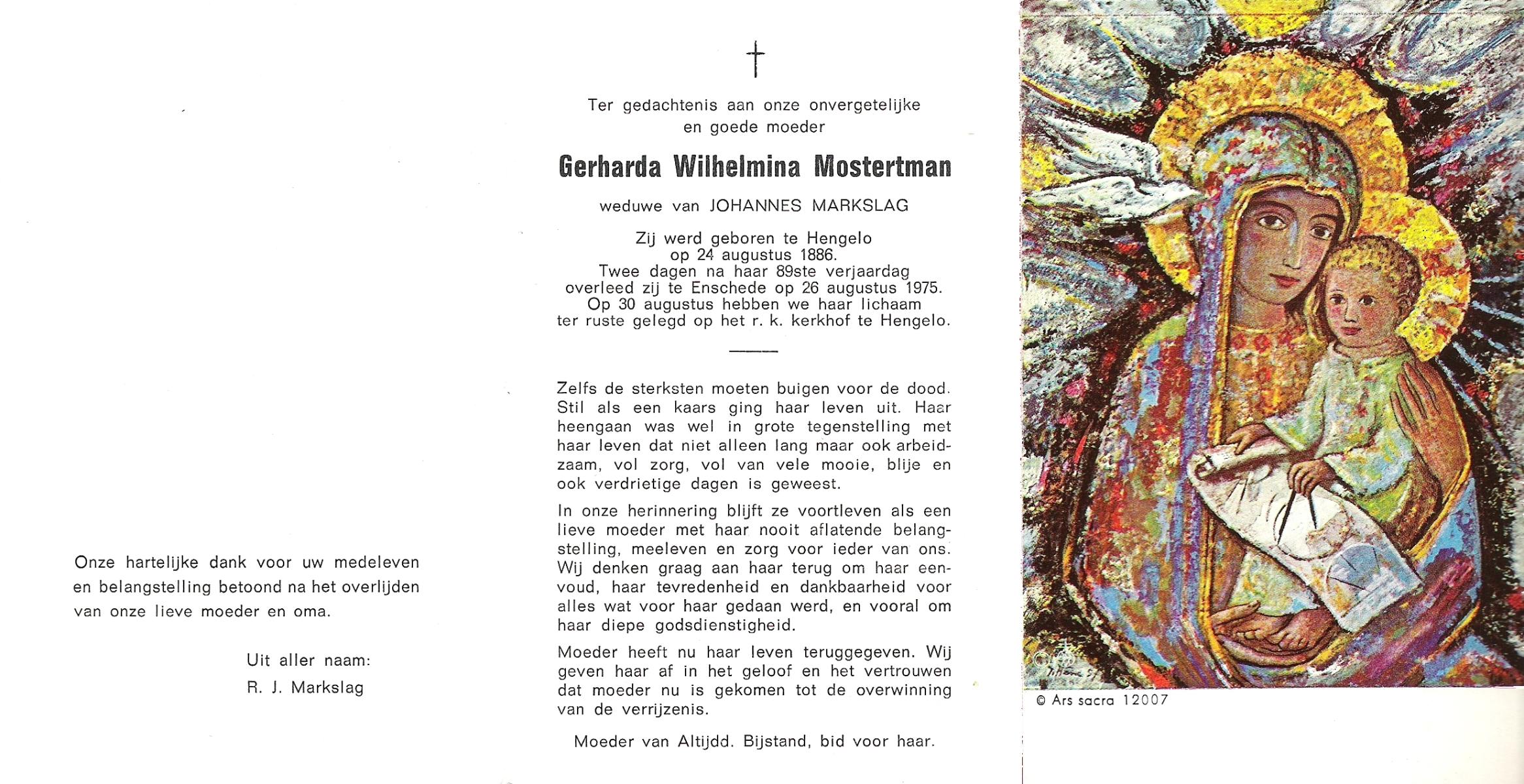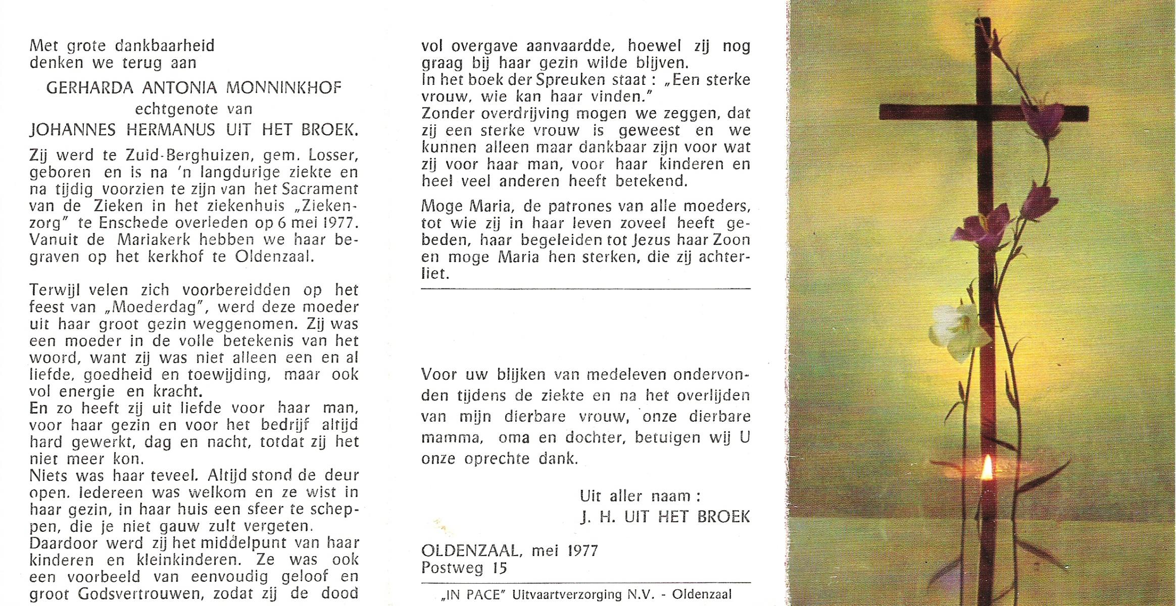 MULDERS, Gerritdina Aleida, geboren op 08-01-1894 te Tubbergen, overleden op 28-3-1981 te Denekamp op 87-jarige leeftijd, begraven op 1-4-1981 te Denekamp.