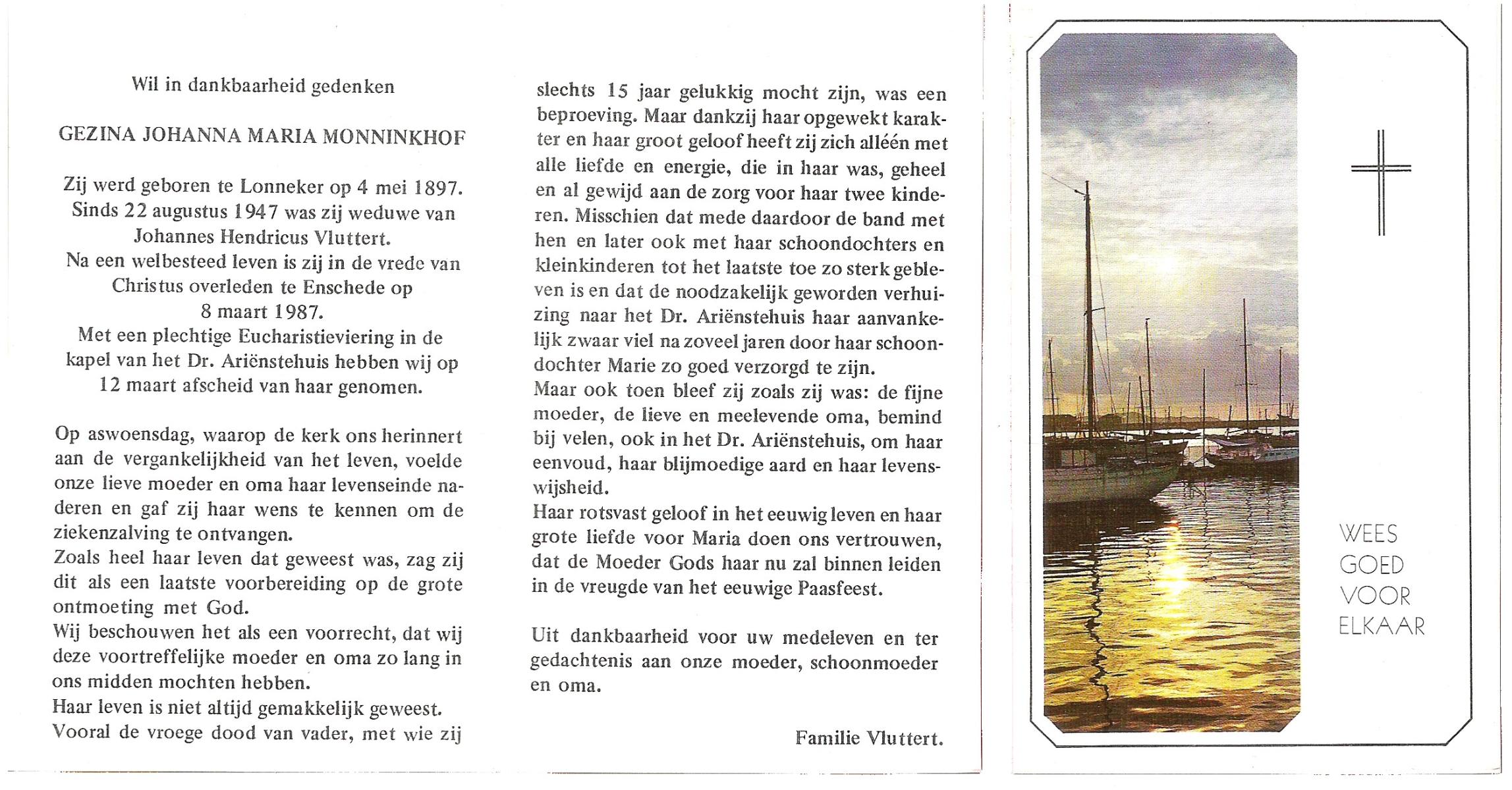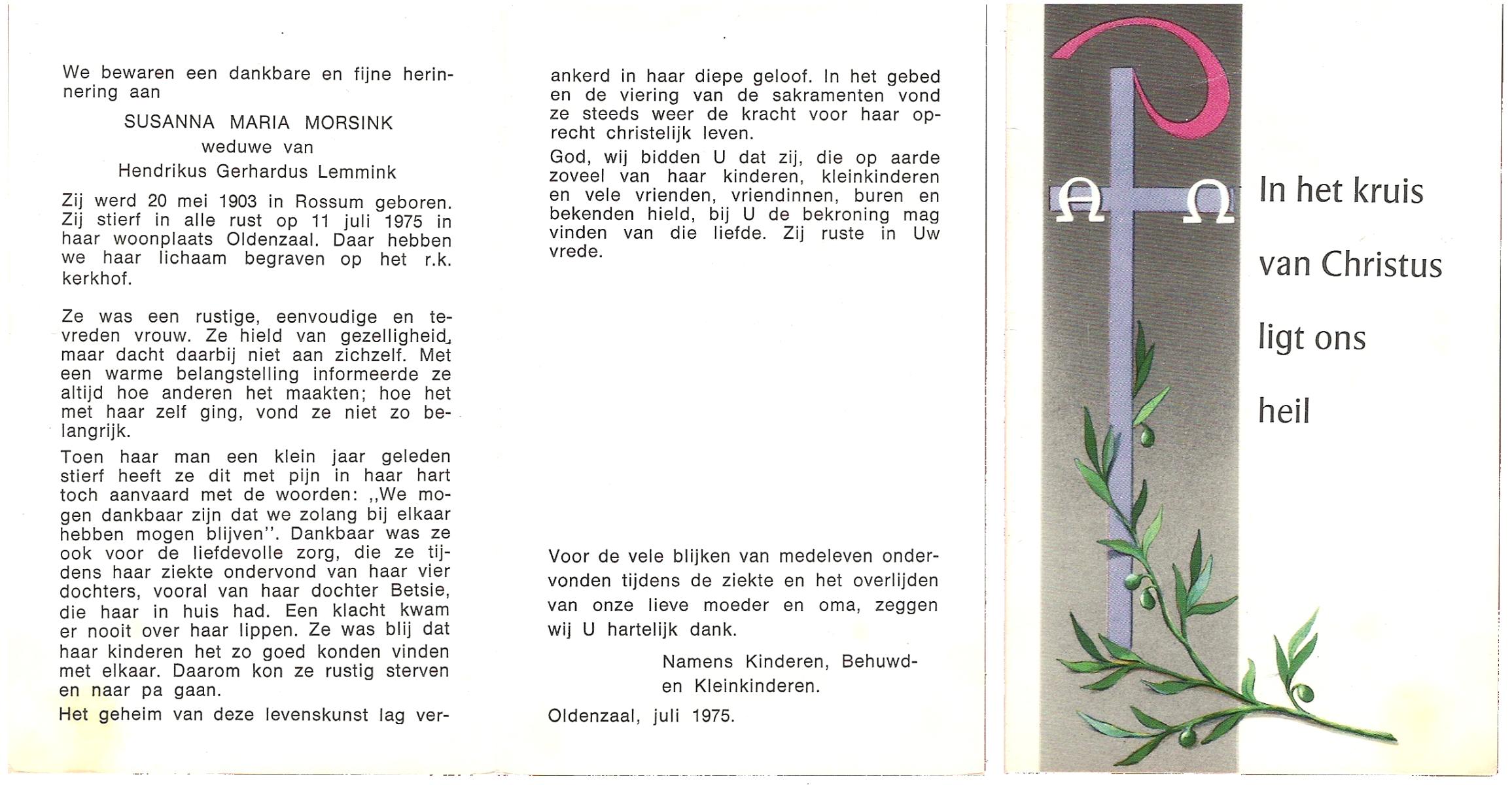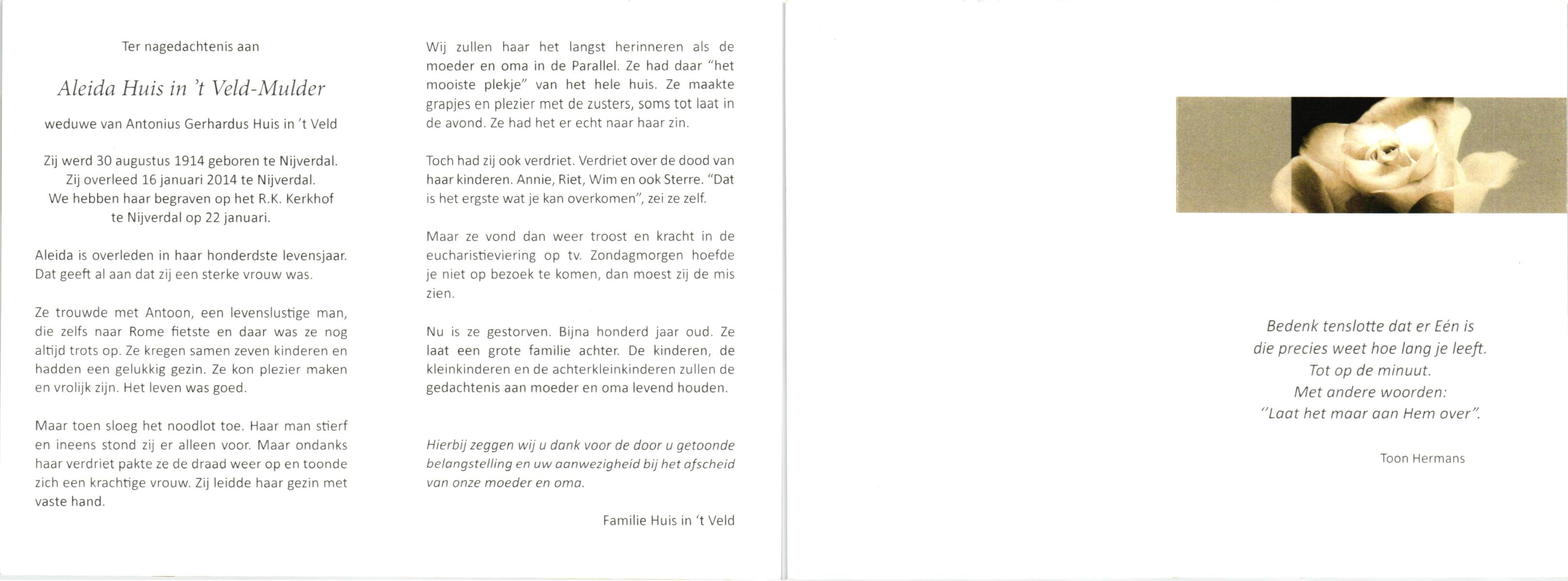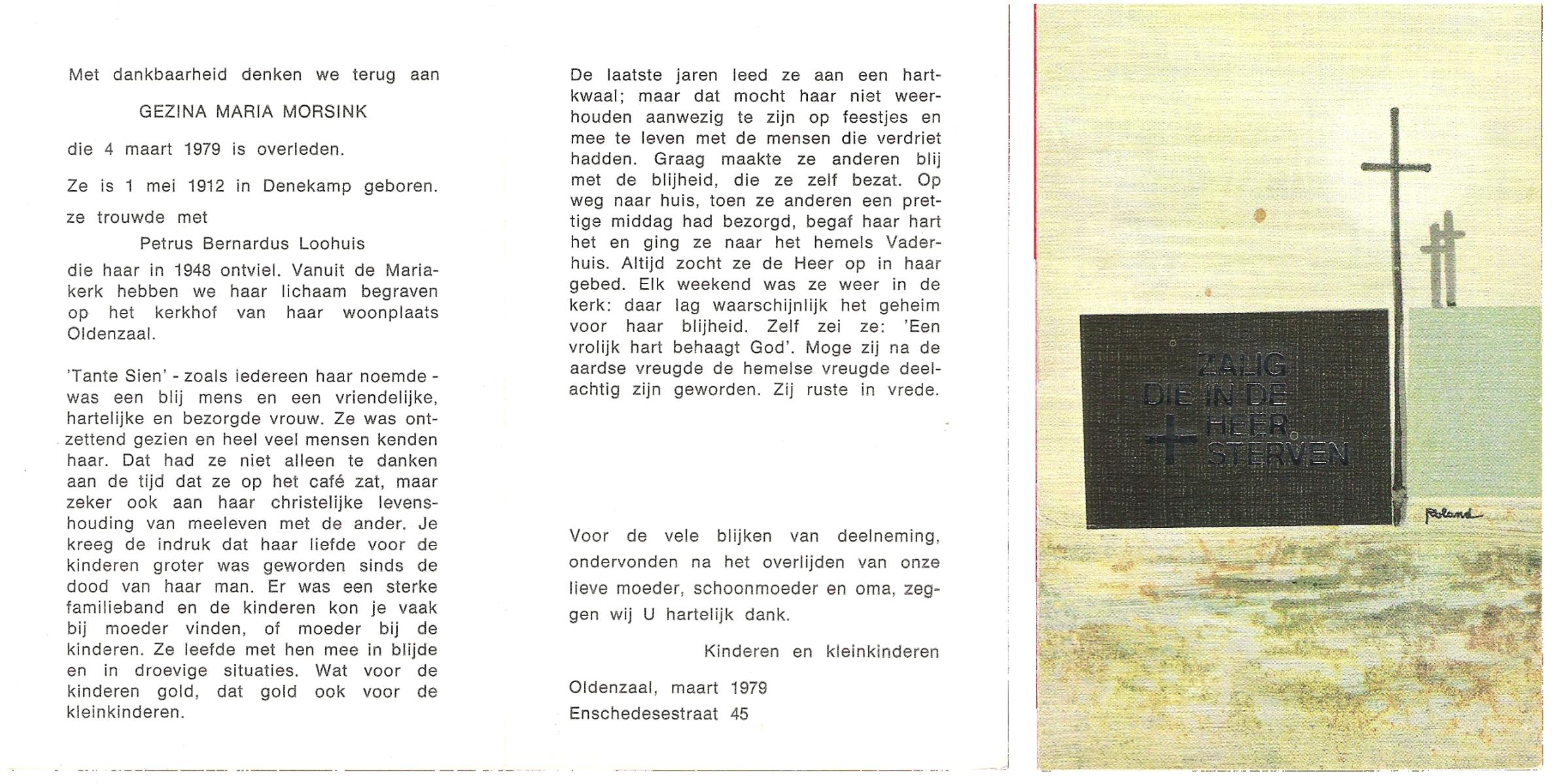 MULDERS, Gerritdina Aleida, geboren op 08-01-1894 te Tubbergen, overleden op 28-3-1981 te Denekamp op 87-jarige leeftijd, begraven op 1-4-1981 te Denekamp.