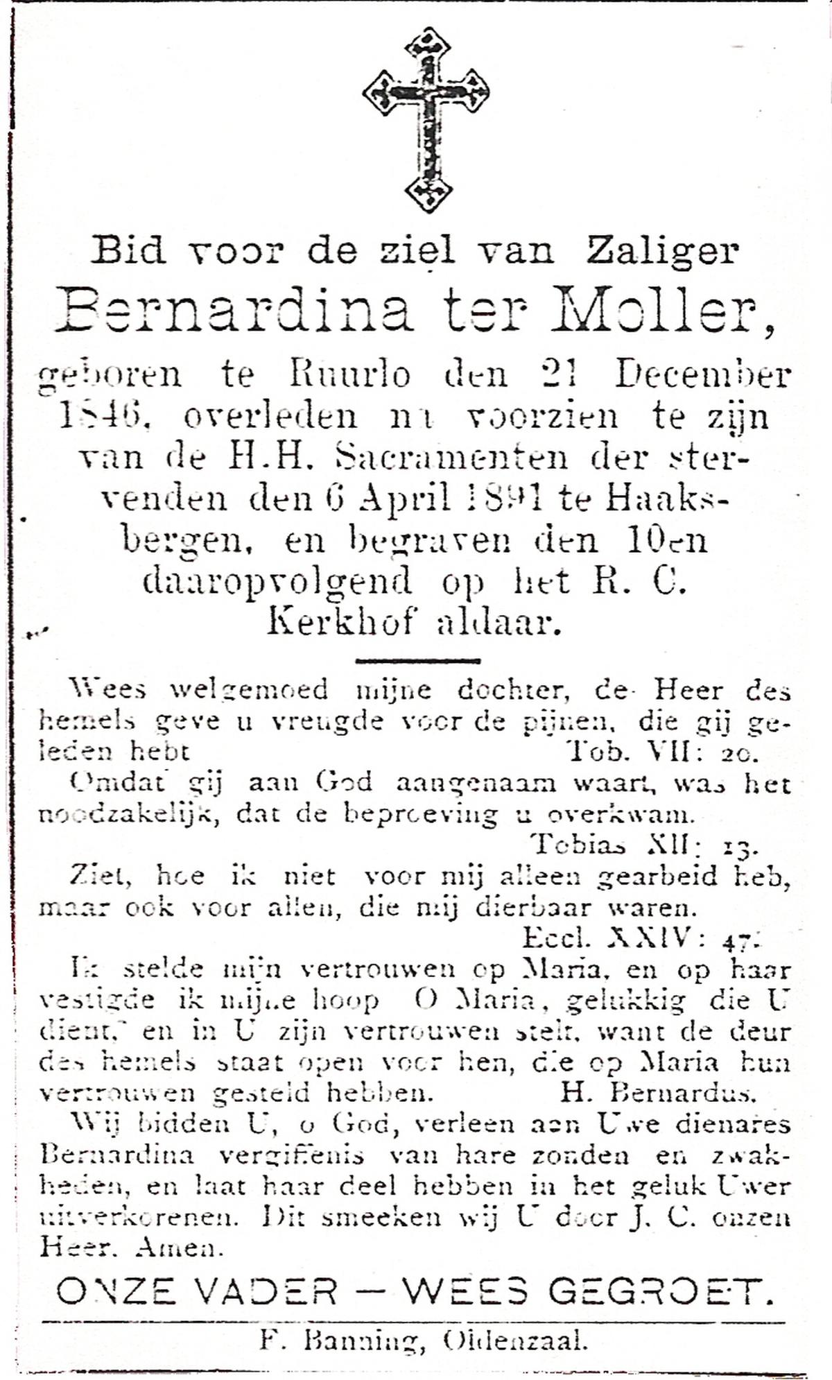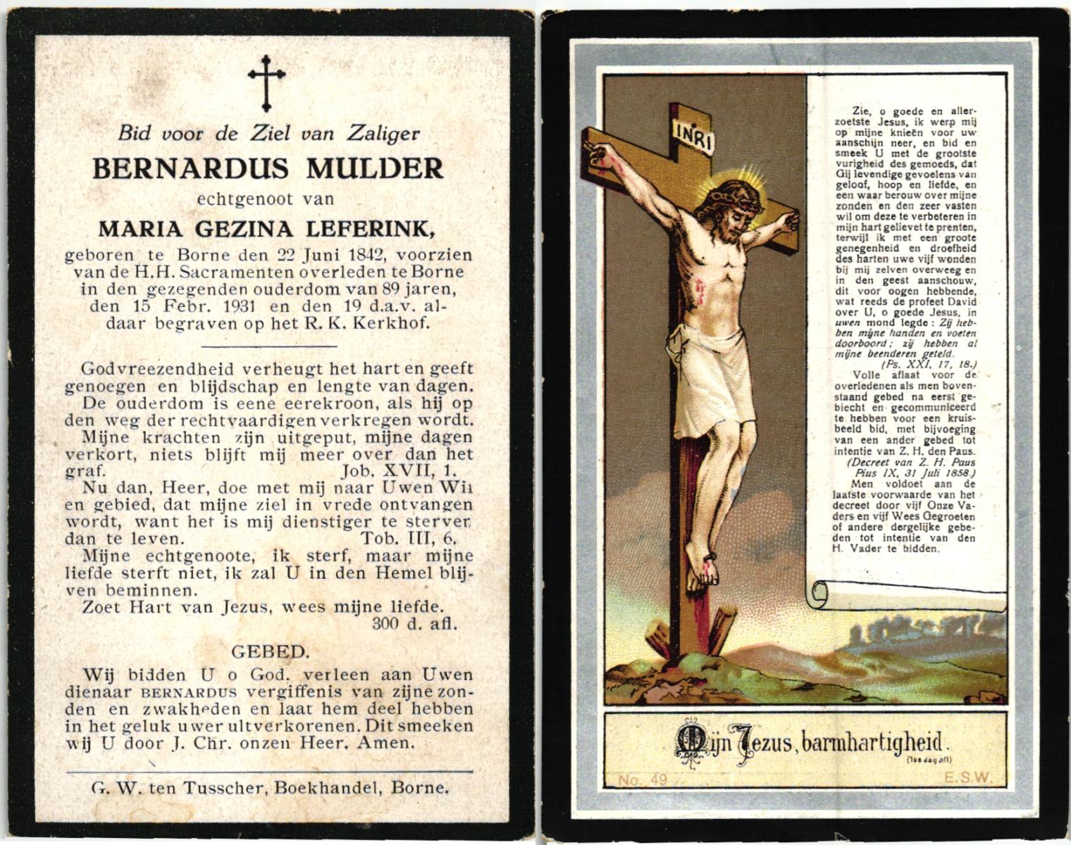 MULDER, , Bernardus, geboren op 22-06-1842 te Borne, overleden op 15-2-1931 te Borne op 89-jarige leeftijd, begraven op 19-2-1931 te Borne.