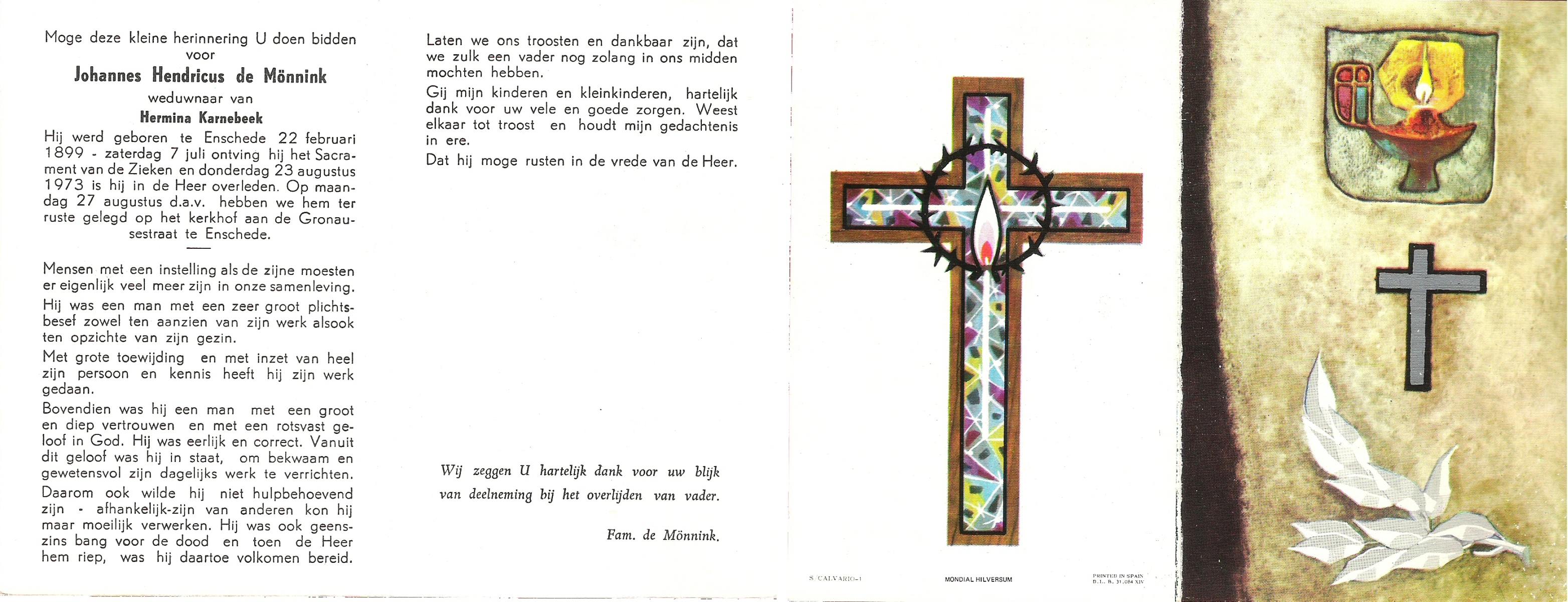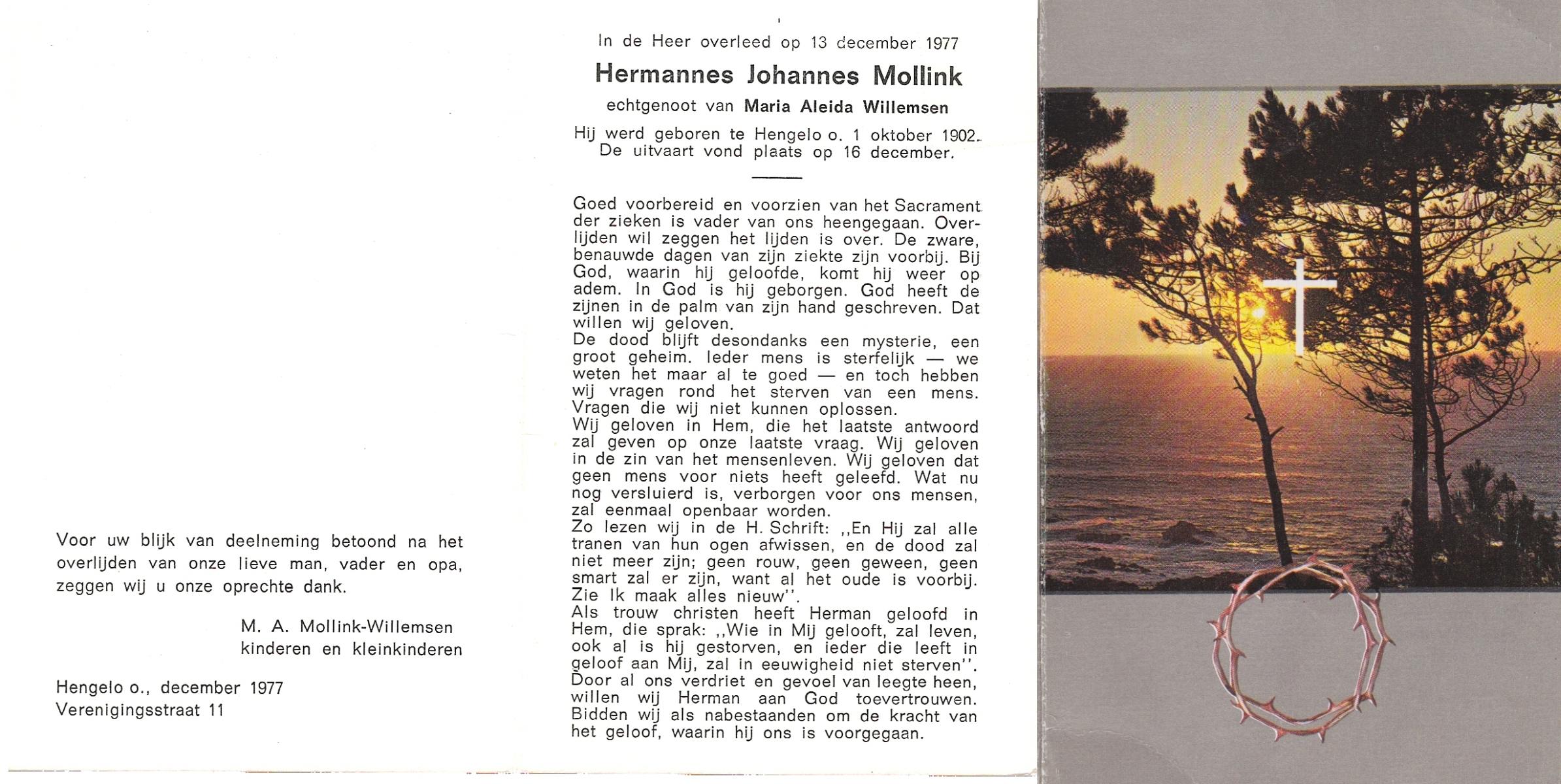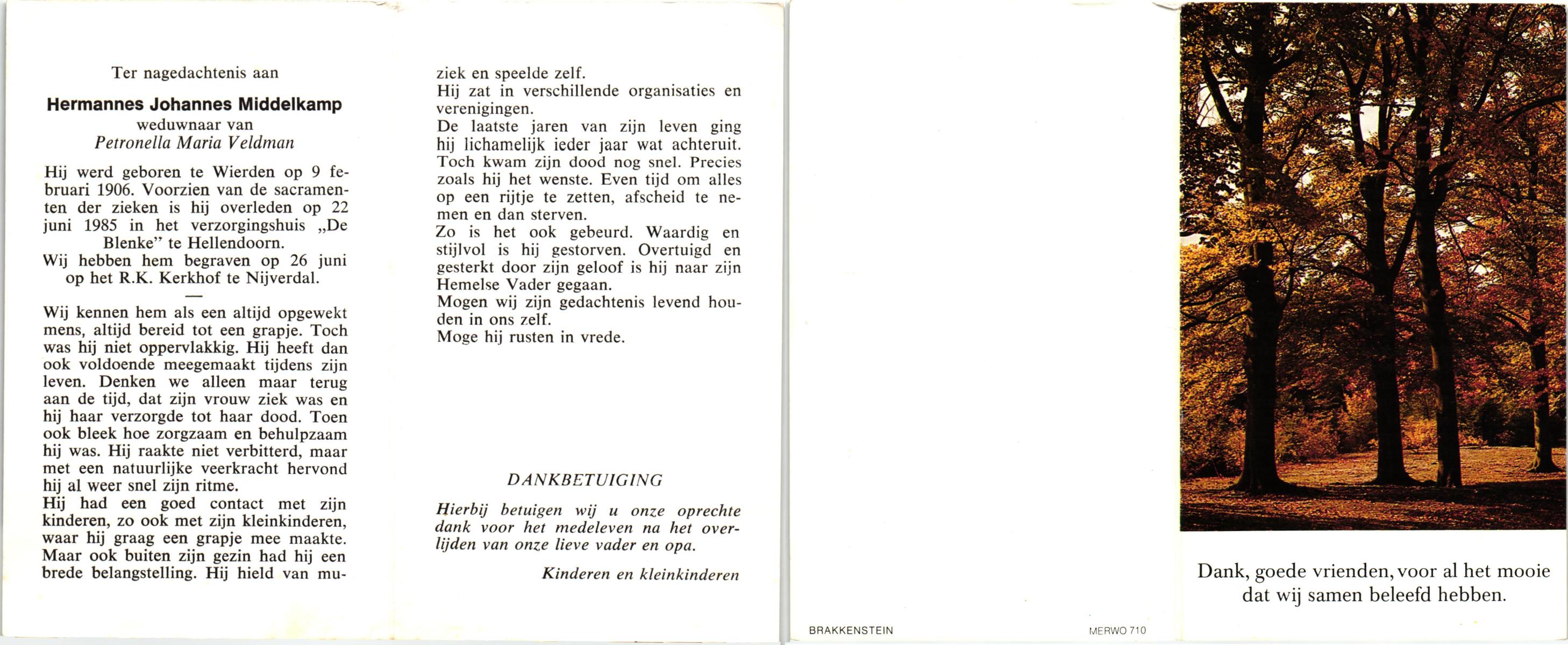 MIDDELKAMP, Hermannes Johannes, geboren op 9-2-1906 te Wierden, overleden op 22-6-1985 te Hellendoorn, Blenke op 79-jarige leeftijd, begraven op 26-6-1985 te Hellendoorn, Nijverdal, rk.