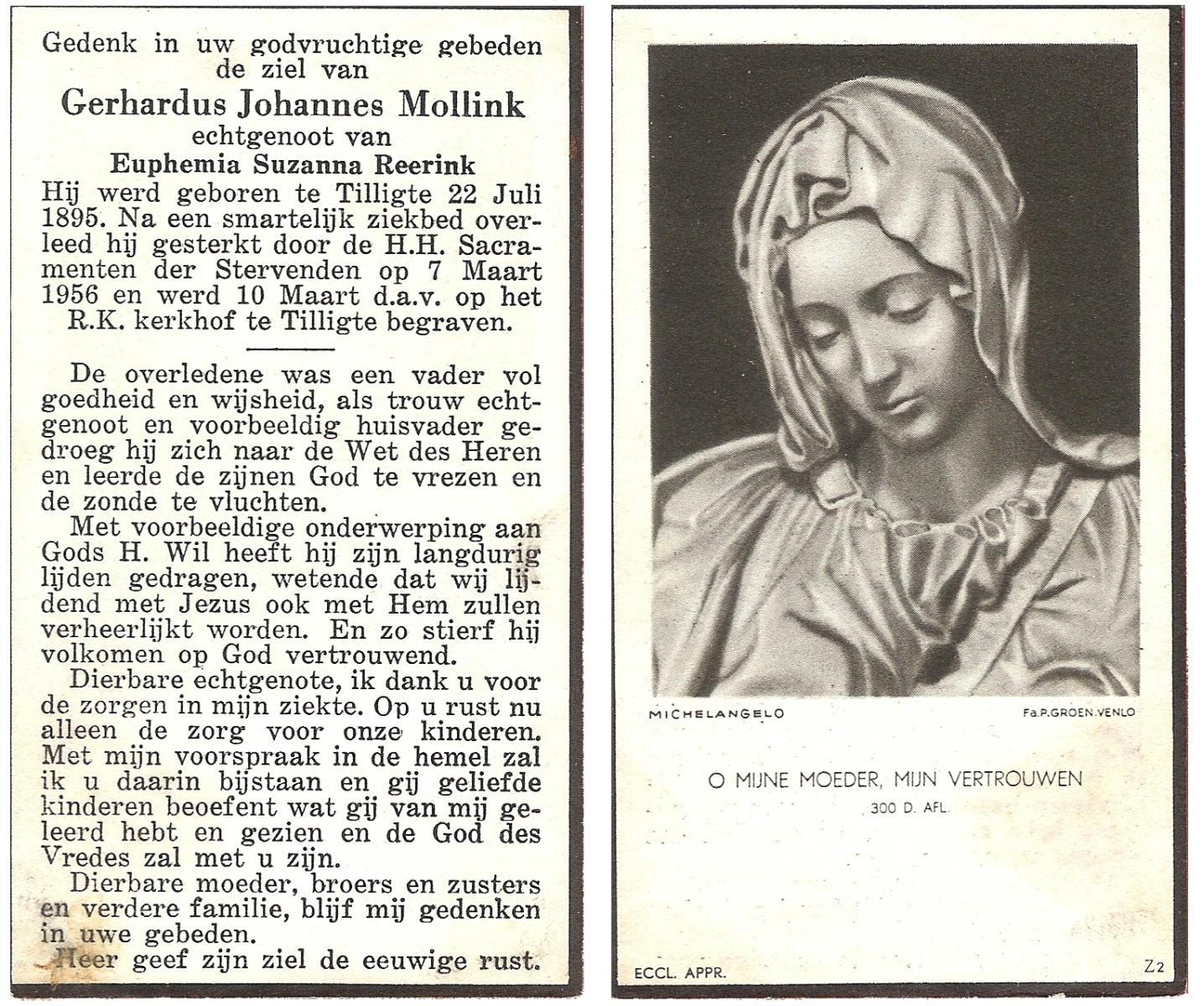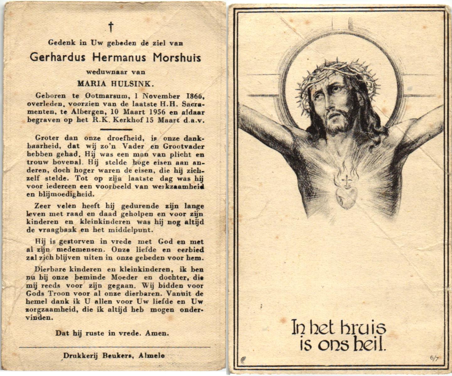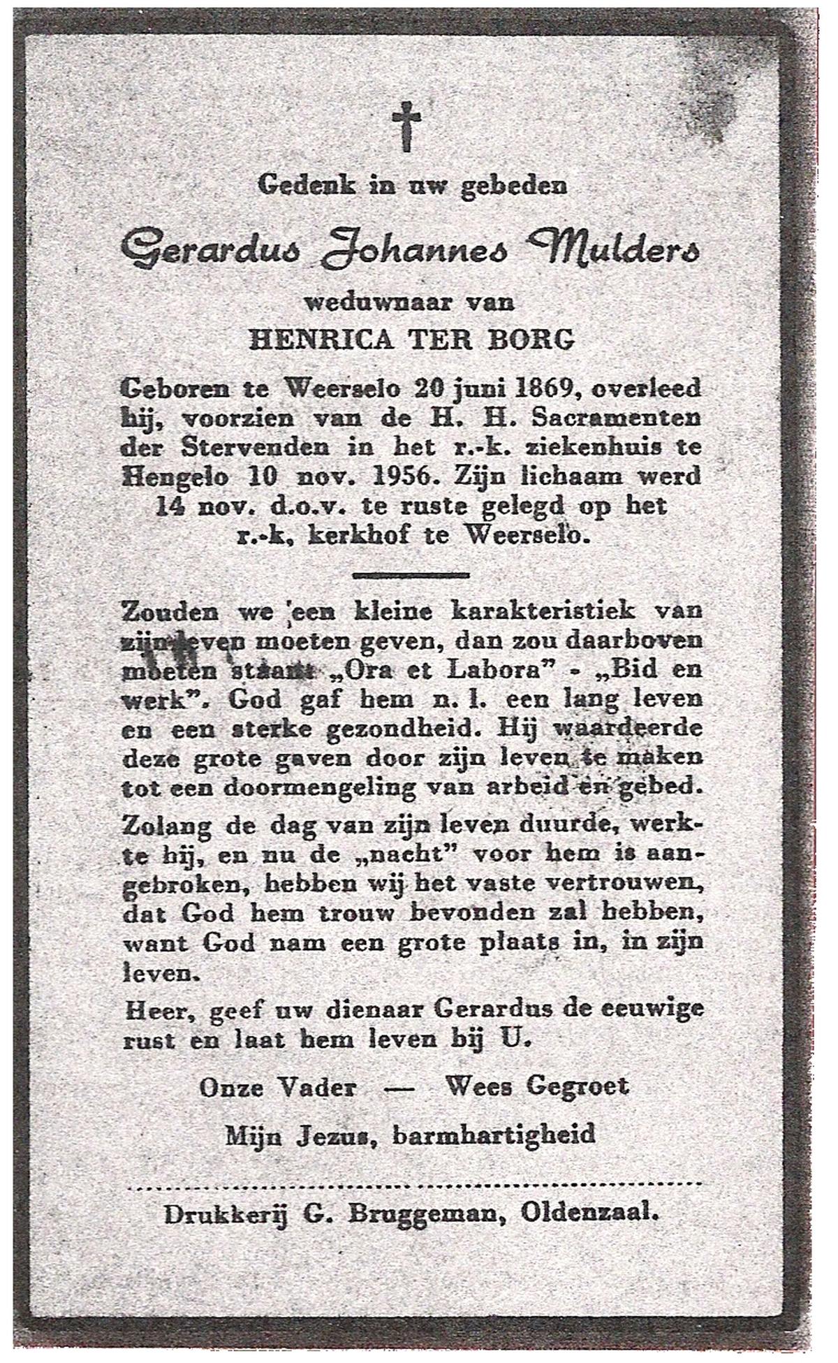 MULDERS, Gerardus Johannes, geboren op 20-06-1869 te Weerselo, overleden op 10-11-1956 te Hengelo (Ov.) op 87-jarige leeftijd, begraven op 14-11-1956 te Weerselo.