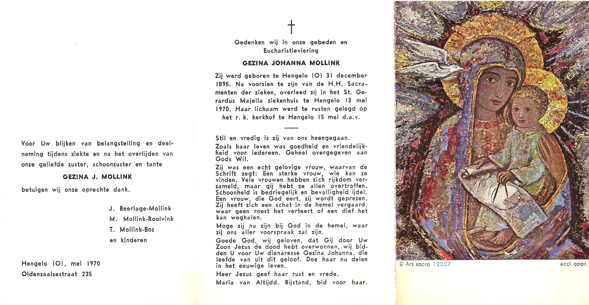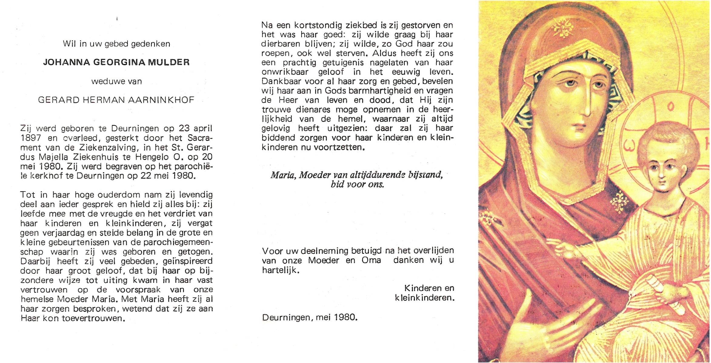 MULDER, Johanna Georgina, geboren op 23-04-1897 te Deurningen, overleden op 20-5-1980 te Hengelo (Ov.) op 83-jarige leeftijd, begraven op 22-5-1980 te Deurningen.