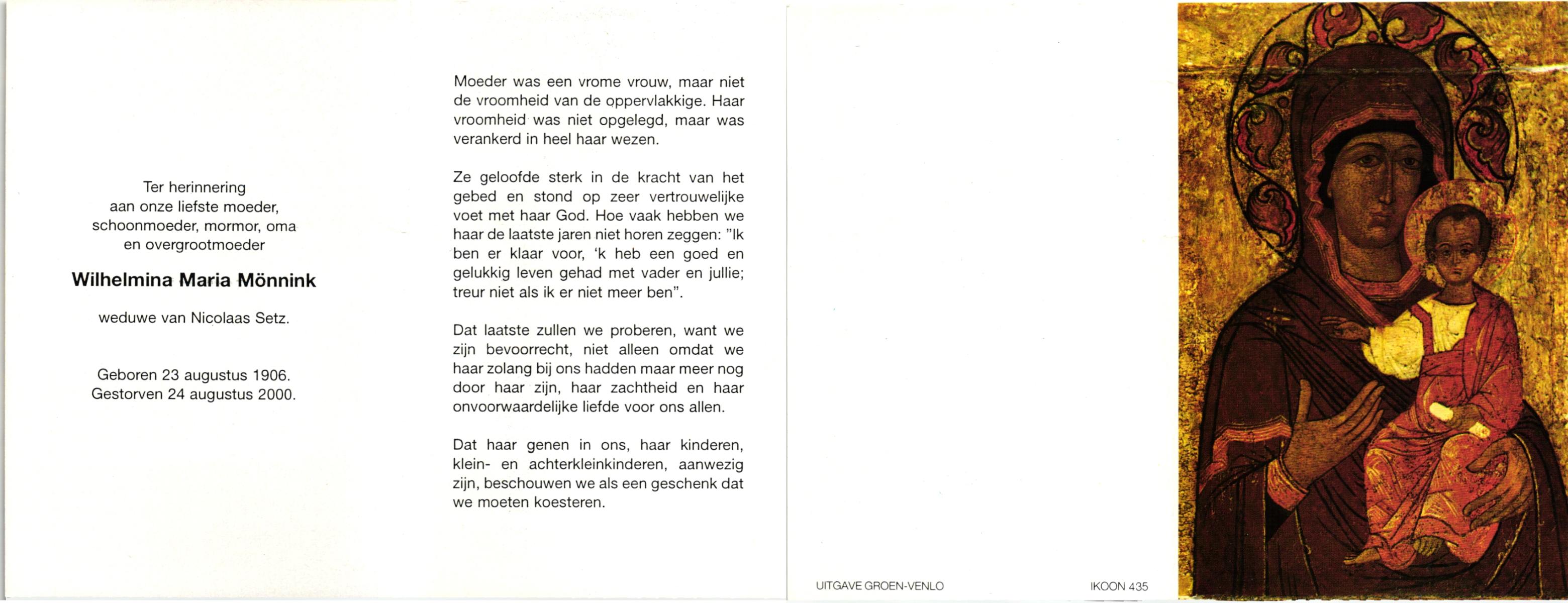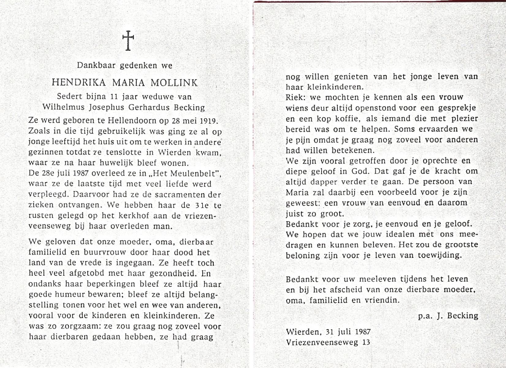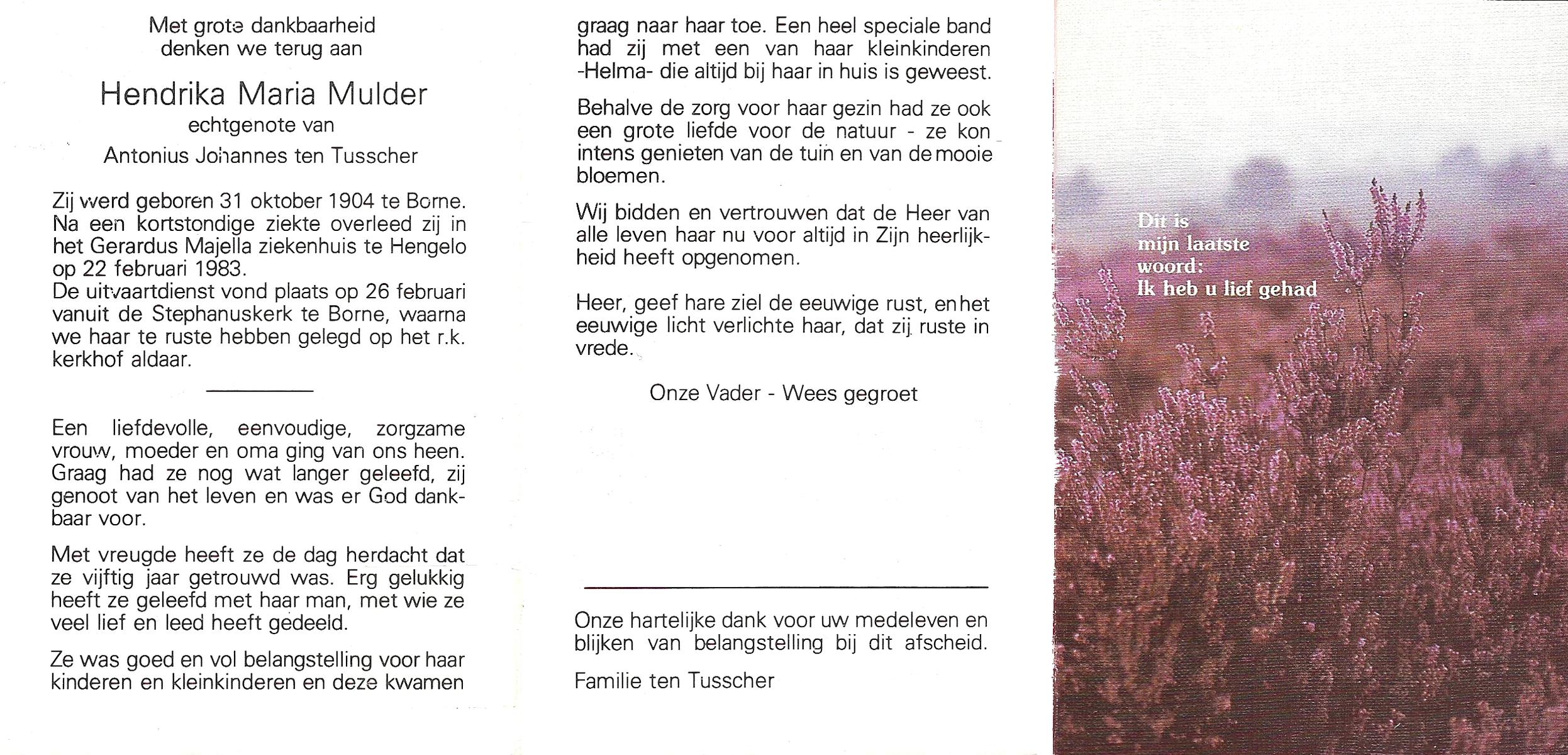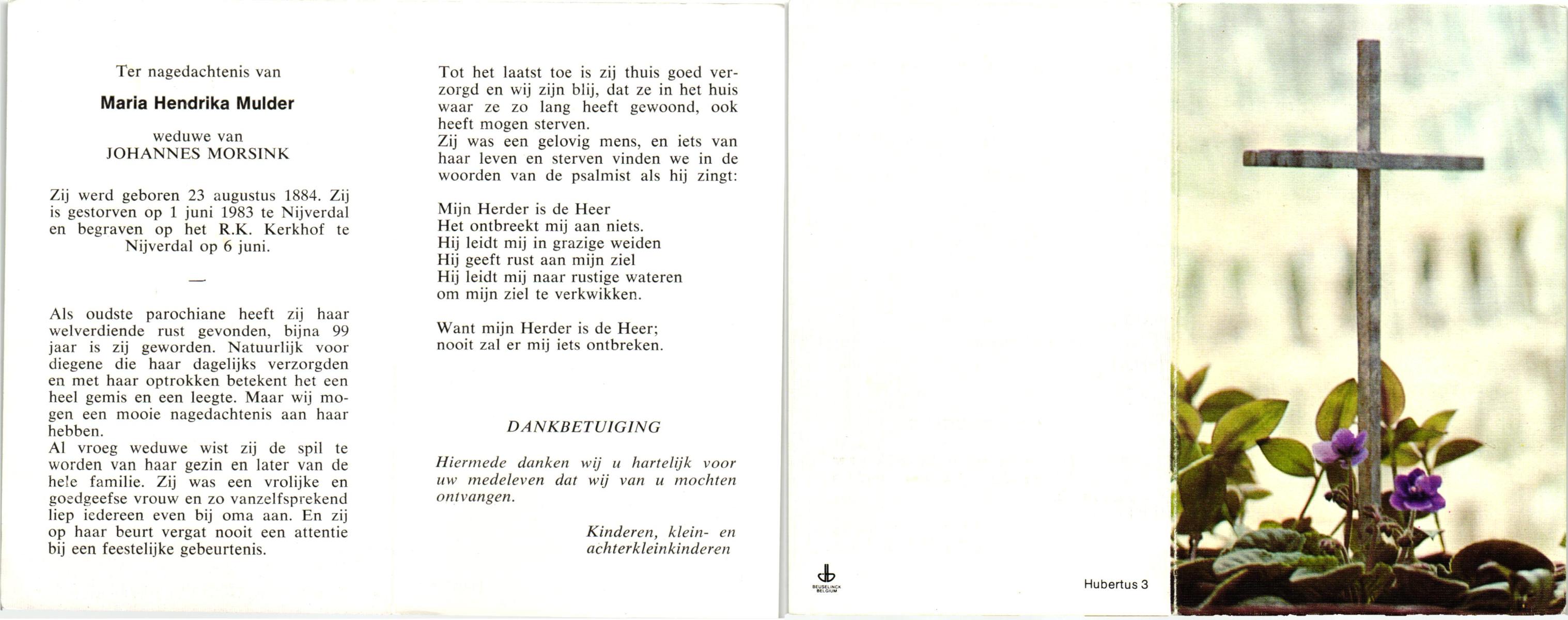MULDER, Maria Hendrika, geboren op 23-08-1884, overleden op 1-6-1983 te Hellendoorn, Nijverdal op 98-jarige leeftijd, begraven op 6-6-1983 te Hellendoorn, Nijverdal, rk.