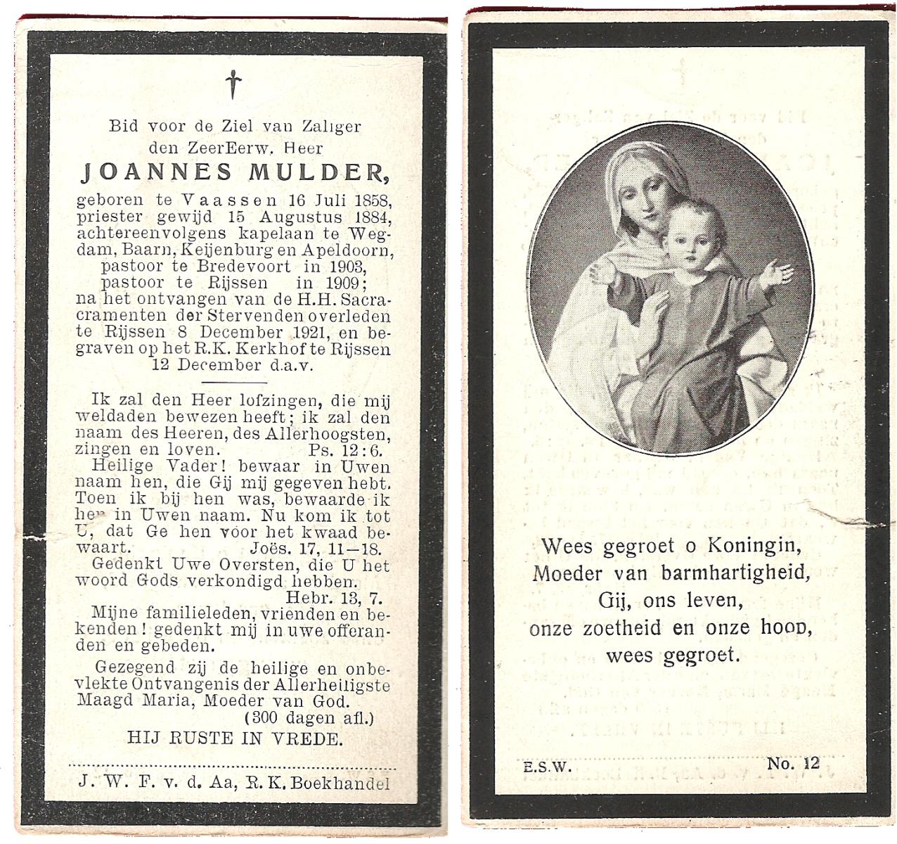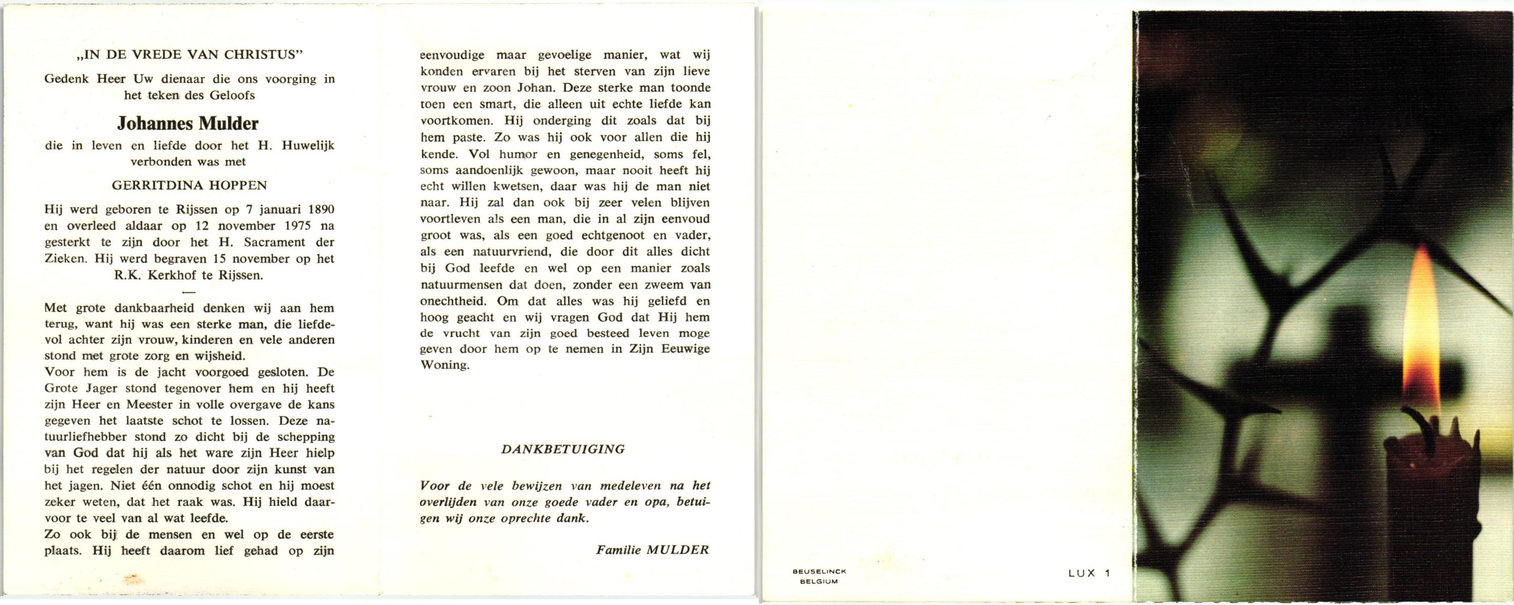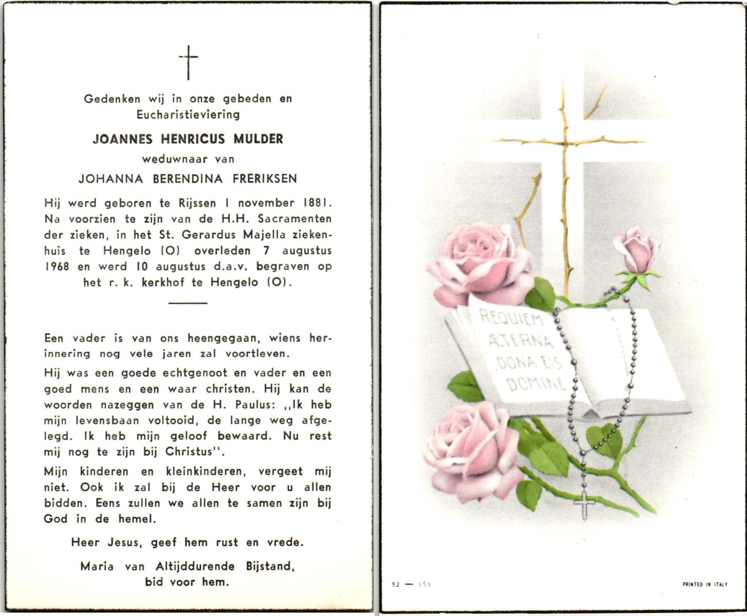 MULDER, Johannes, geboren op 07-01-1890 te Rijssen, overleden op 12-11-1975 te Rijssen op 85-jarige leeftijd, begraven op 15-11-1975 te Rijssen, rk.