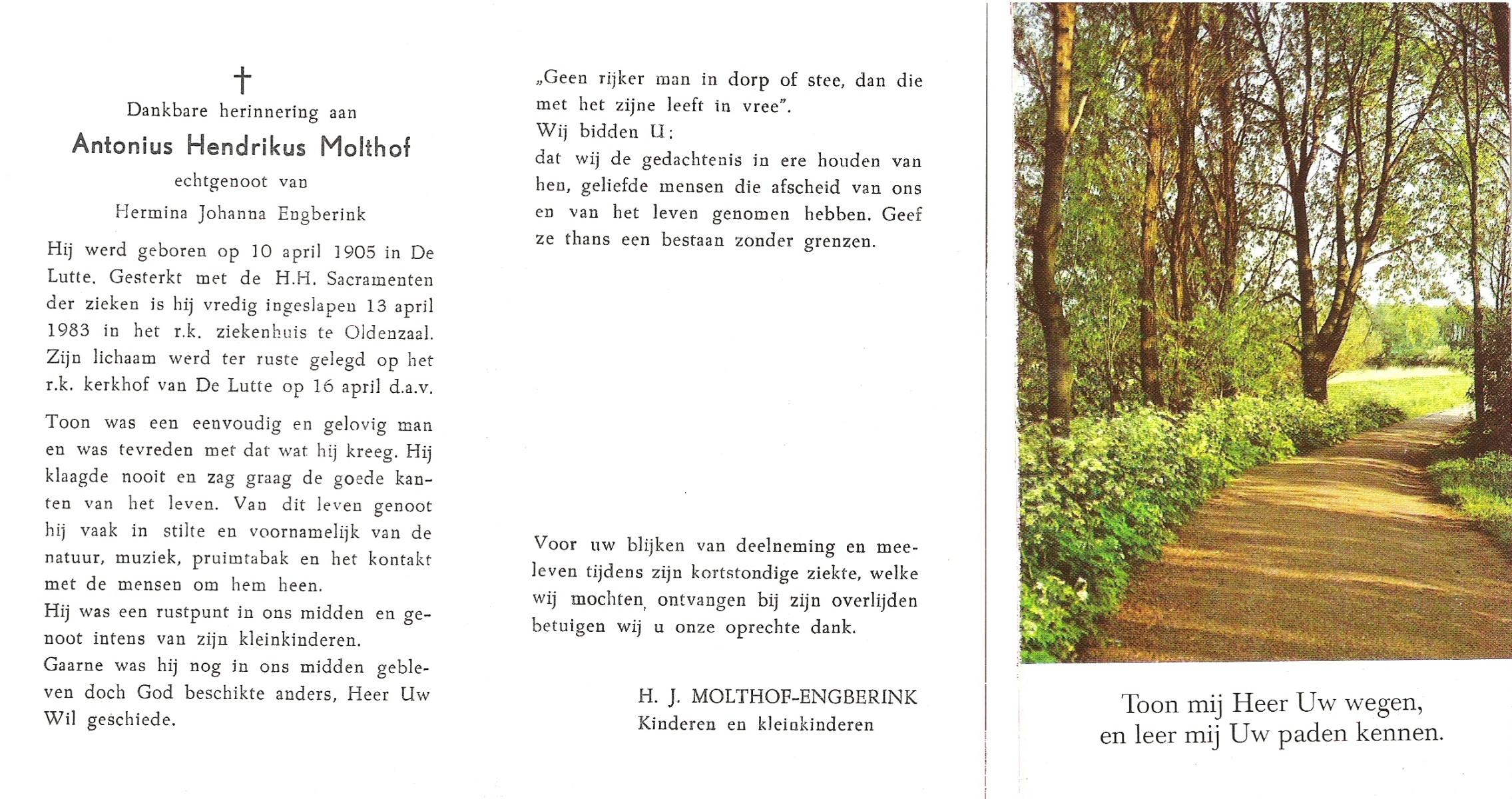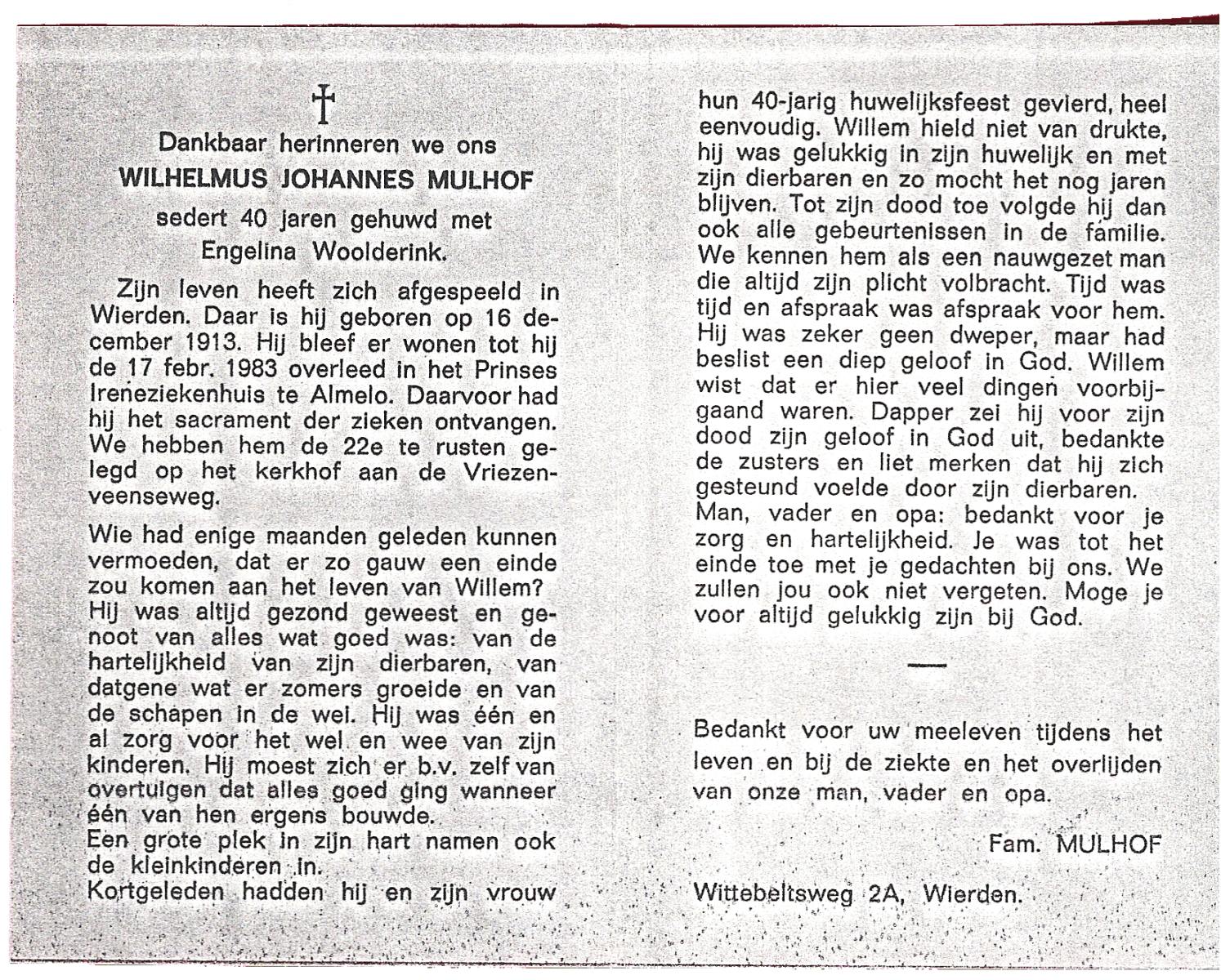 MULHOF, Wilhelmus Johannes, geboren op 16-12-1913 te Wierden, overleden op 17-2-1983 te Almelo op 79-jarige leeftijd, begraven op 22-2-1983 te Wierden.