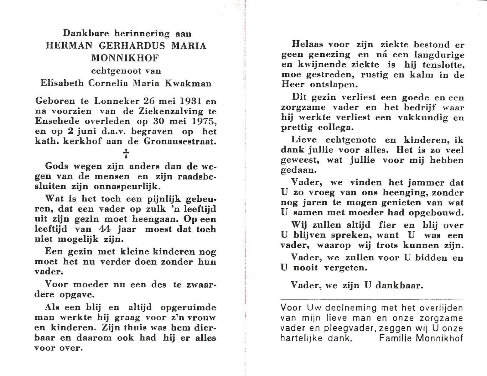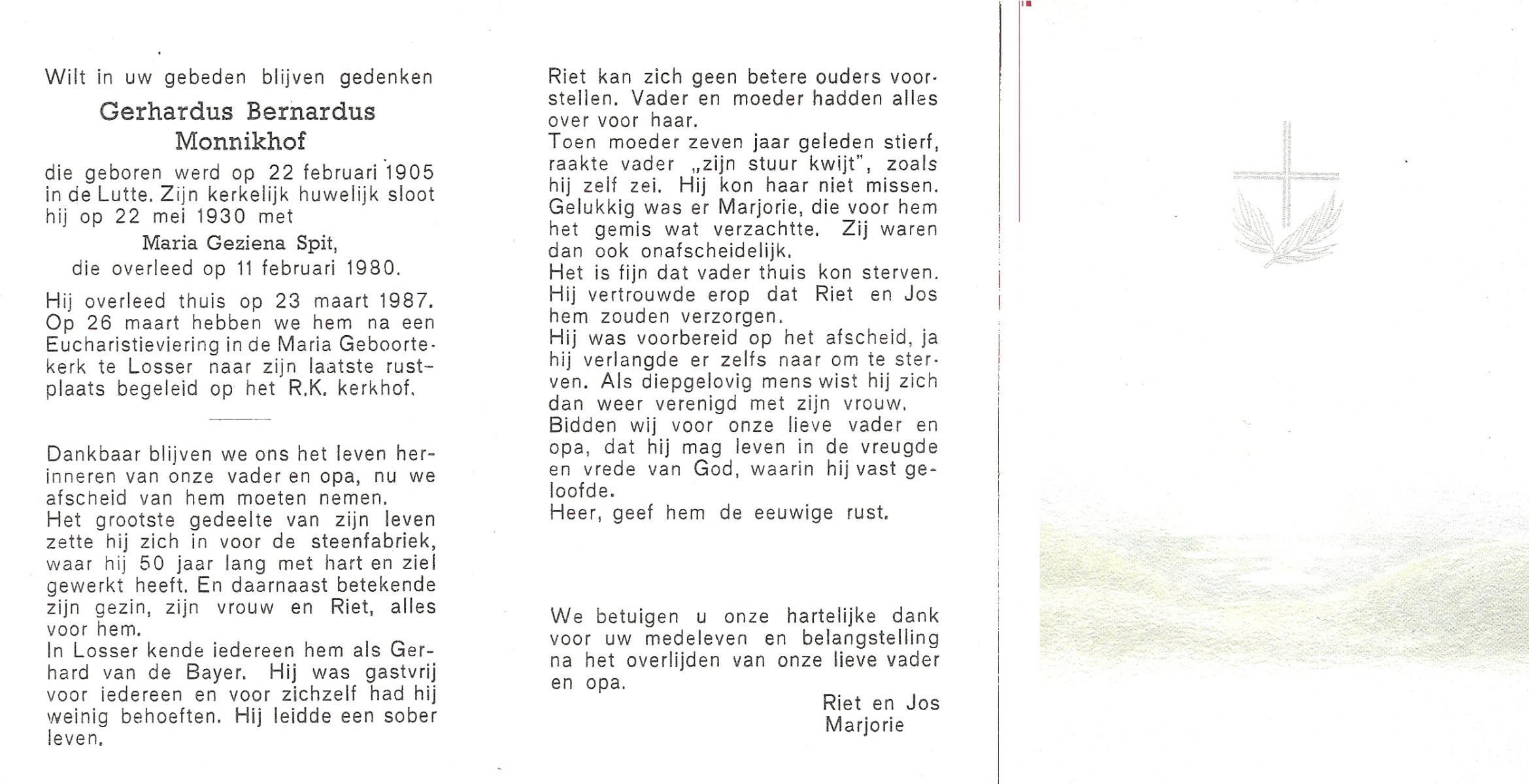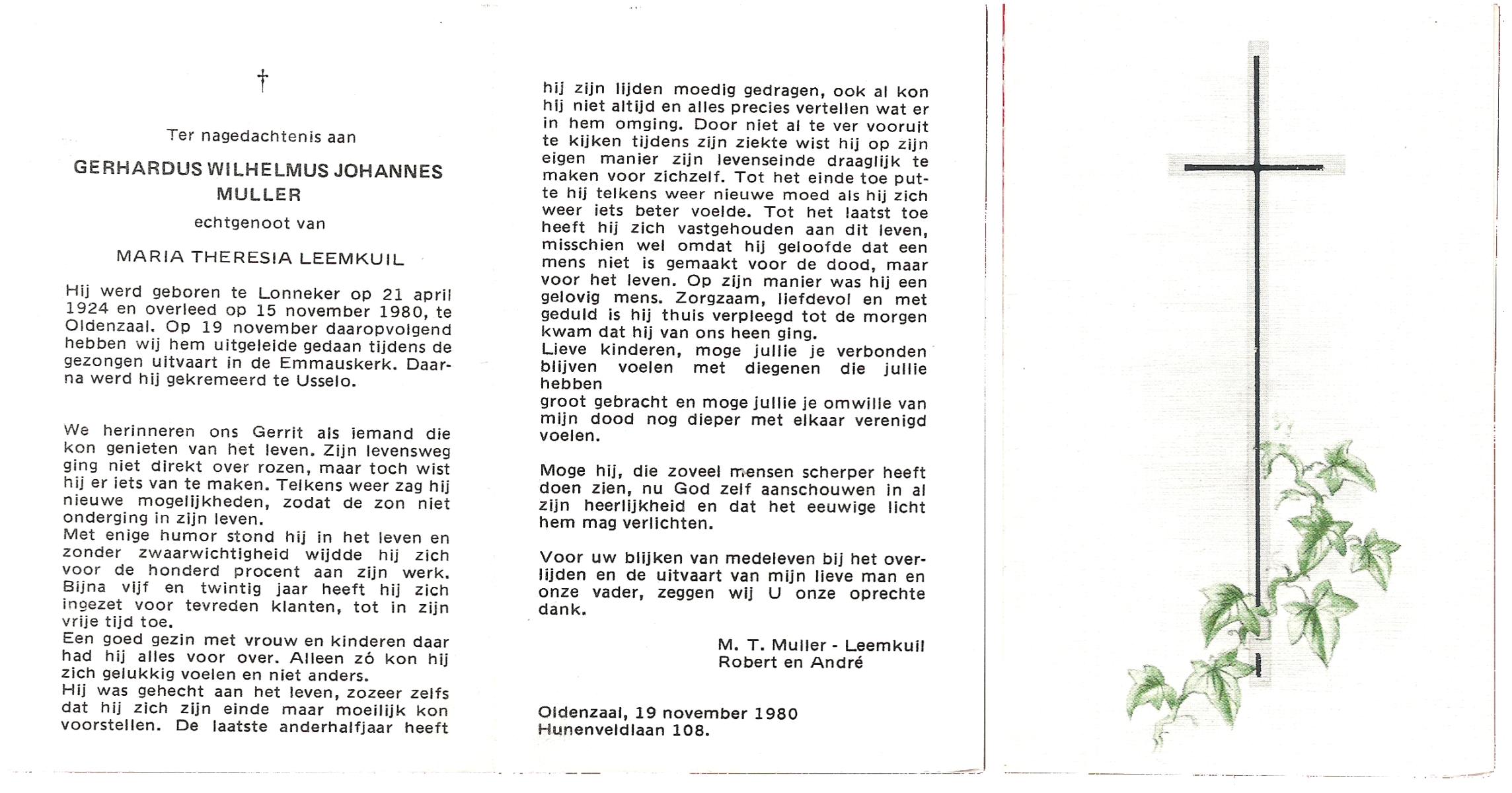 MULLER, Gerhardus Wilhelmus Johannes, geboren op 21-4-1924 te Lonneker, overleden op 15-11-1980 te Oldenzaal op 56-jarige leeftijd, gecremeerd op 19-11-1980 te Usselo.